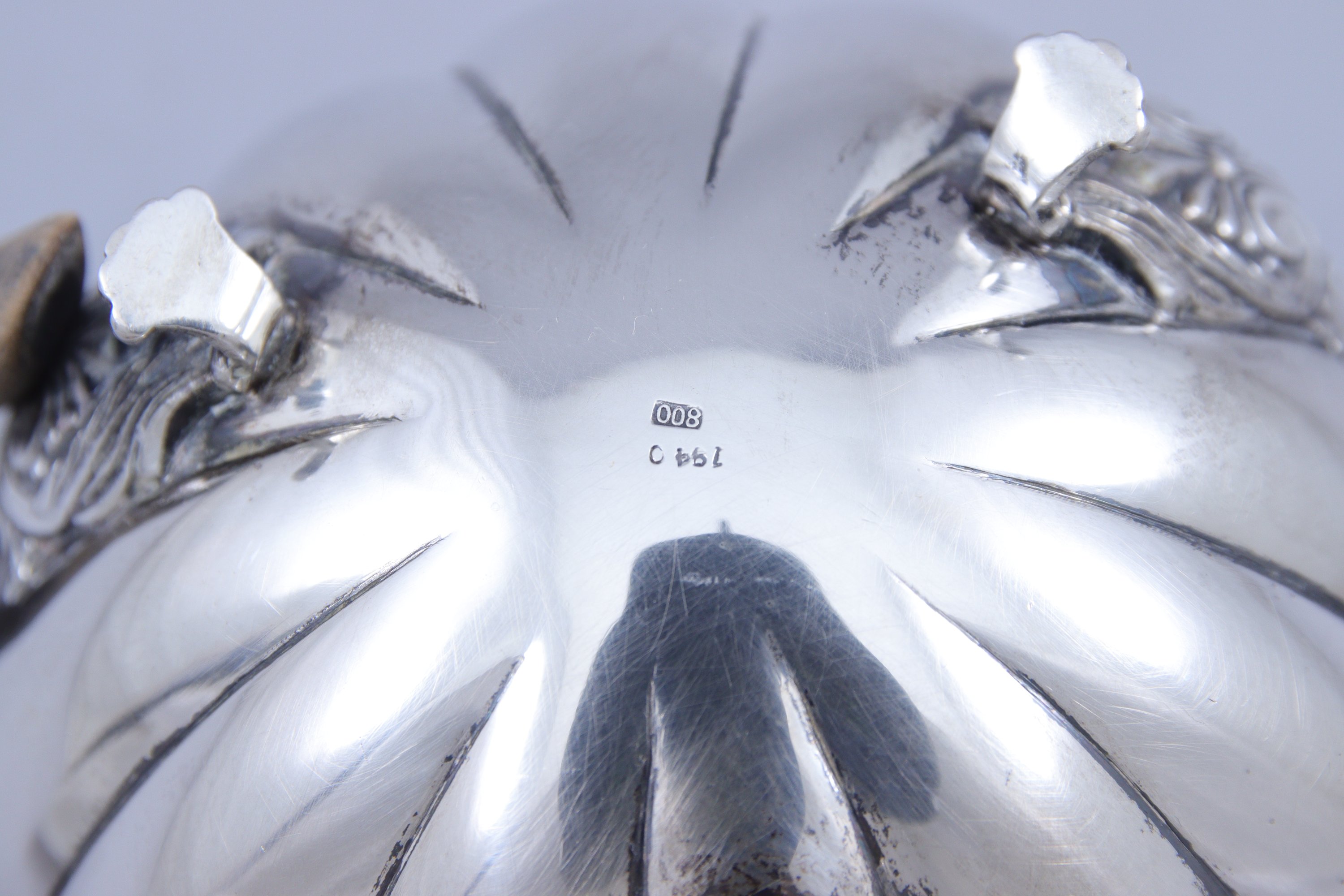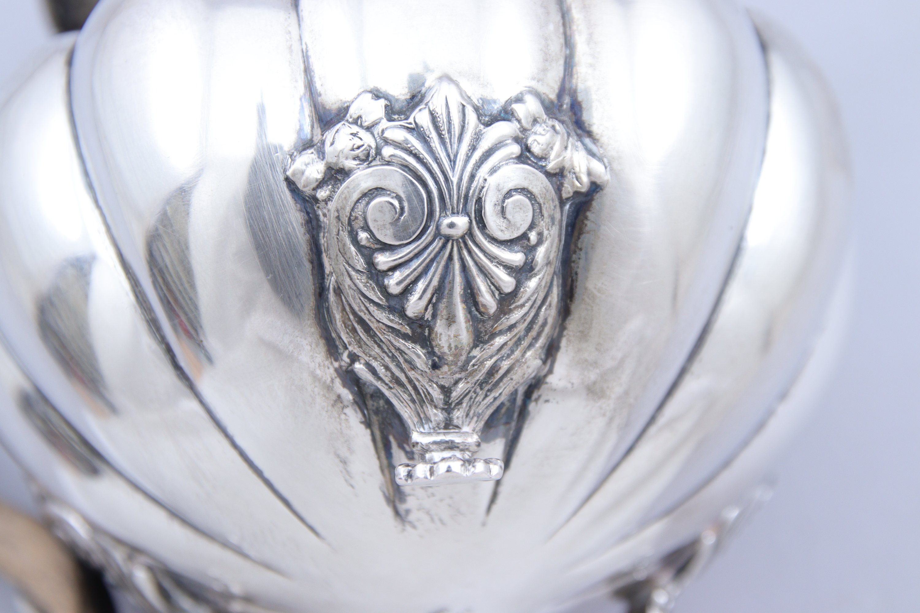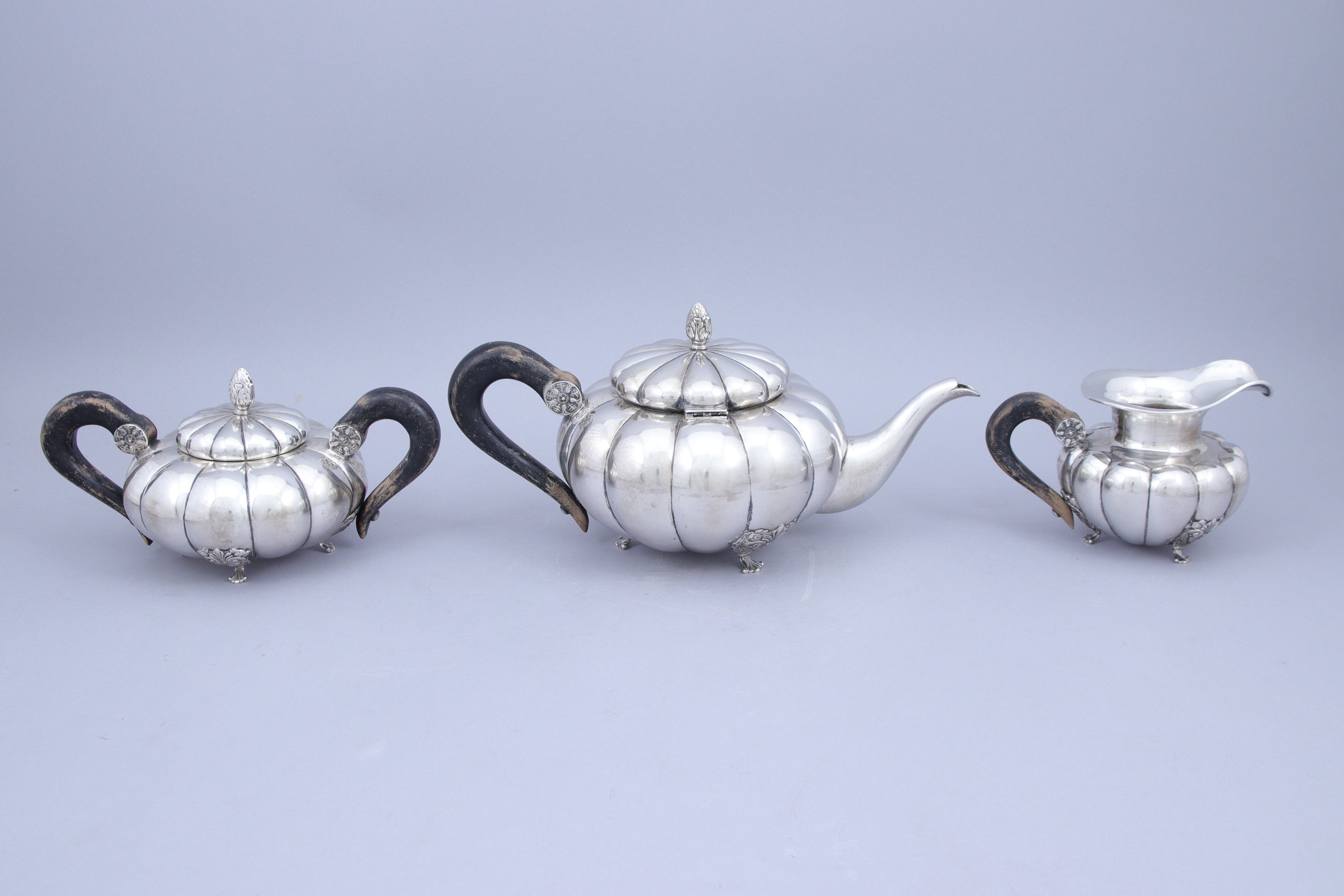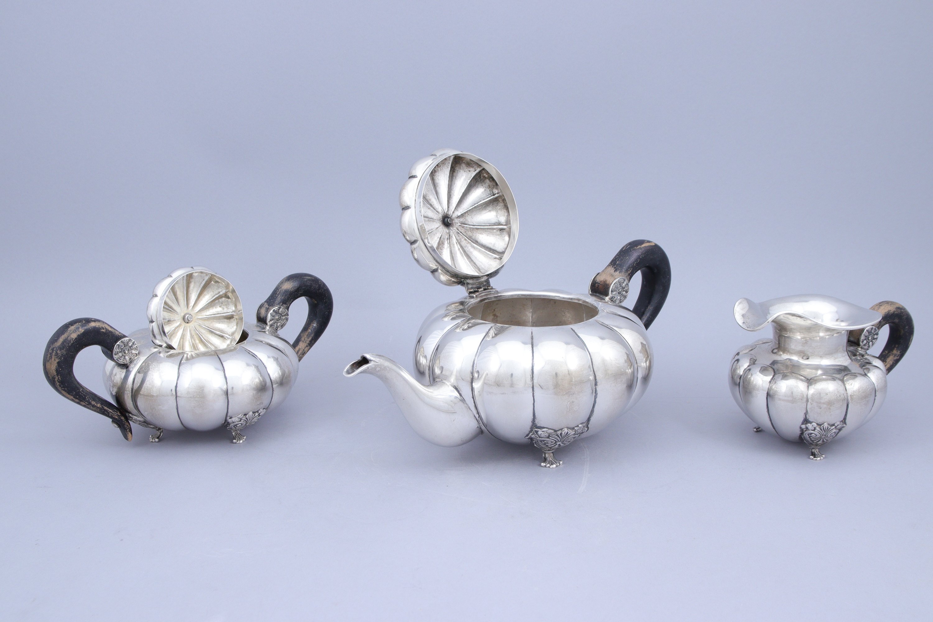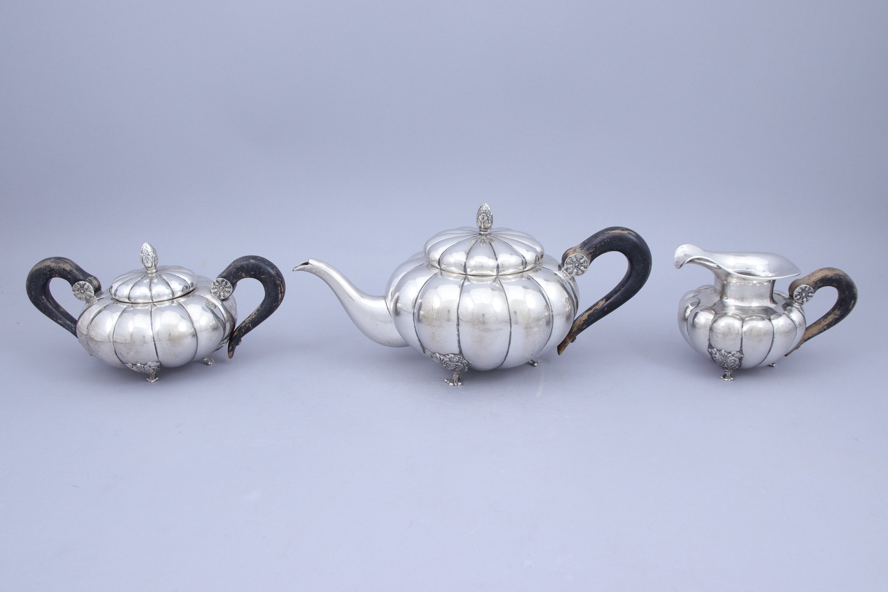 en argent 800 millièmes comprenant une théière, un pot à lait et un sucrier, chacun décoré d'importantes côtes. Fretel en forme de pomme de pin. Les pieds à enroulements et palmettes. Anses en bois teinté noir.