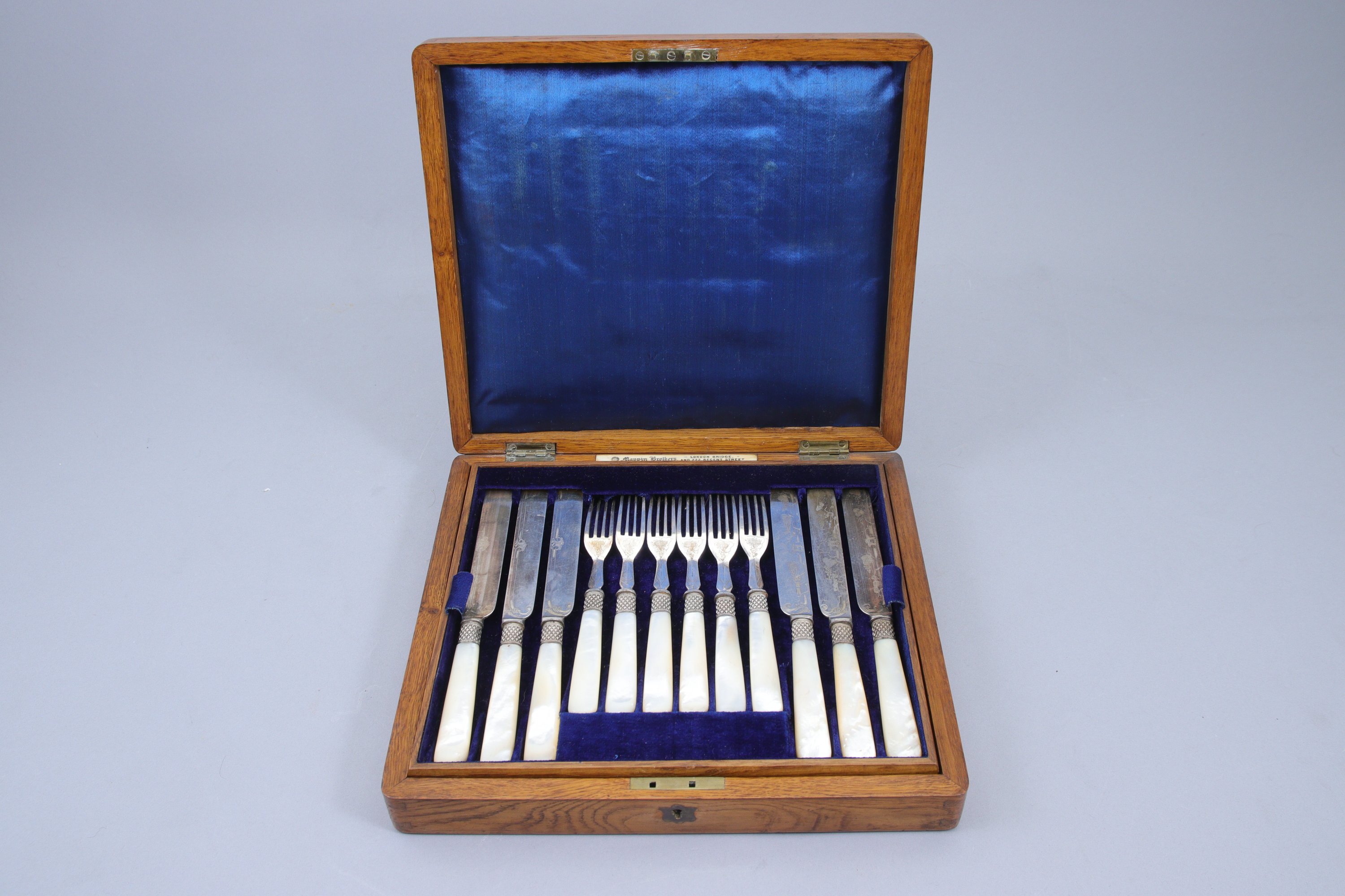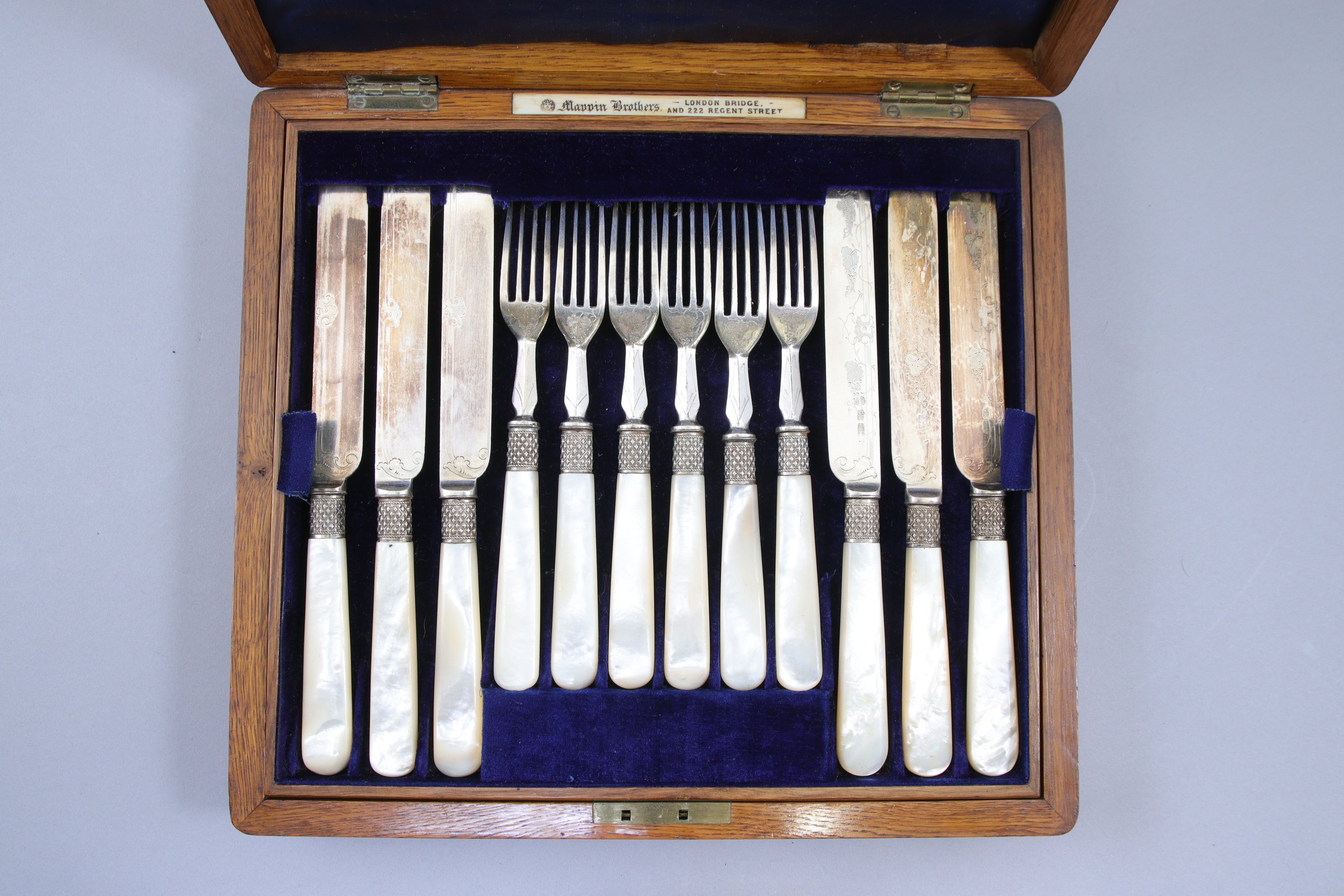 en métal argenté et manche en nacre. Les lames gravées de pampres de vigne, virolles en pointe de diamant.