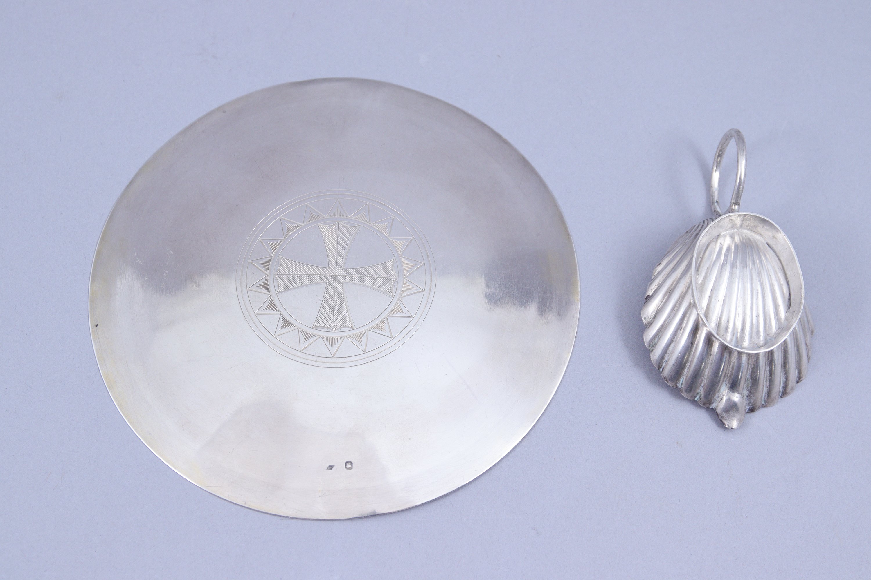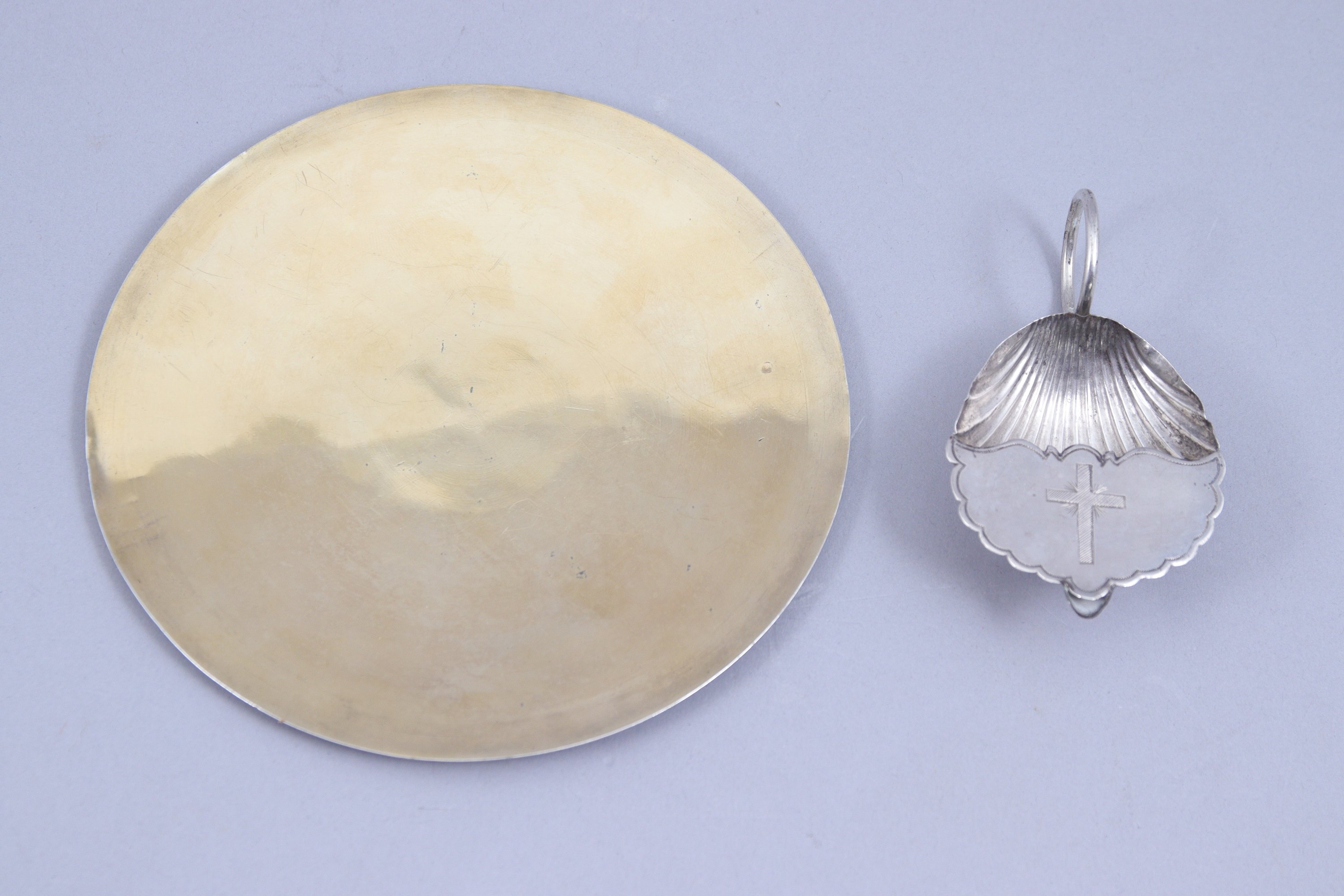 - Patène en argent et vermeil, le revers à décor d'une croix dans un entourage rayonnant. Poinçon Minerve. Orfèvre AJ à la jambe. Diam. 15,5 cm. Poids 100 g.