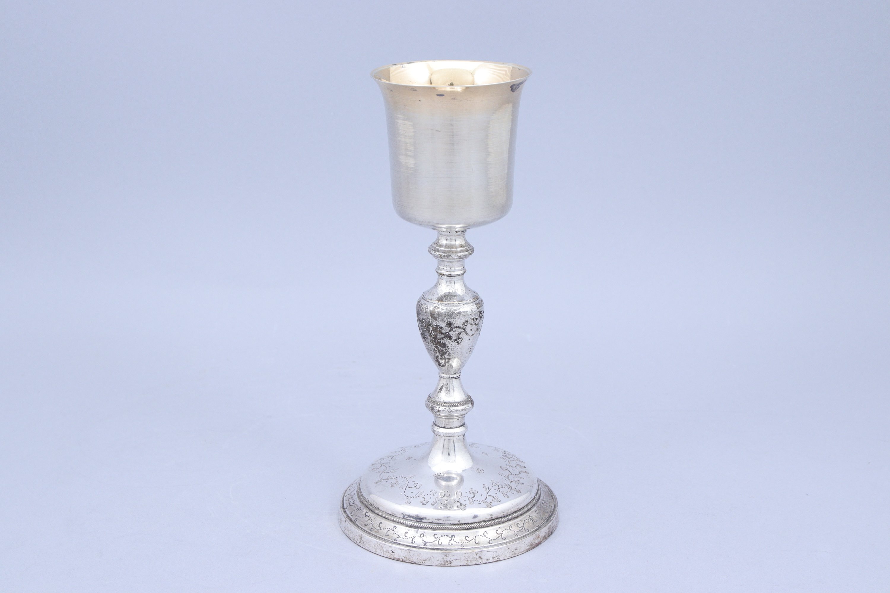 à coupe en argent et pied en bronze argenté. La coupe à la lèvre évasée gravée au revers "Saint Eloi", l'intérieur en vermeil. Elle repose sur un pied balustre se prolongeant par une base de forme circulaire à décor gravé de guirlandes végétales.