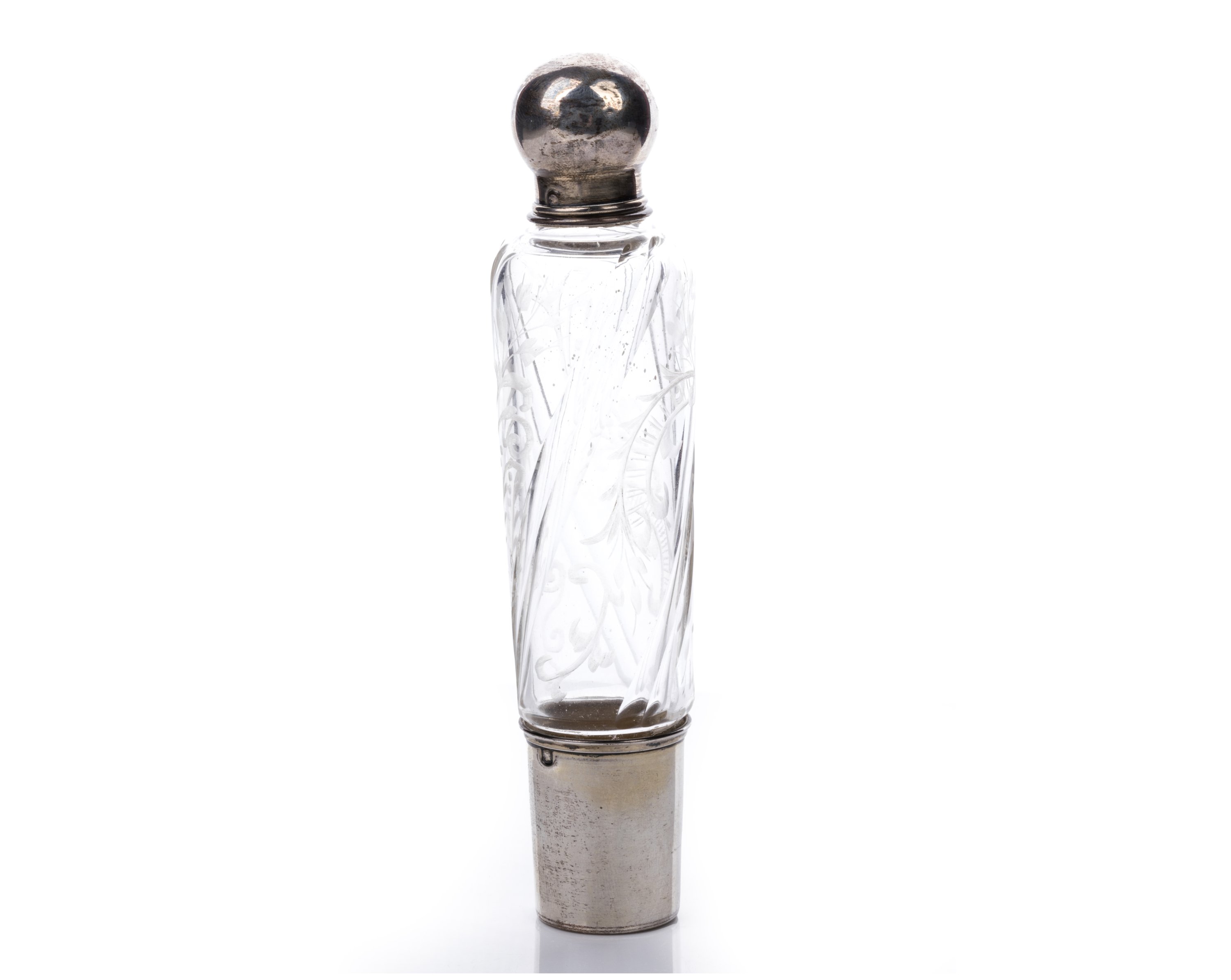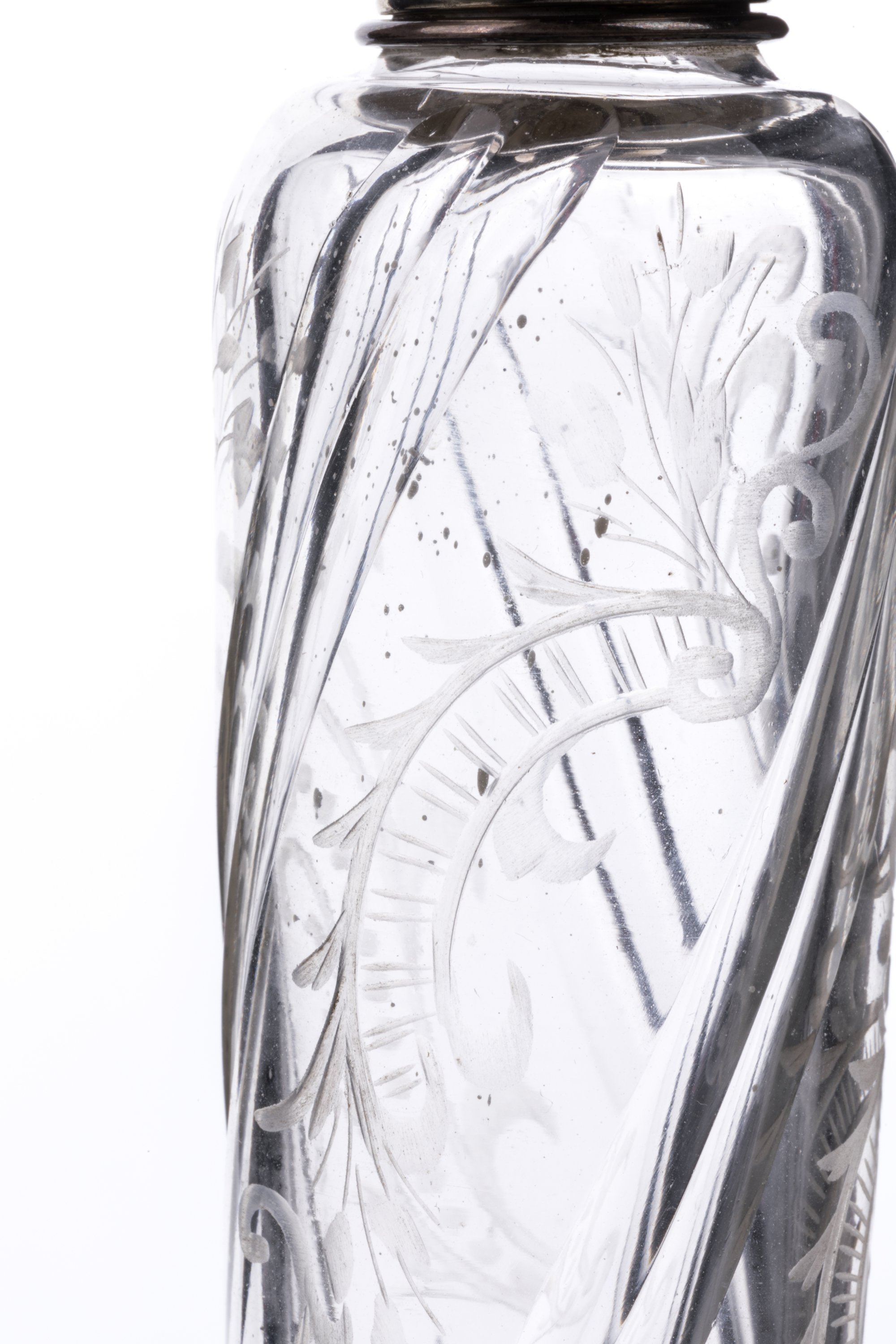 en cristal et monture en argent. Le bouchon en forme de boule, le corps gravé à décor torsadé en alternance de motifs rocaille.