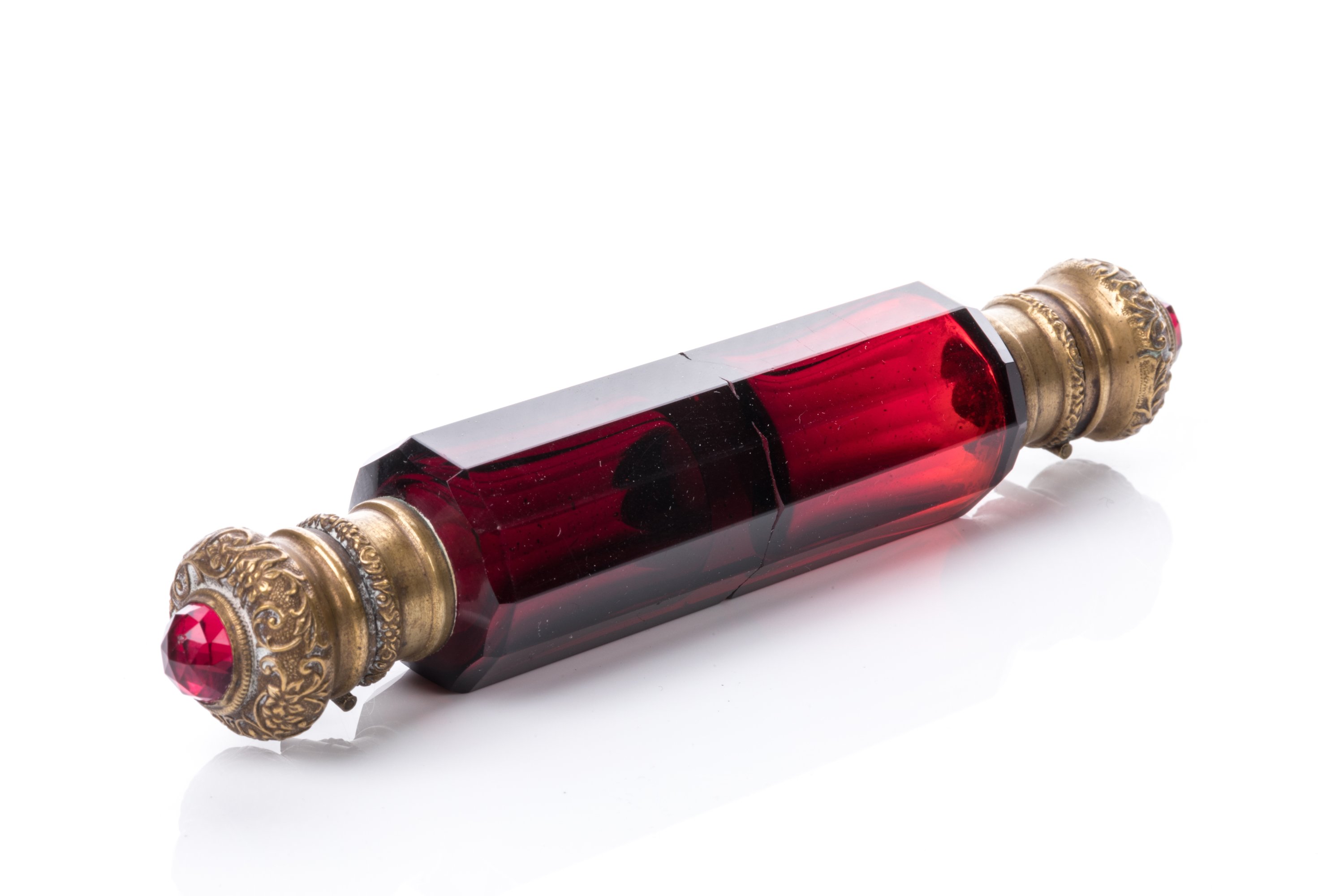 Joint : flacon à sel à double compartiment en verre teinté rouge et monture en métal doré à décor de rinceaux et cabochons. La panse à pans coupés. XIXe siècle. Haut. 13 cm. (fêle au centre)