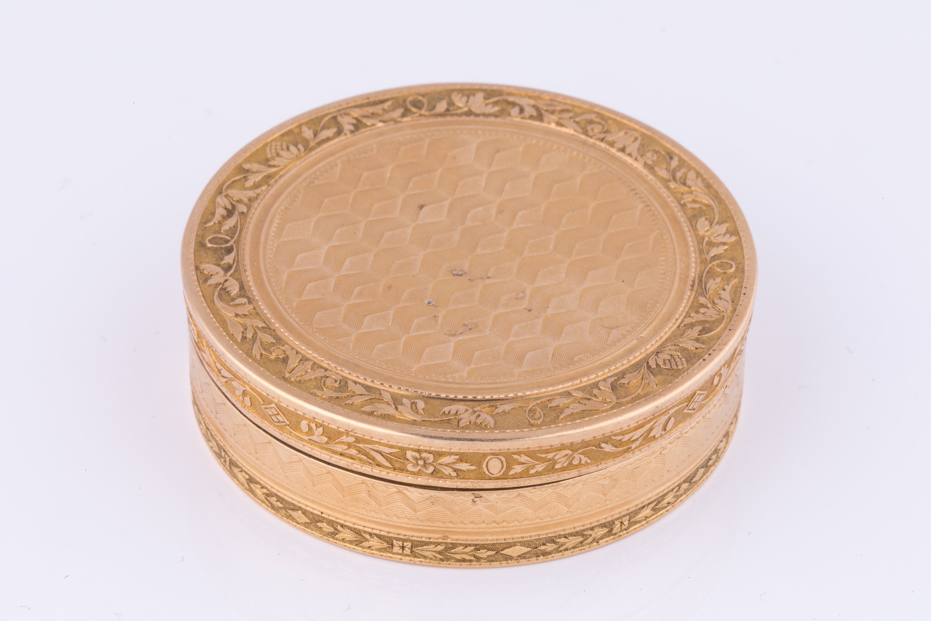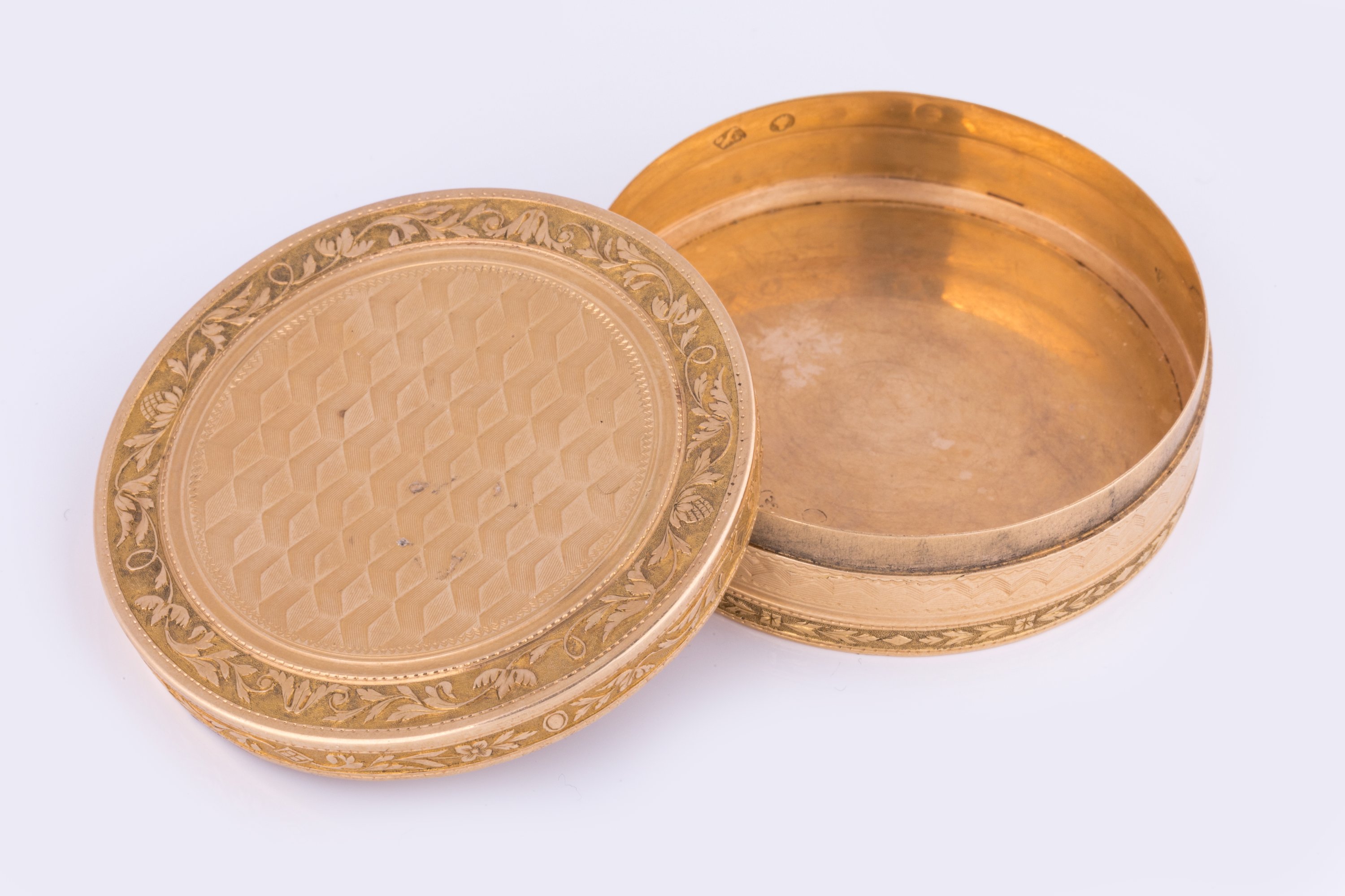 en or jaune 750 millièmes gravée et guillochée, ornée d'un frise de feuilles d'acanthe et pommes de pin entourant un décor de cubes sans fond.