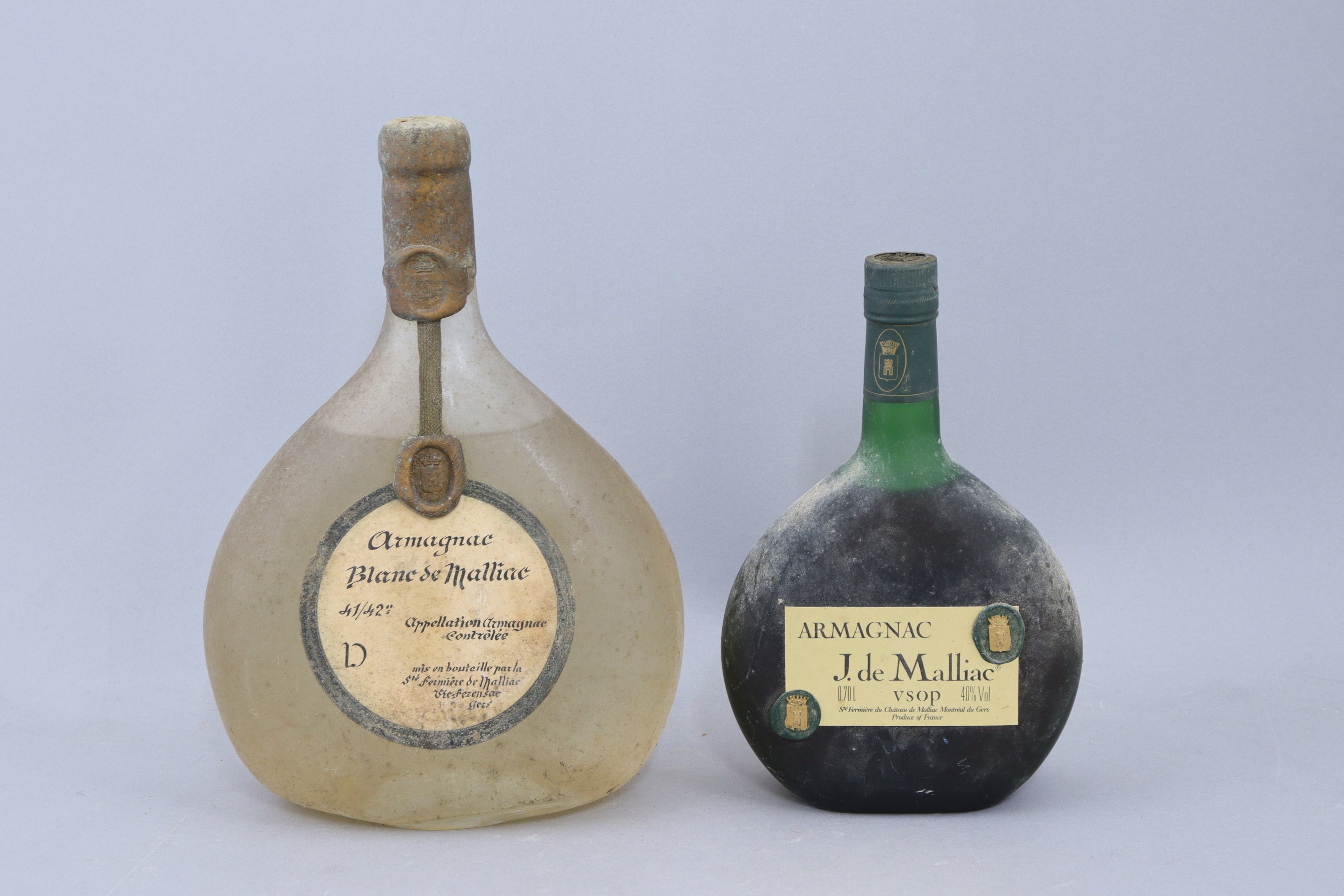 - Armagnac blanc de Malliac, non millésimé, 1 bouteille, 2L. 5 cm sous le bouchon. Bouchon et étiquette abîmés.