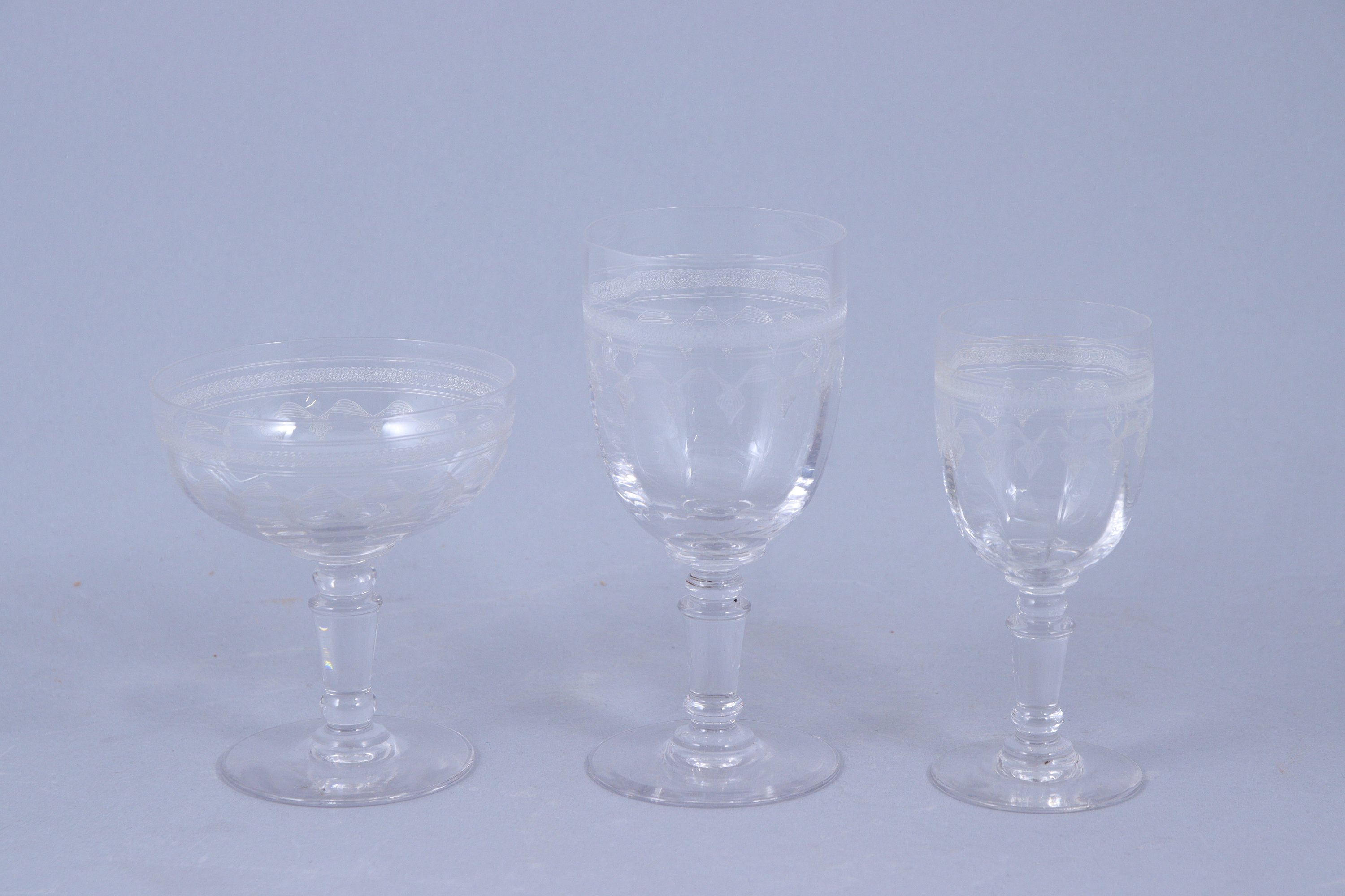 en cristal à décor gravé d'enroulements, composé de 18 coupes à champagne, 10 verres à eau et 15 verres à vin.