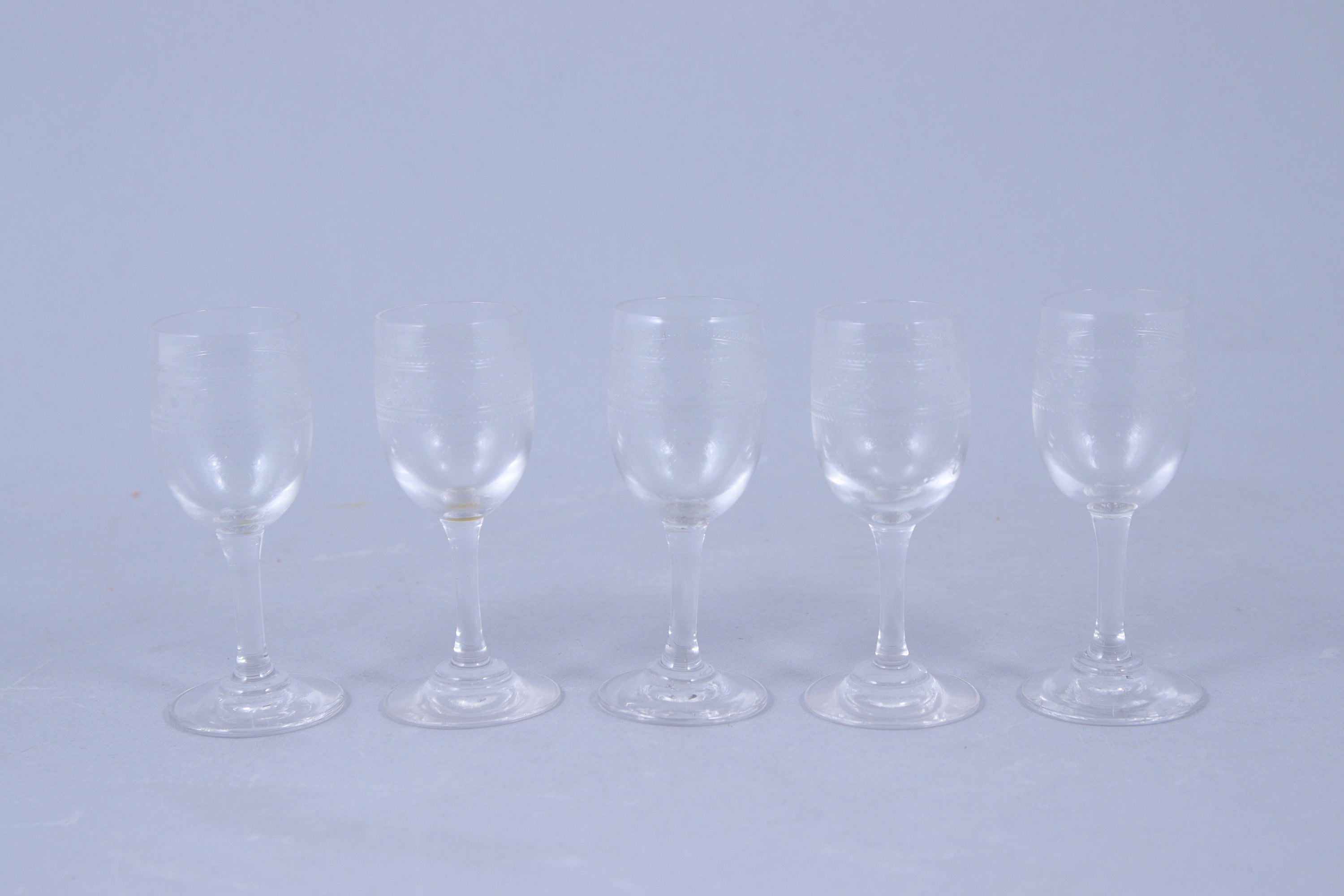 Joints: Cinq verres à liqueur en cristal à décor de croisillons dans un encadrement de filets d'enroulements. Haut. 9,2 cm.