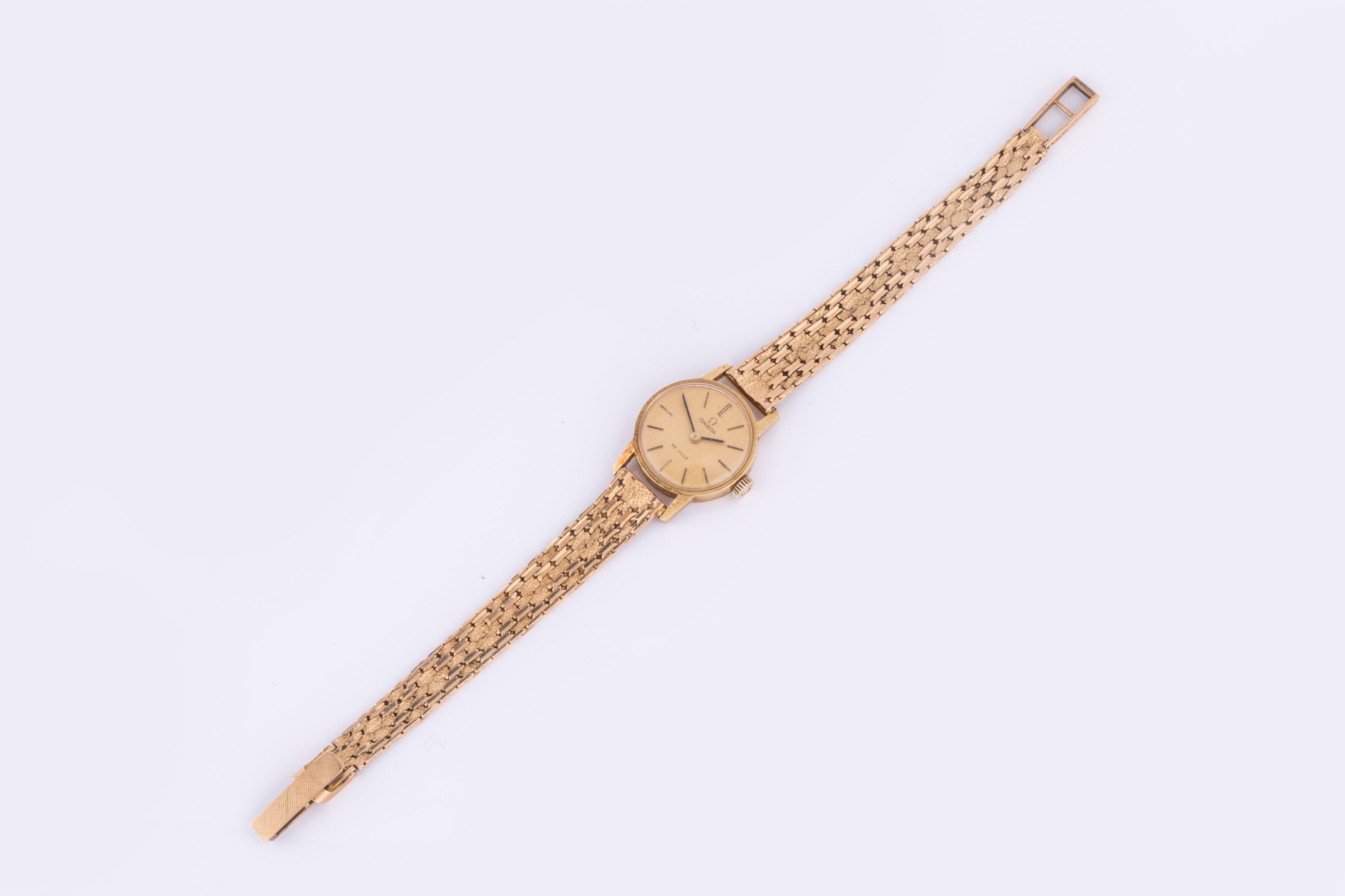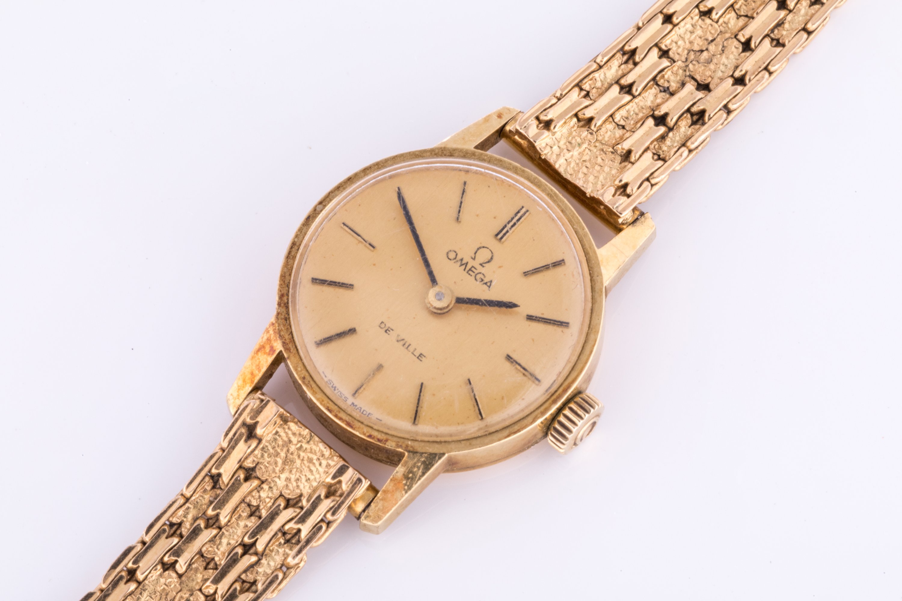 en or jaune 750 millièmes. Le cadran circulaire à fond doré indiquant les heures par des bâtonnets. Signé "Omega" "De Ville". Bracelet en or jaune 750 millièmes.
