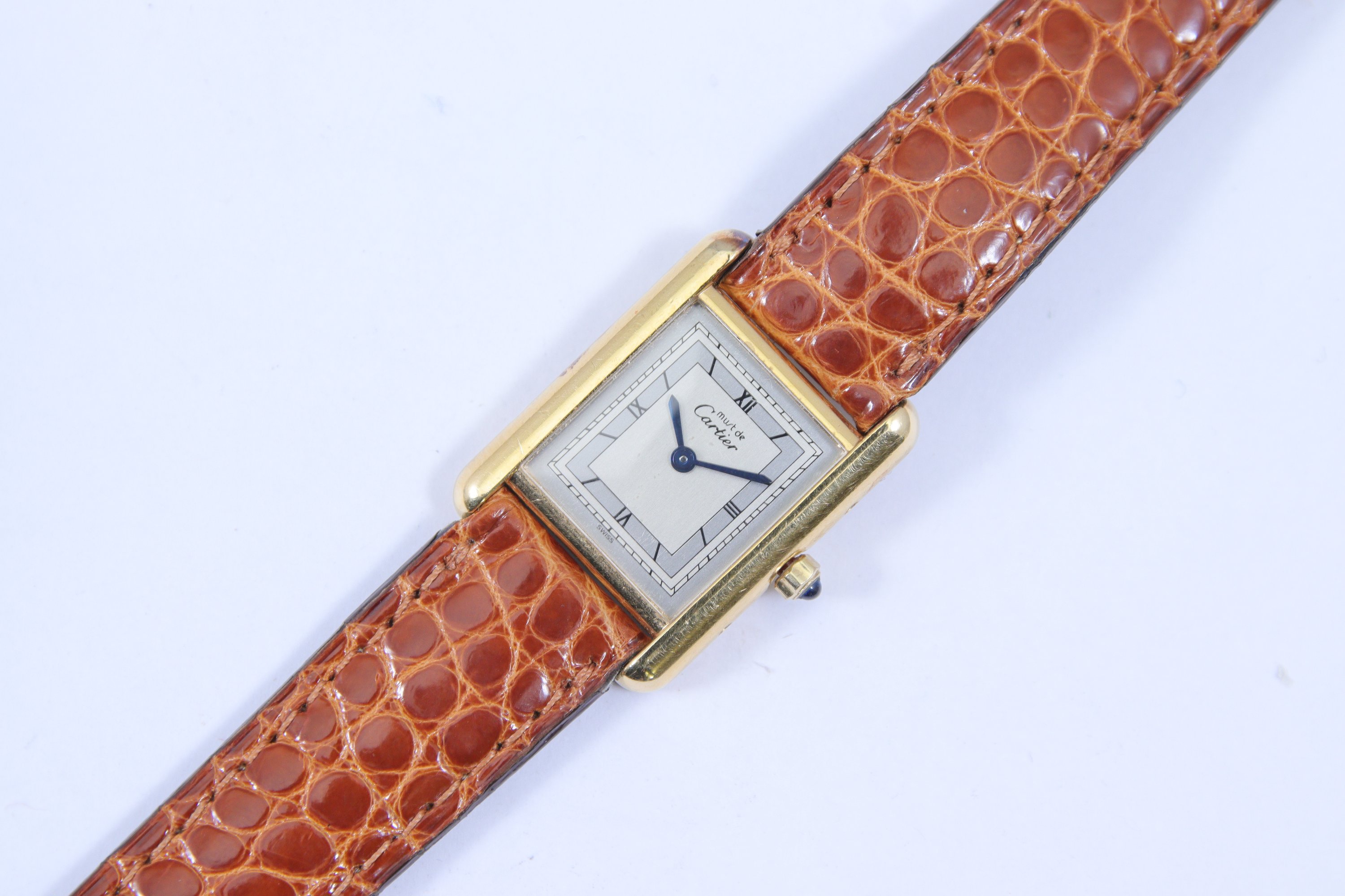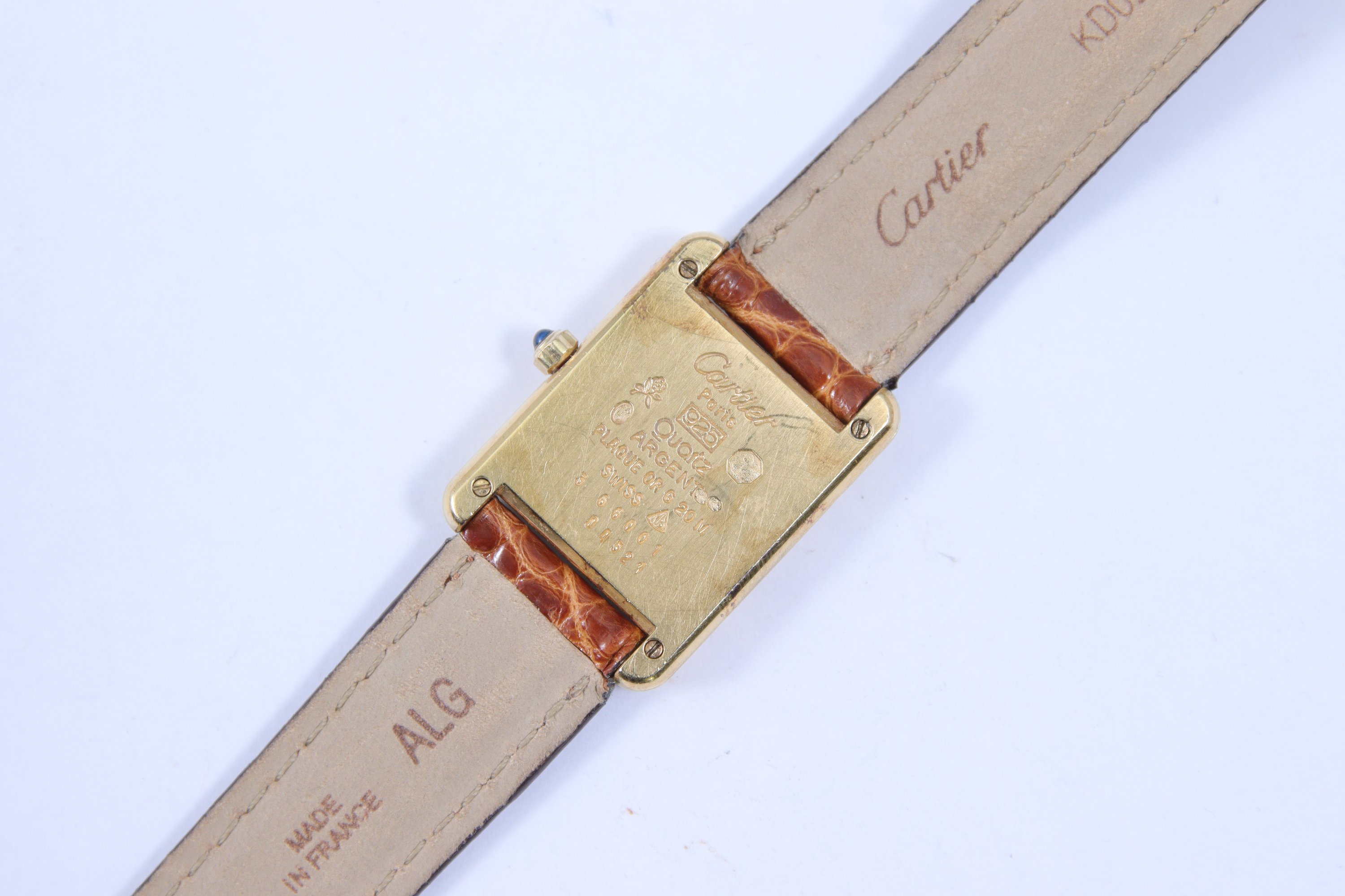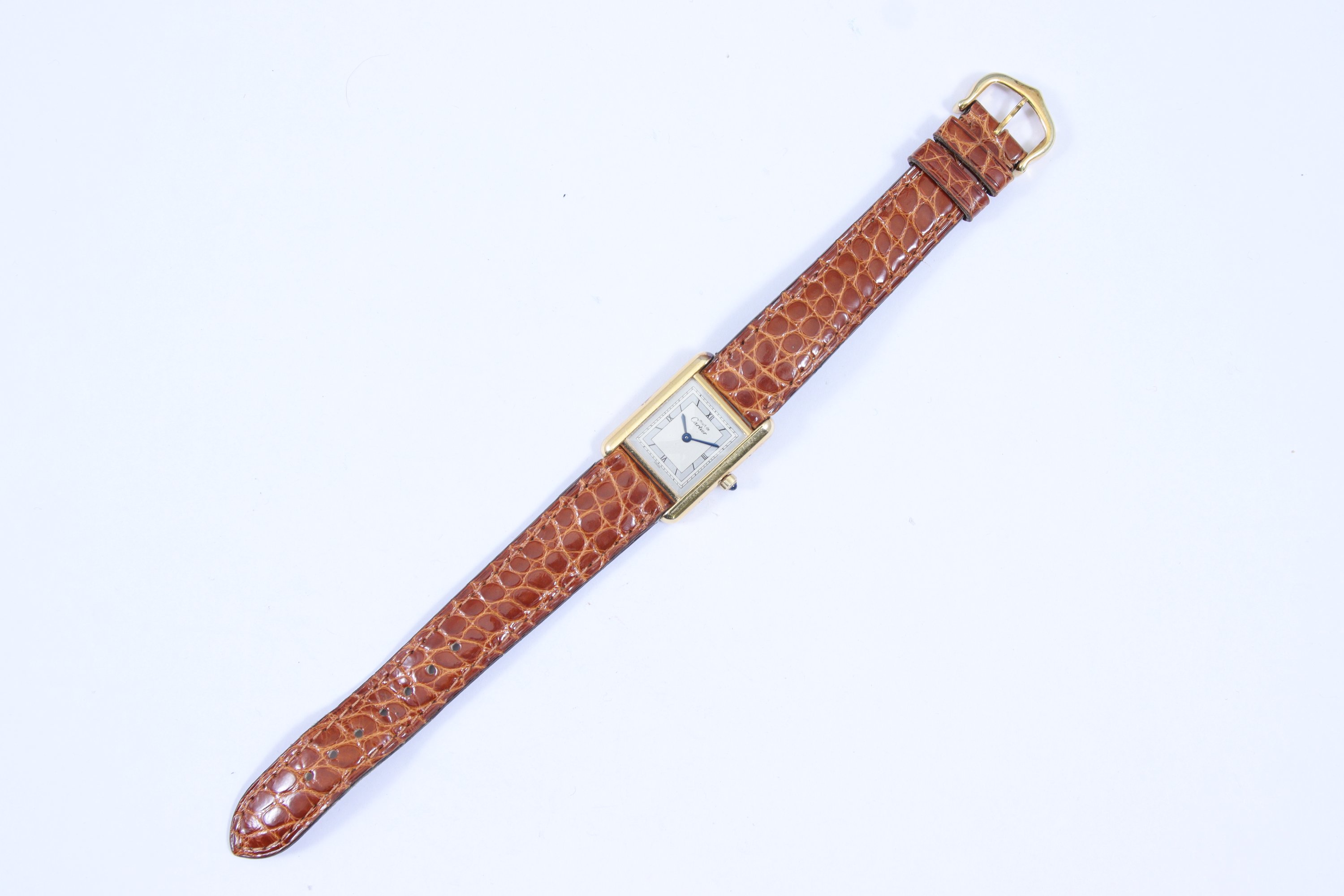 en argent 925 millièmes plaqué or 20 microns. Le cadran indiquant les heures en chiffres romains, les minutes par un chemin de fer. Remontoir à 3 heures serti d'un saphir en cabochon. Numérotée "3 66001 / 04521". Mouvement à quartz.