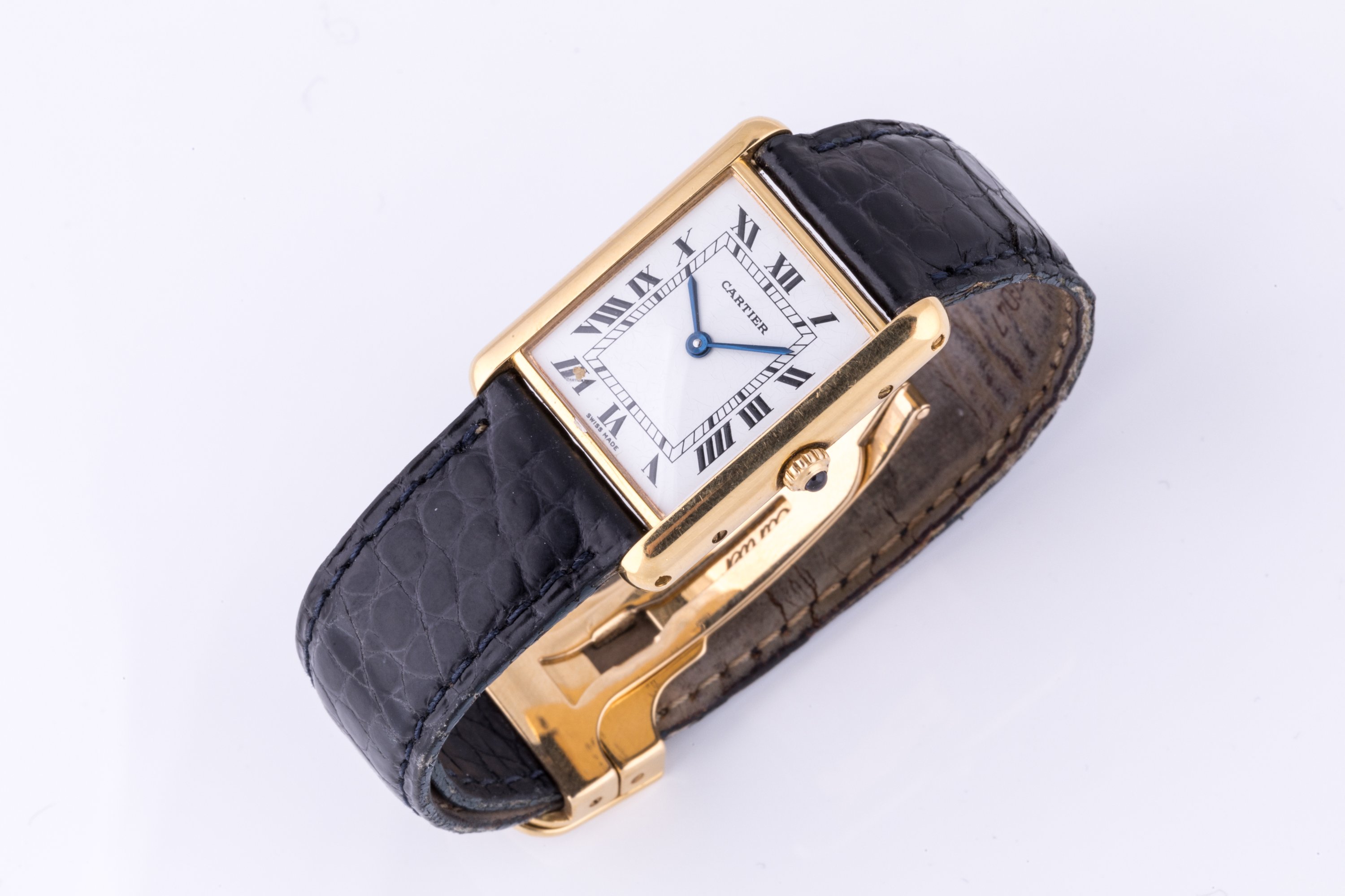 en or jaune 750 millièmes. Le boitier rectangulaire indiquant les heures par des chiffres romains, les minutes par des bâtonnets. Signée Cartier. Numérotée "88105210813". Mouvement à quartz.