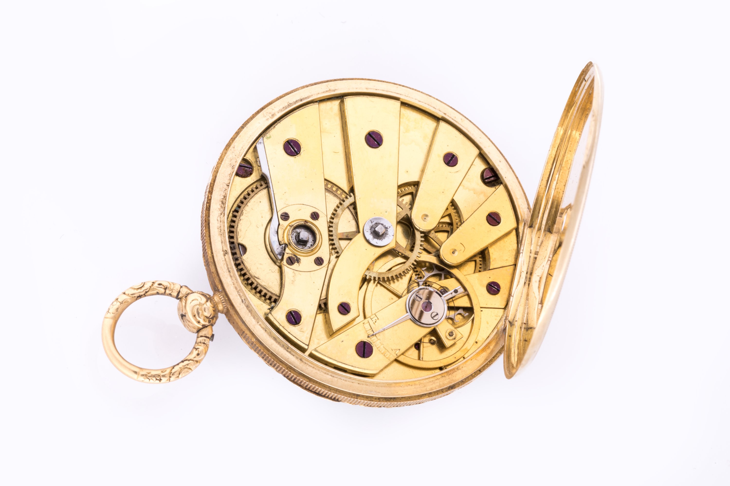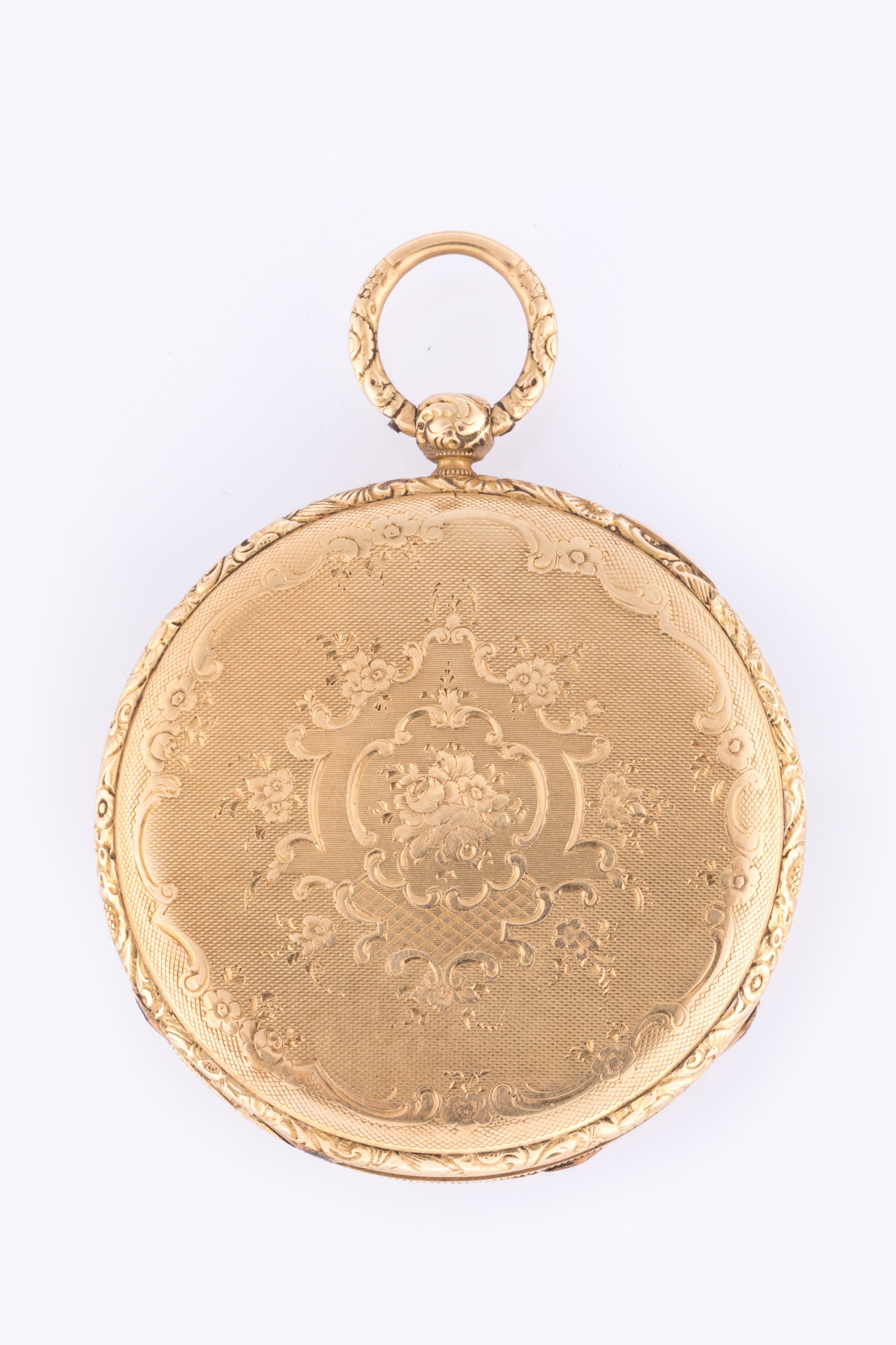 en or jaune 750 millièmes. Le cadran émaillé blanc indiquant les heures en chiffres romains, les minutes par un chemin de fer. Le revers à décor d'une réserve ornée d'un bouquet de fleurs dans un entourage rocaille.