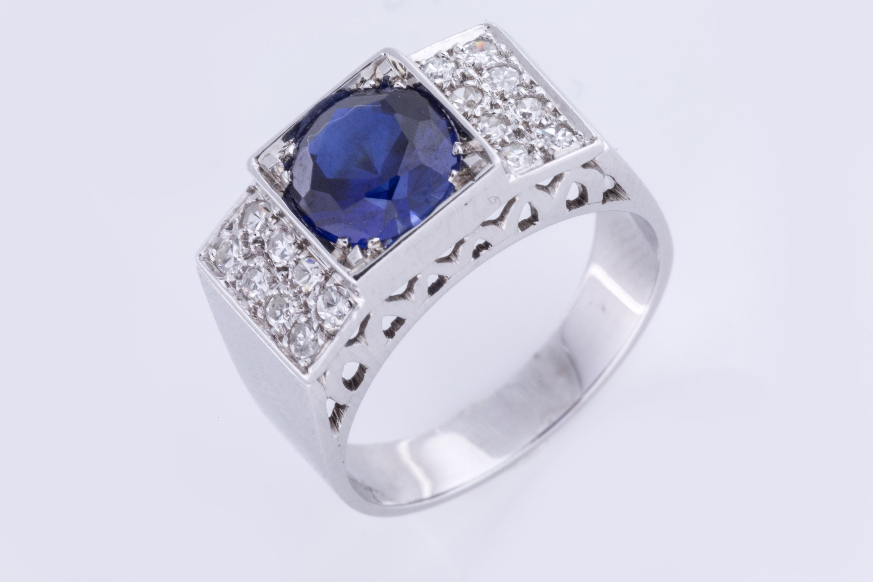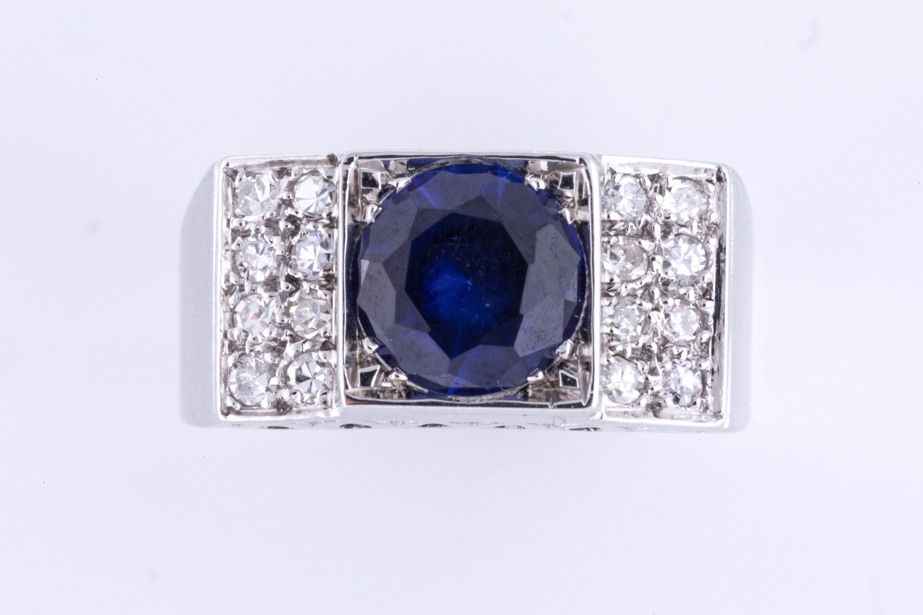 en or gris 750 millièmes et platine 850 millièmes, le centre serti d'une pierre de synthèse bleue entre des lignes de diamants ronds taillés en huit-huit.