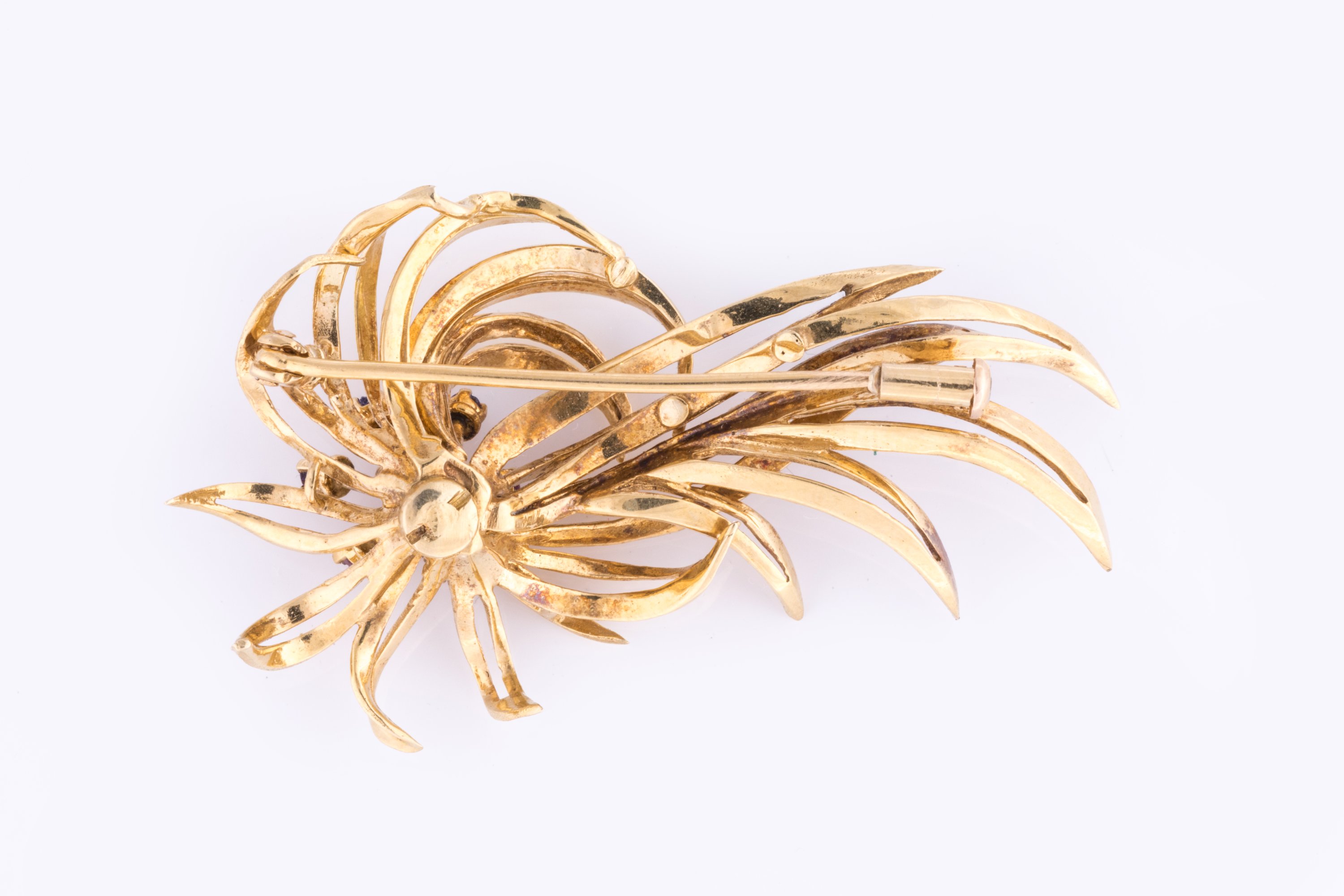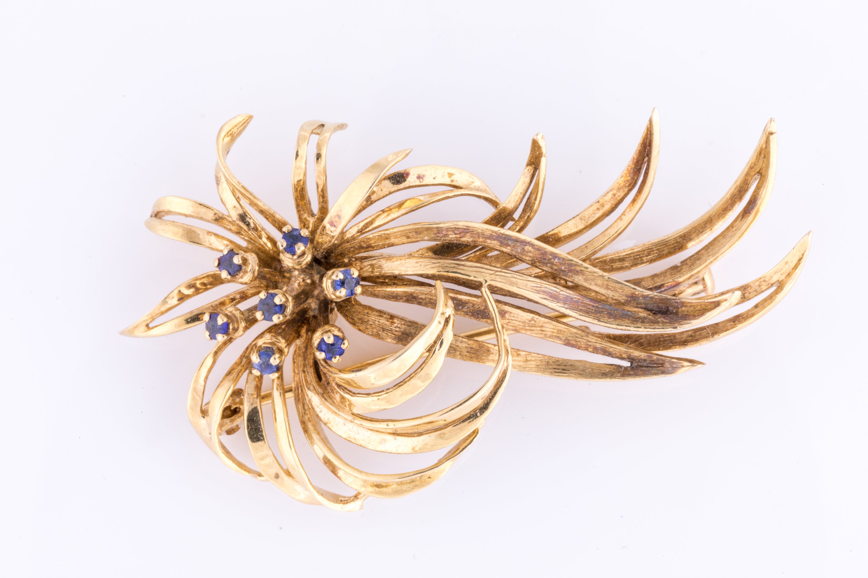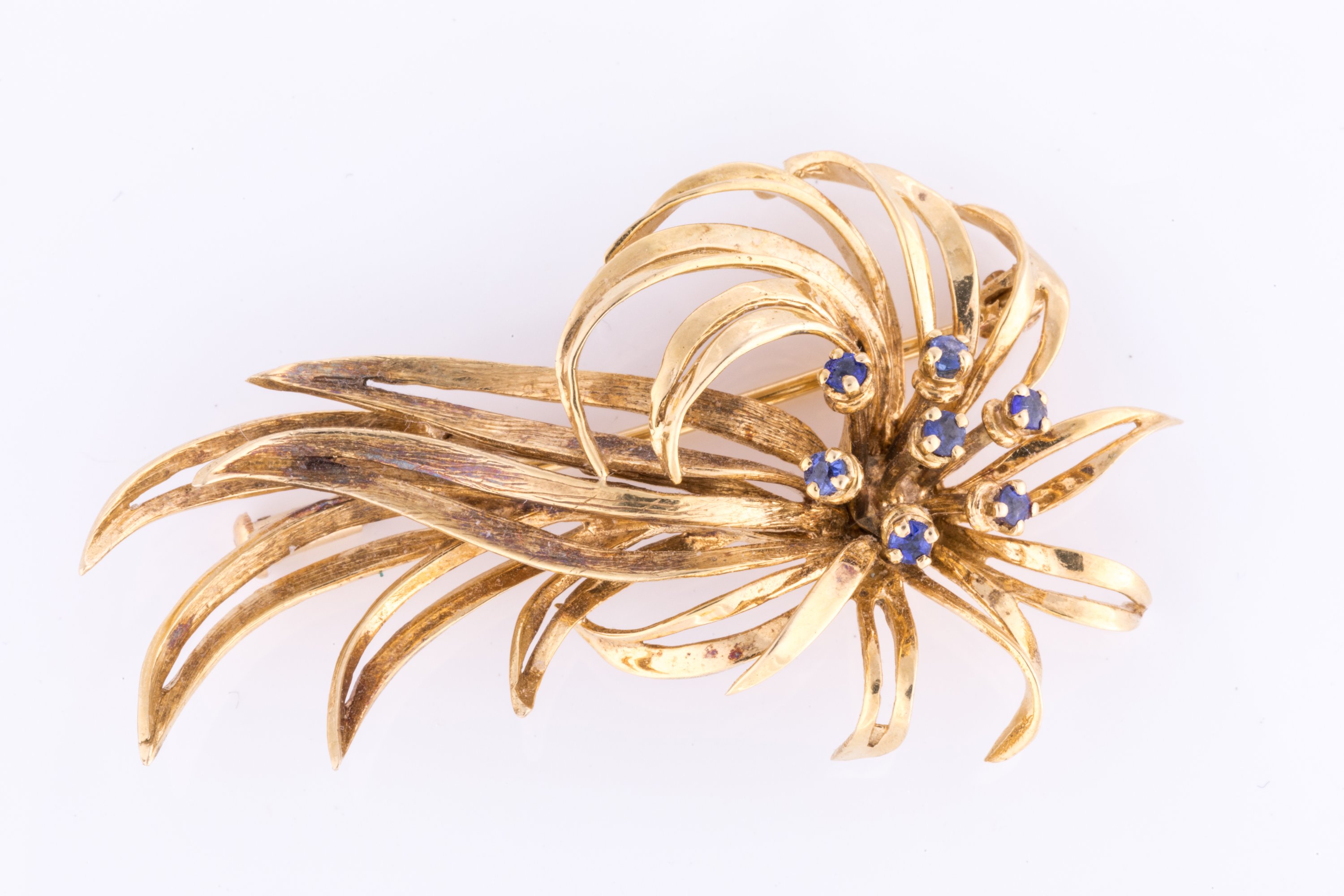 en or jaune 750 millièmes, en forme d'un bouquet de fleurs stylisées dont les pétales sont sertis de sept saphirs.