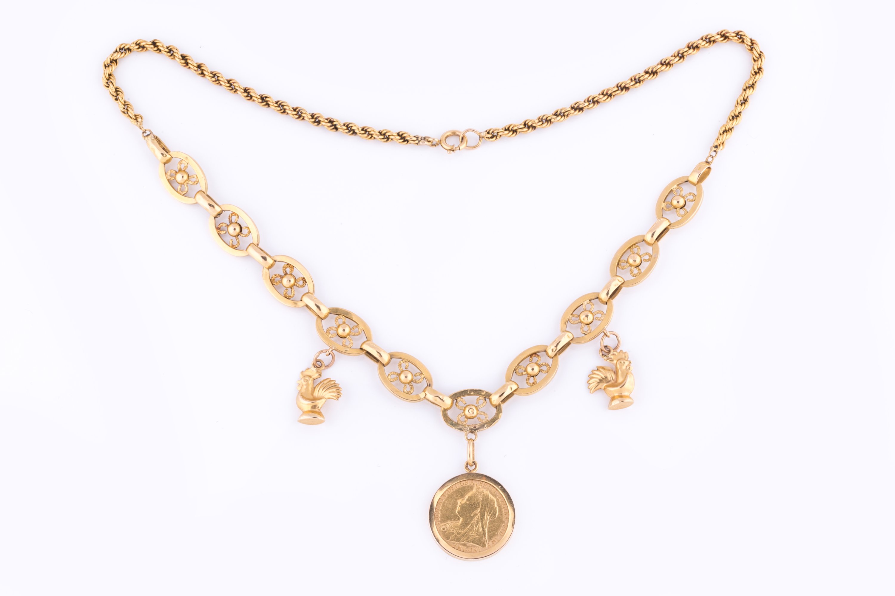 en or jaune 750 millièmes, à mailles corde et mailles cheval stylisées aux fleurettes, orné de deux pendentifs au coq et un souverain Victoria 1900 dans une monture.
