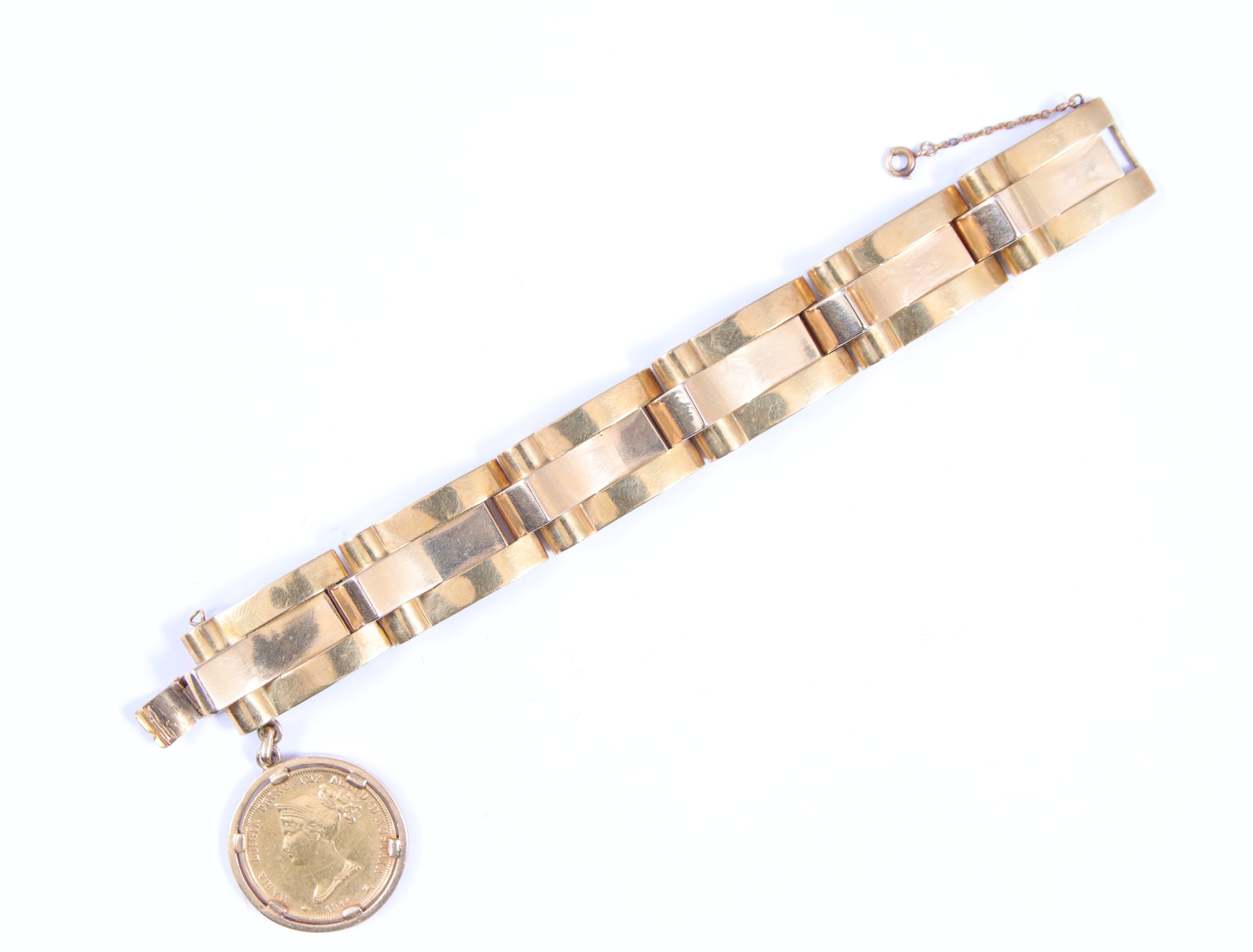 en or jaune 750 millièmes retenant une pièce de 40 lires or Maria Luigia 1815, dans une monture en or jaune 750 millièmes. Chaînette de sécurité.