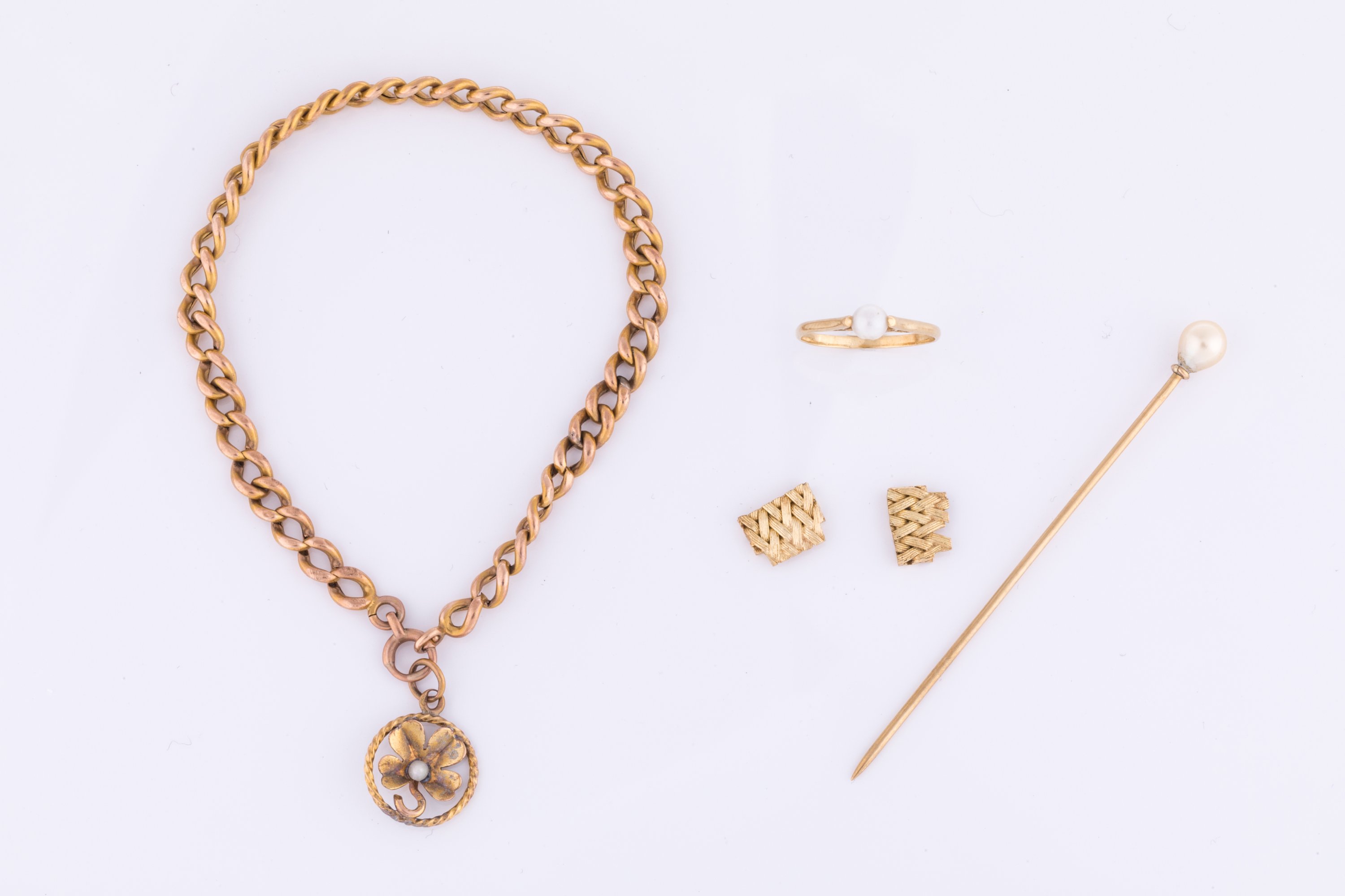 - Bracelet à mailles gourmettes ornées d'un motif de trèfle avec une petite semence de perle. Long. 18,8 cm. Poids brut 5,3 g.