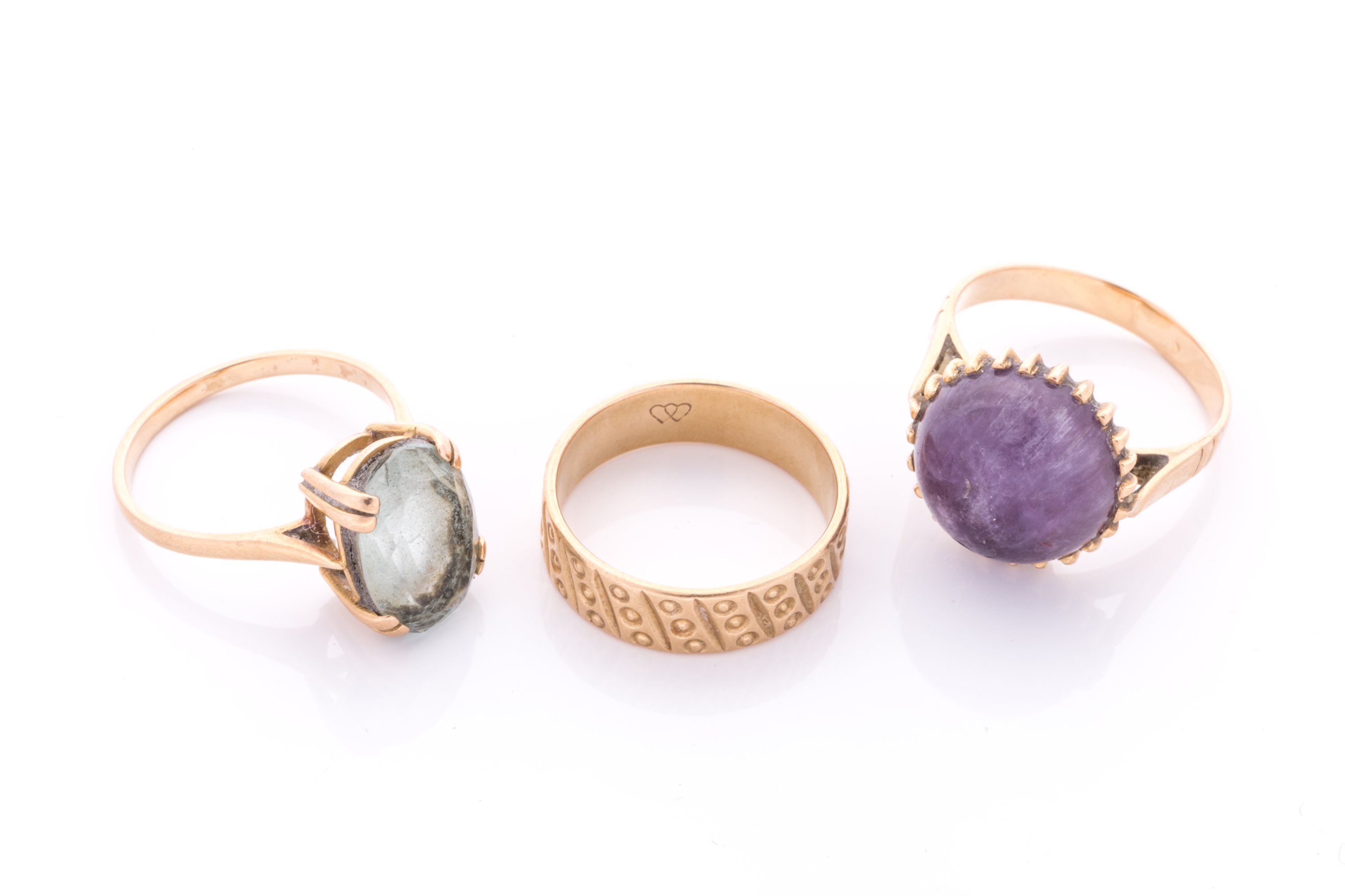- L'une en or jaune 750 millièmes sertie d'une pierre violette montée en cabochon. TDD 58. Poids brut 6,3 g.