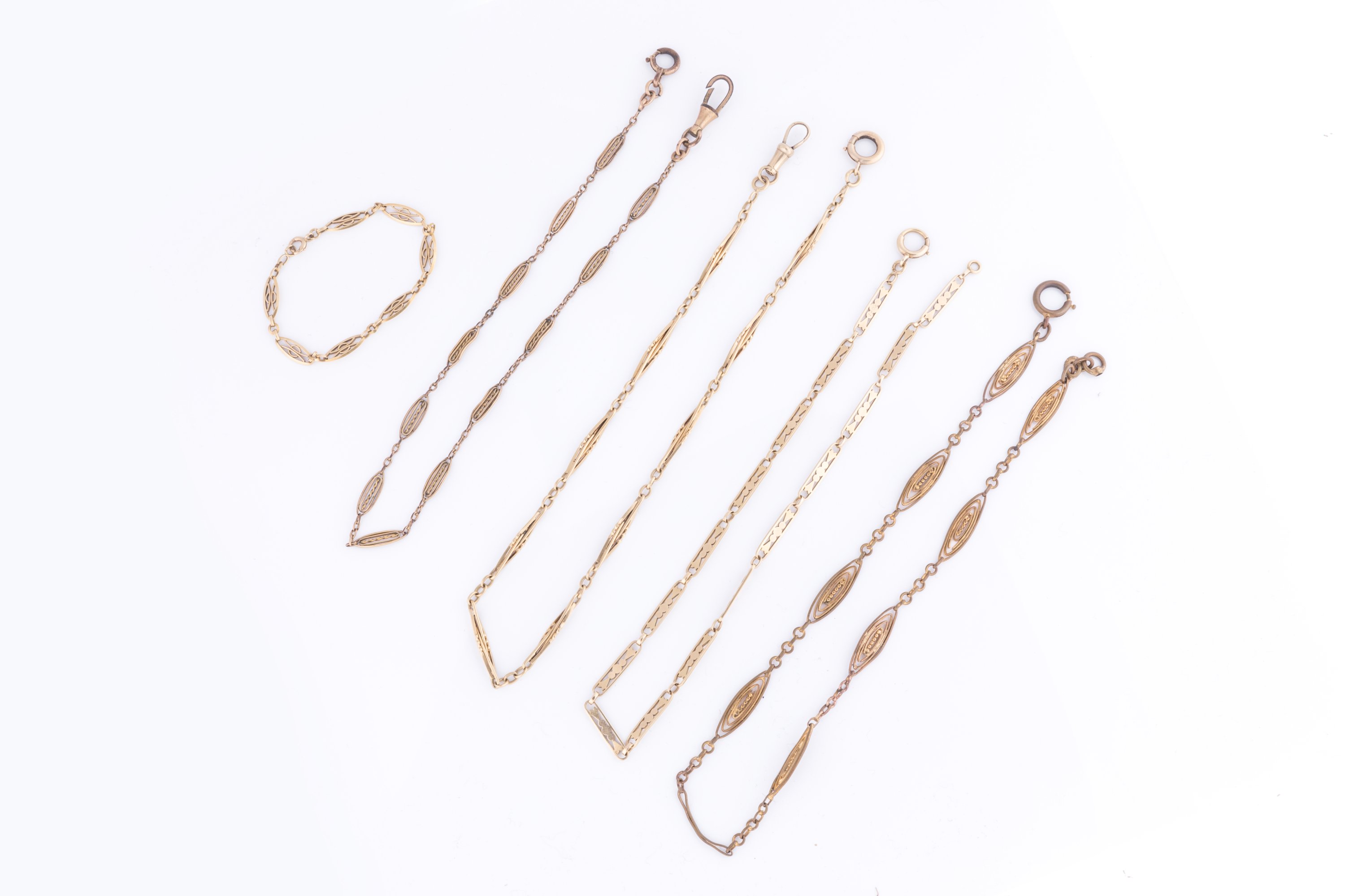 Jointes : deux chaînes de montre giletières, l'une en plaqué or à mailles filigrane (Long. 38 cm), l'autre en métal doré à mailles stylisées (Long. 34 cm).