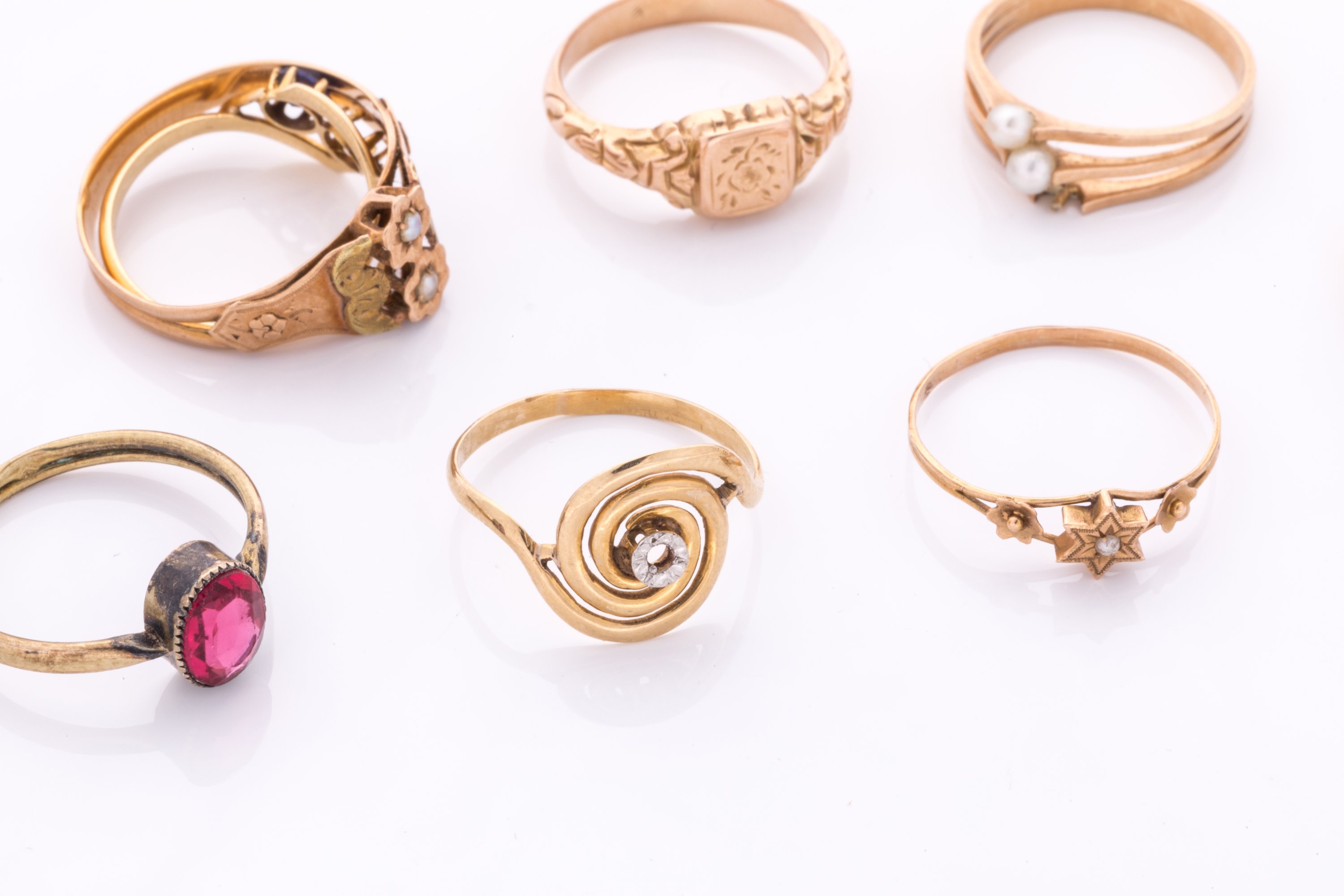 en or jaune 750 millièmes, quatre serties de perles, une à décor de spirale, une à décor végétal, une sertie d'une pierre bleue (une pierre manquante) et une sertie d'une pierre rouge.