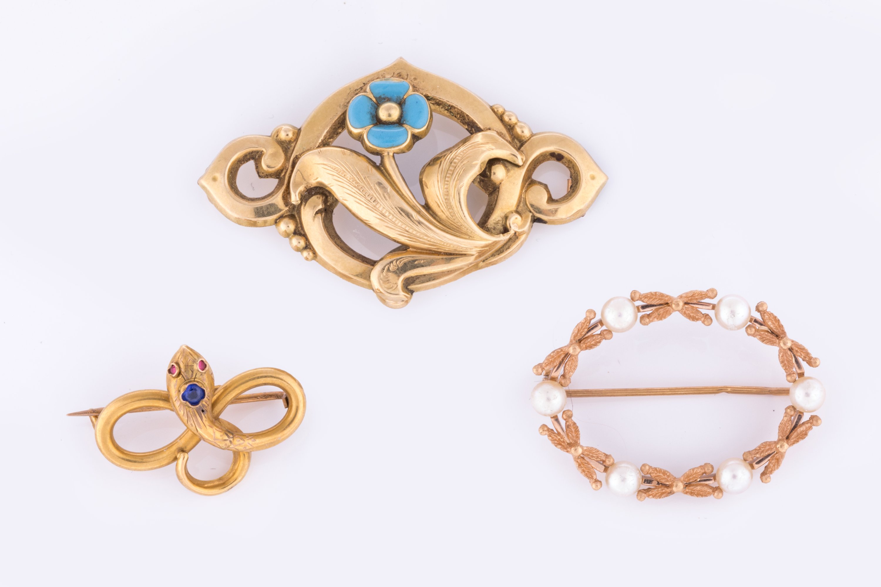 - La troisième à décor d'une fleur aux pétales émaillés bleus. Haut. 50 mm. Poids brut 3,6 g. (petit manque à l'émail, manque l'aiguille).