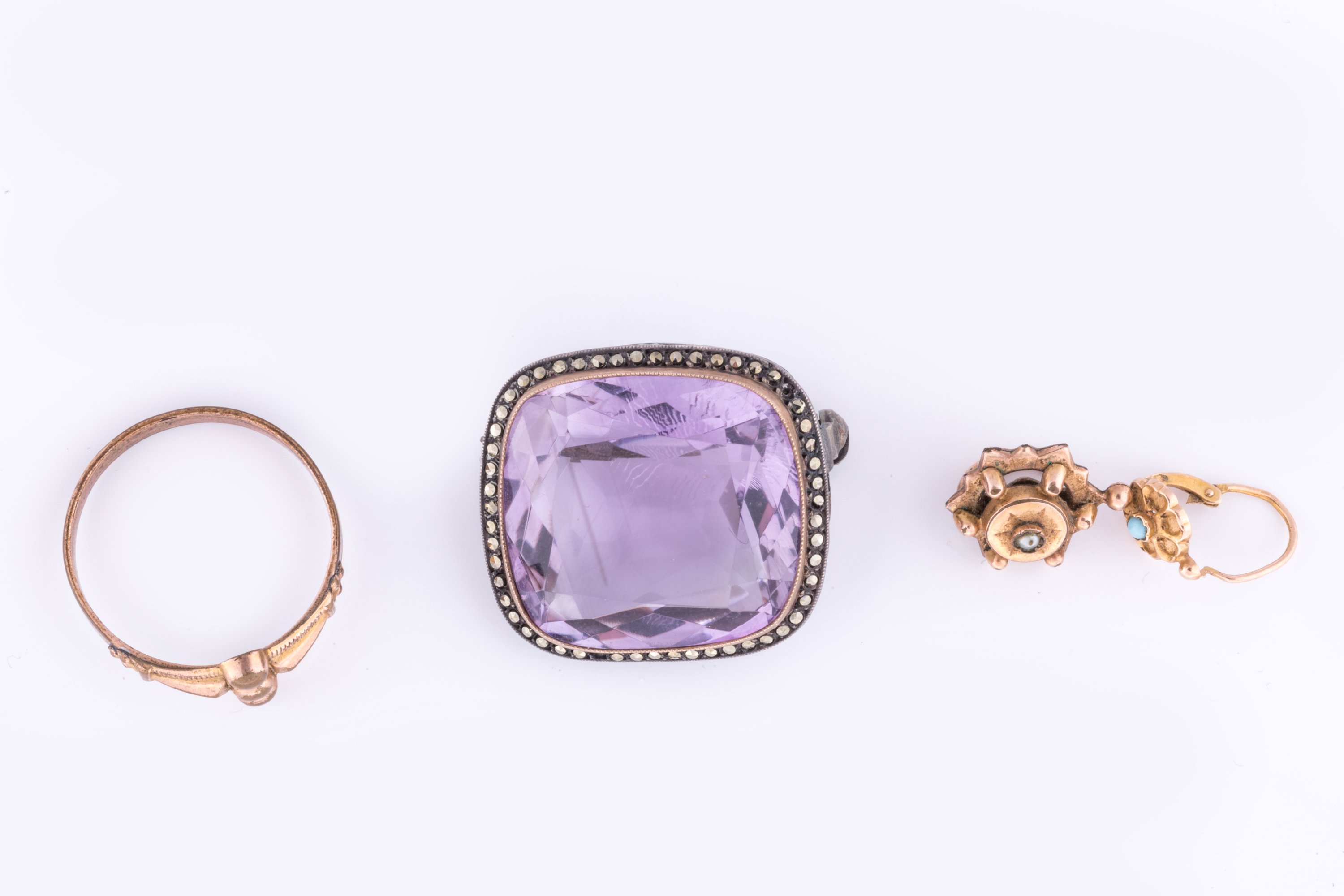- Une broche en métal de forme carrée, sertie d'un verre teinté à l'imitation d'une pierre. Haut. 23 Larg. 23 mm.
