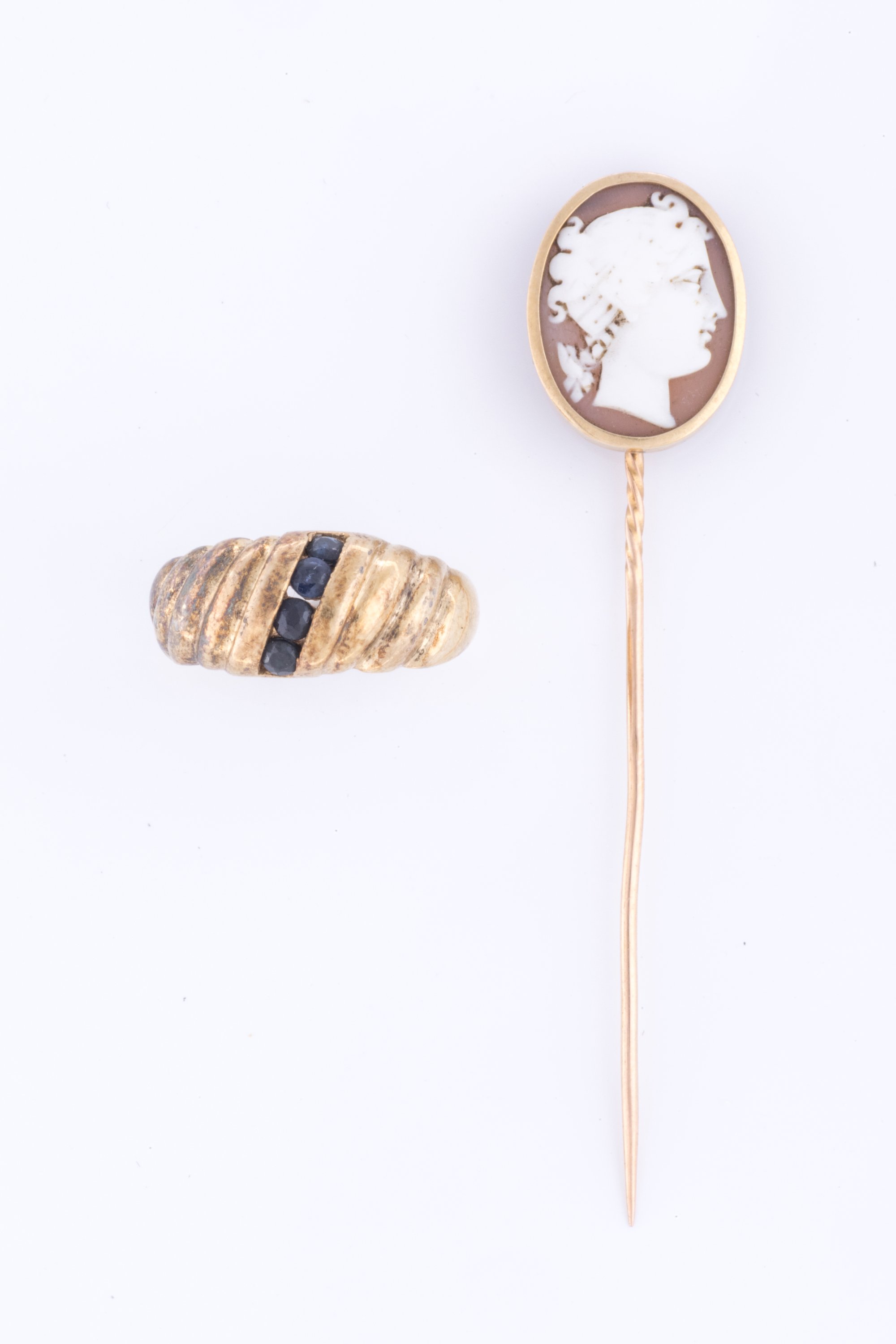 Jointe : une épingle de cravate en or jaune 750 millièmes sertie d'un camée coquille au portrait féminin de profil. Poids brut 2,4 g.