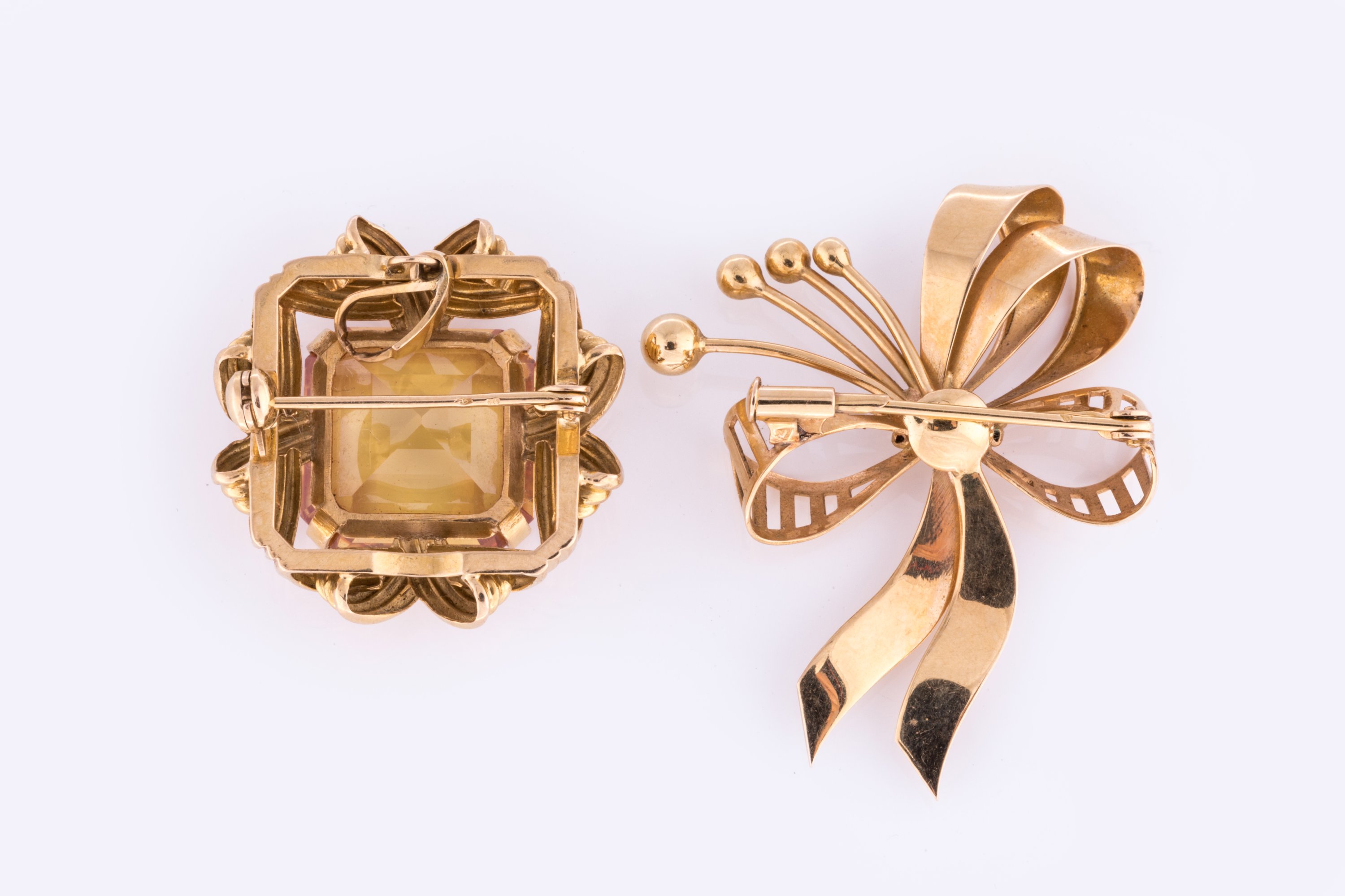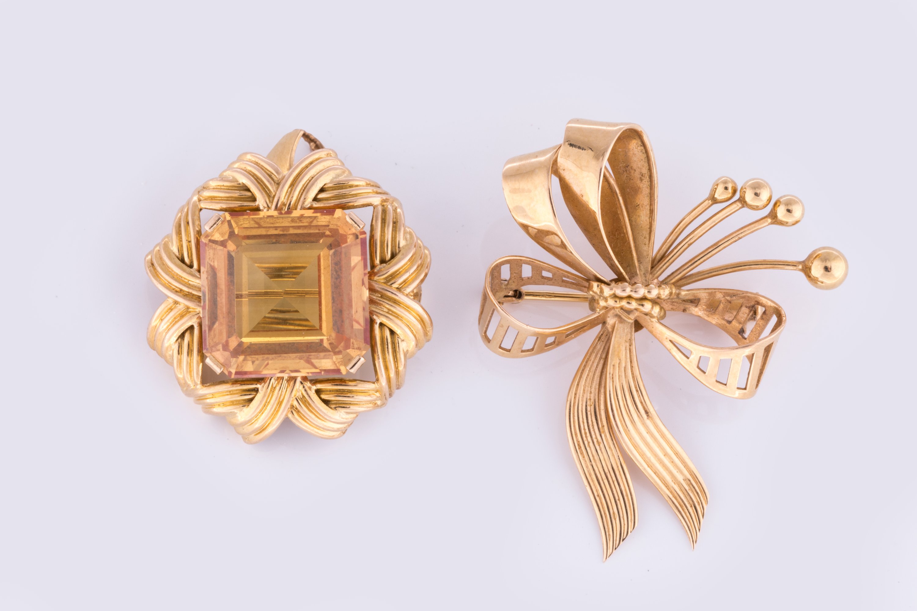 en or jaune 750 millièmes, l'une en forme de noeud avec quatre pistils et deux rubans, l'autre ornée d'une pierre fine, cornaline ou citrine, formant pendentif.