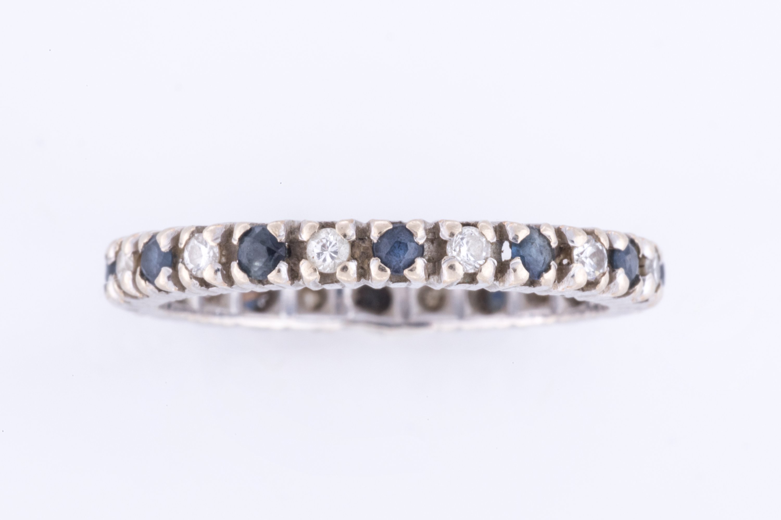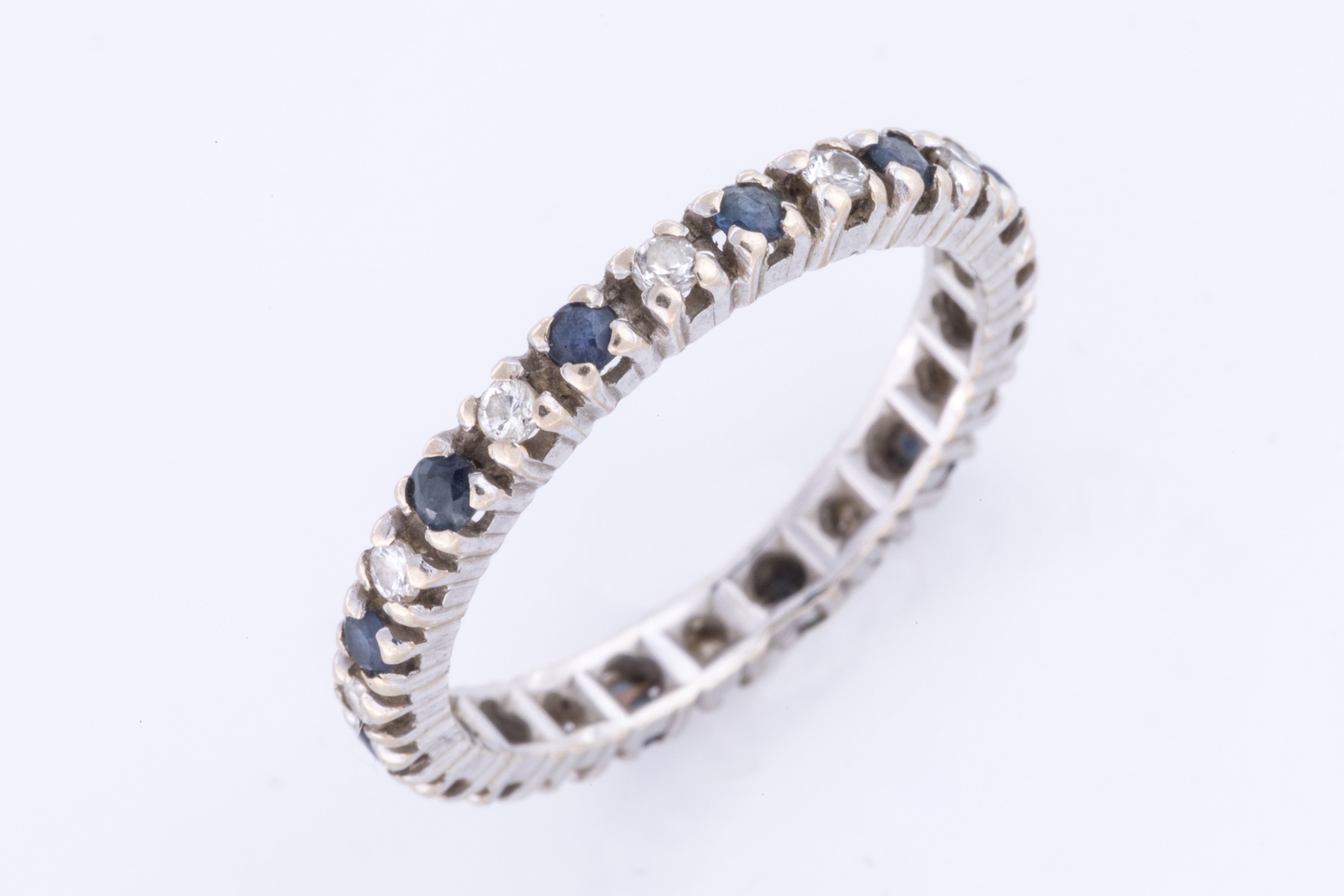 en or gris 750 millièmes, sertie de brillants en alternance de petites pierres bleues.