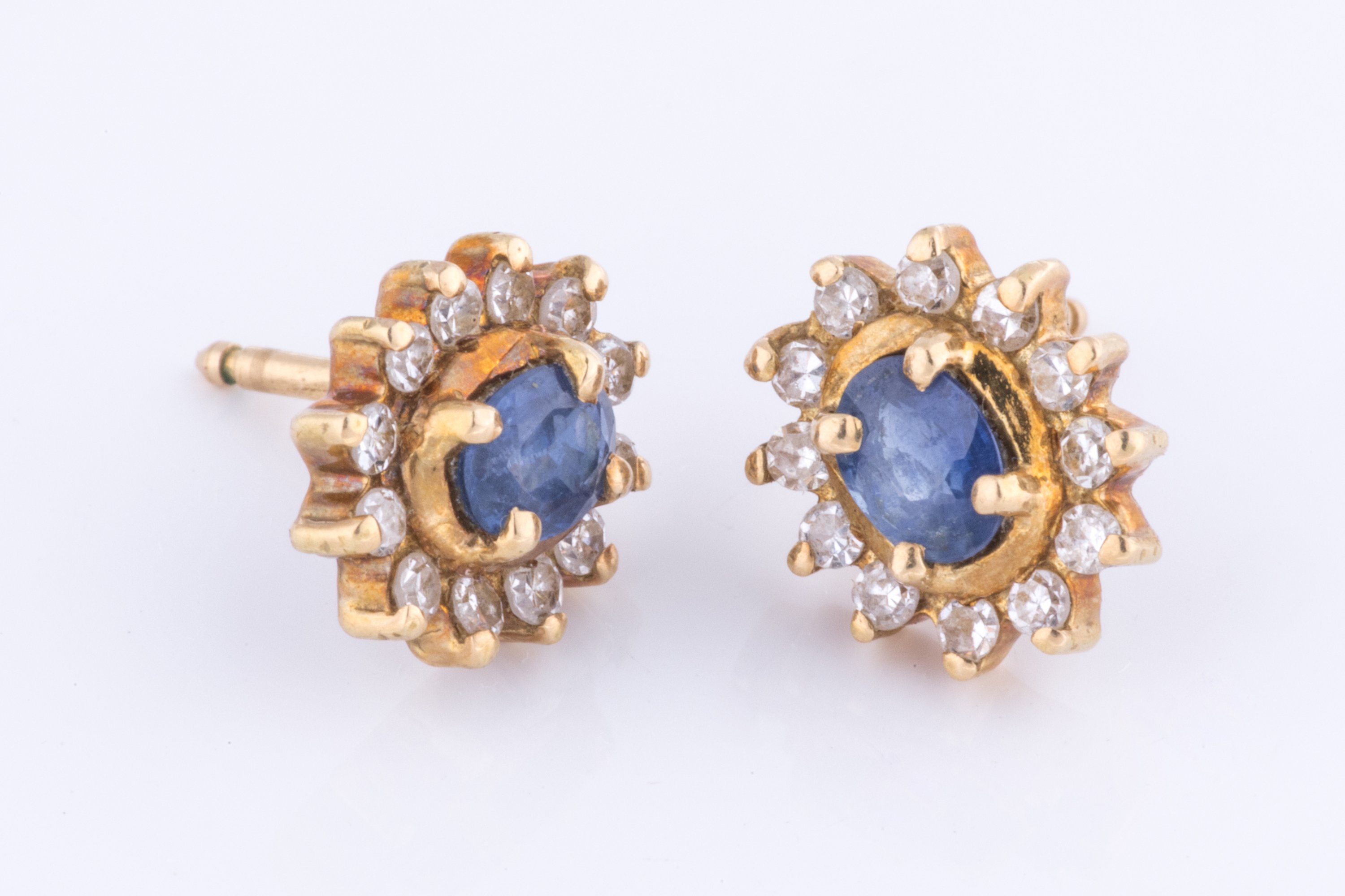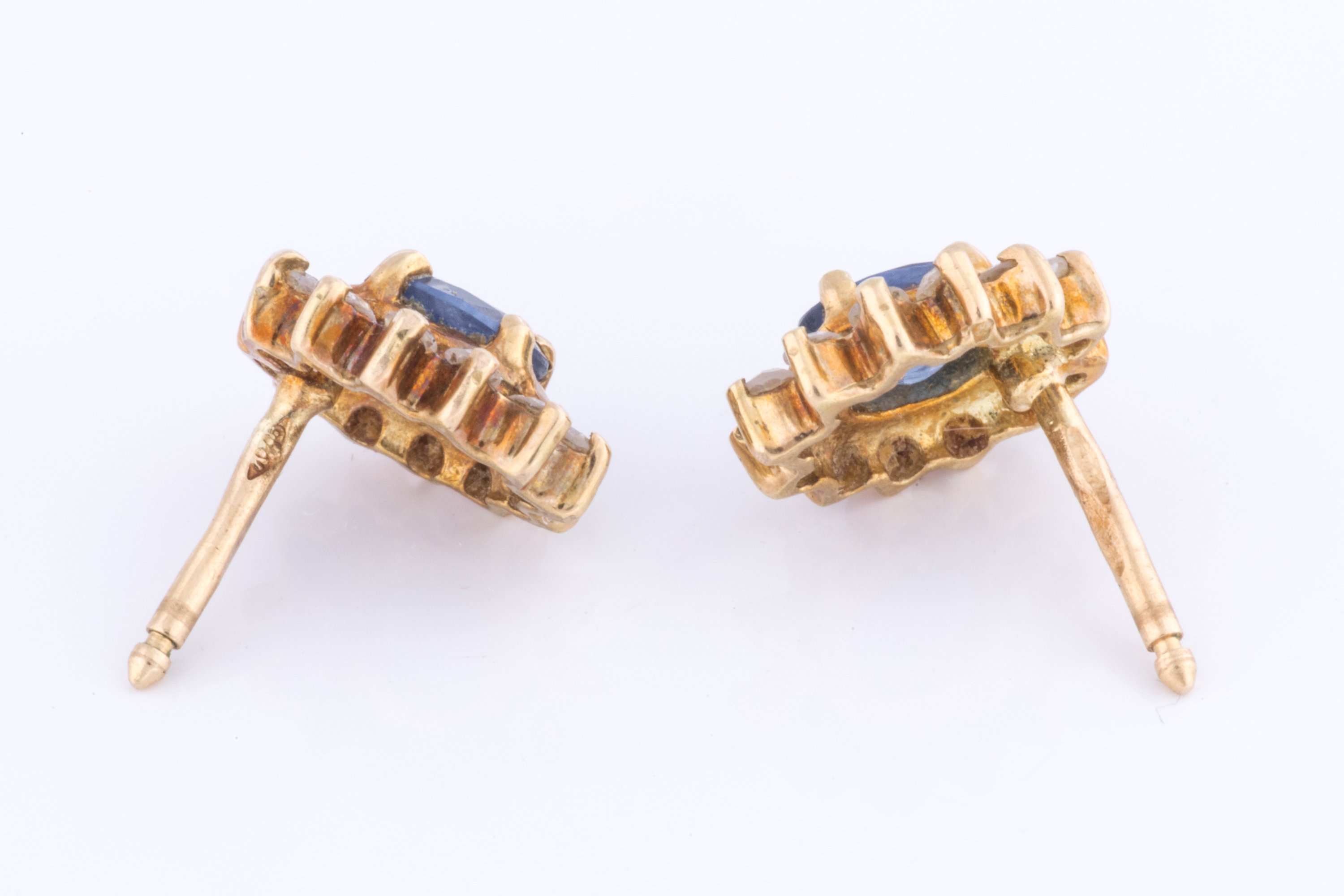 en or jaune 750 millièmes, sertis de saphirs en taille ovale dans un entourage de 24 diamants taille brillant.