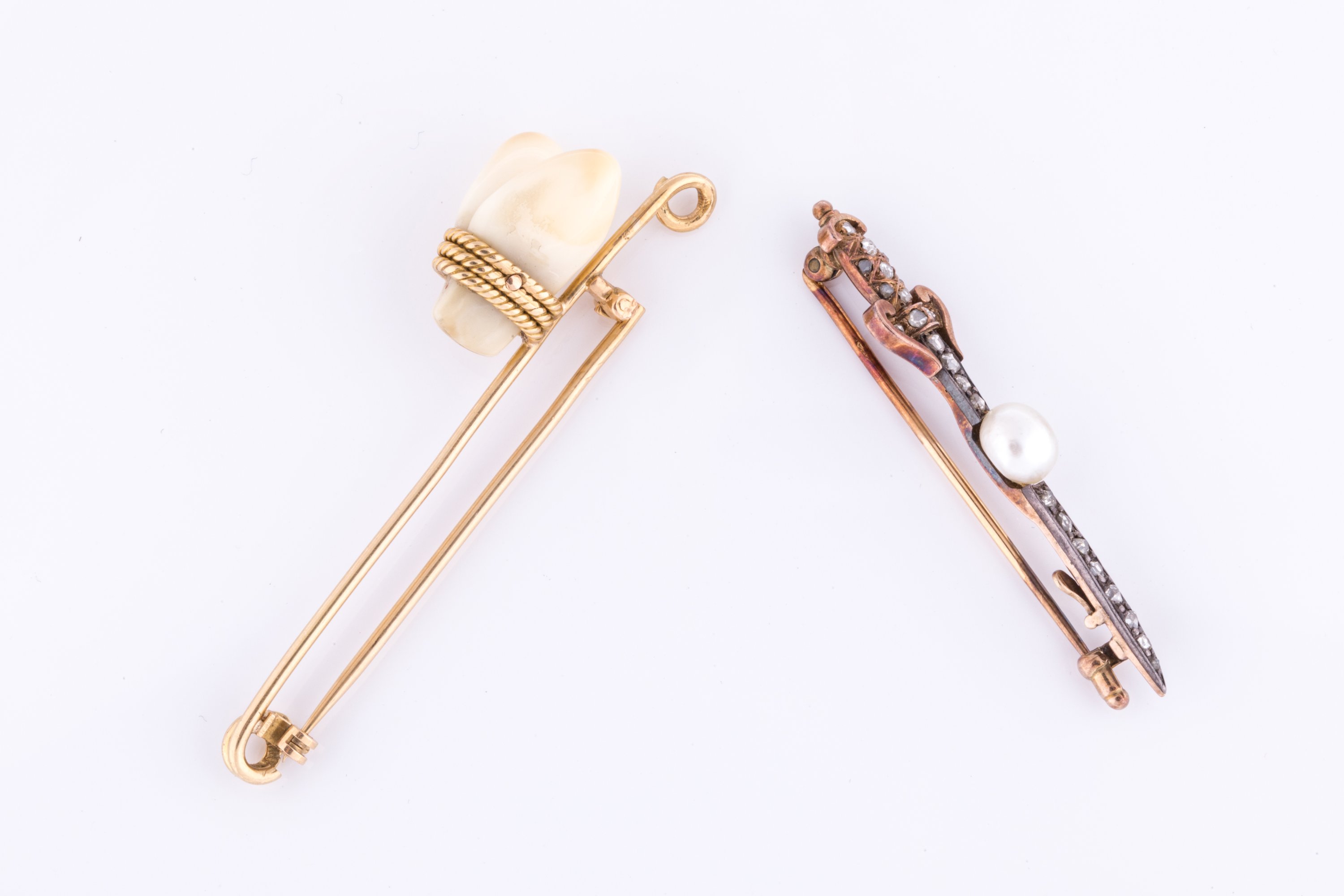 en or jaune 750 millièmes, l'une de vénerie, ornée d'un croc de cerf, l'autre en forme de glaive pavé de diamants avec une perle baroque.