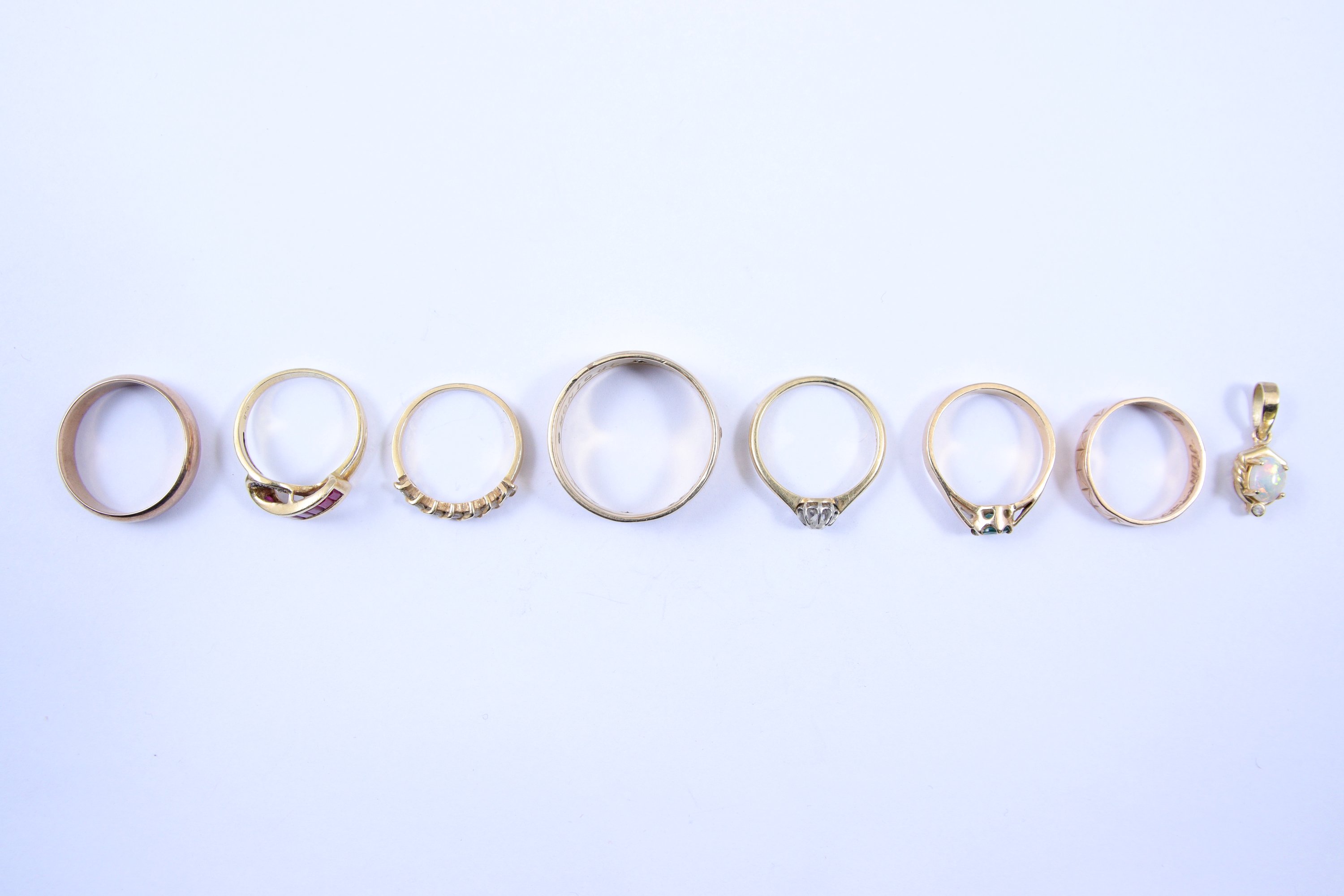 en or jaune 750 millièmes. La première sertie d'un diamant brillant d'environ 0,10 ct., la deuxième sertie de 7 petits diamants, la troisième sertie d'une émeraude, la quatrième en jonc, la cinquième pavée de rubis et le pendentif serti d'une opale.