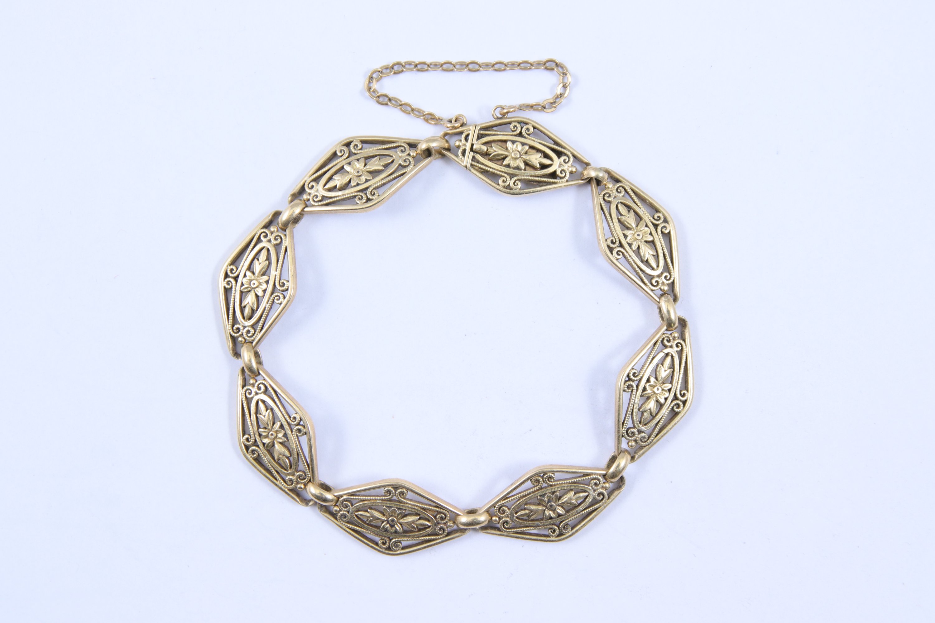 en or jaune 750 millièmes, à mailles losangées à décor d'enroulements et motifs floraux. Chaînette de sécurité.
