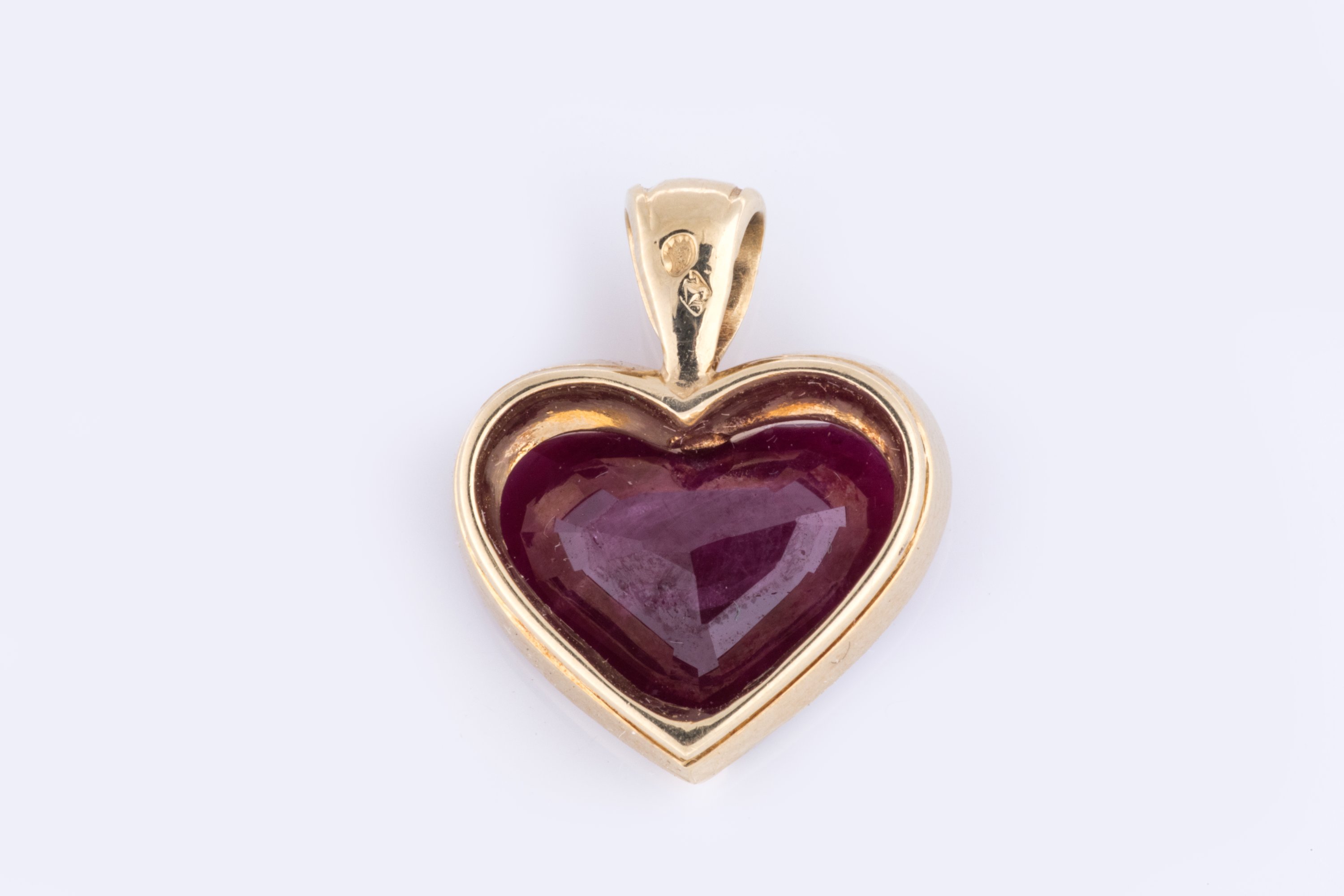 en or jaune 750 millièmes orné d'une pierre rouge taillée en coeur (rubis ?), la bélière ornée de sept petits diamants.