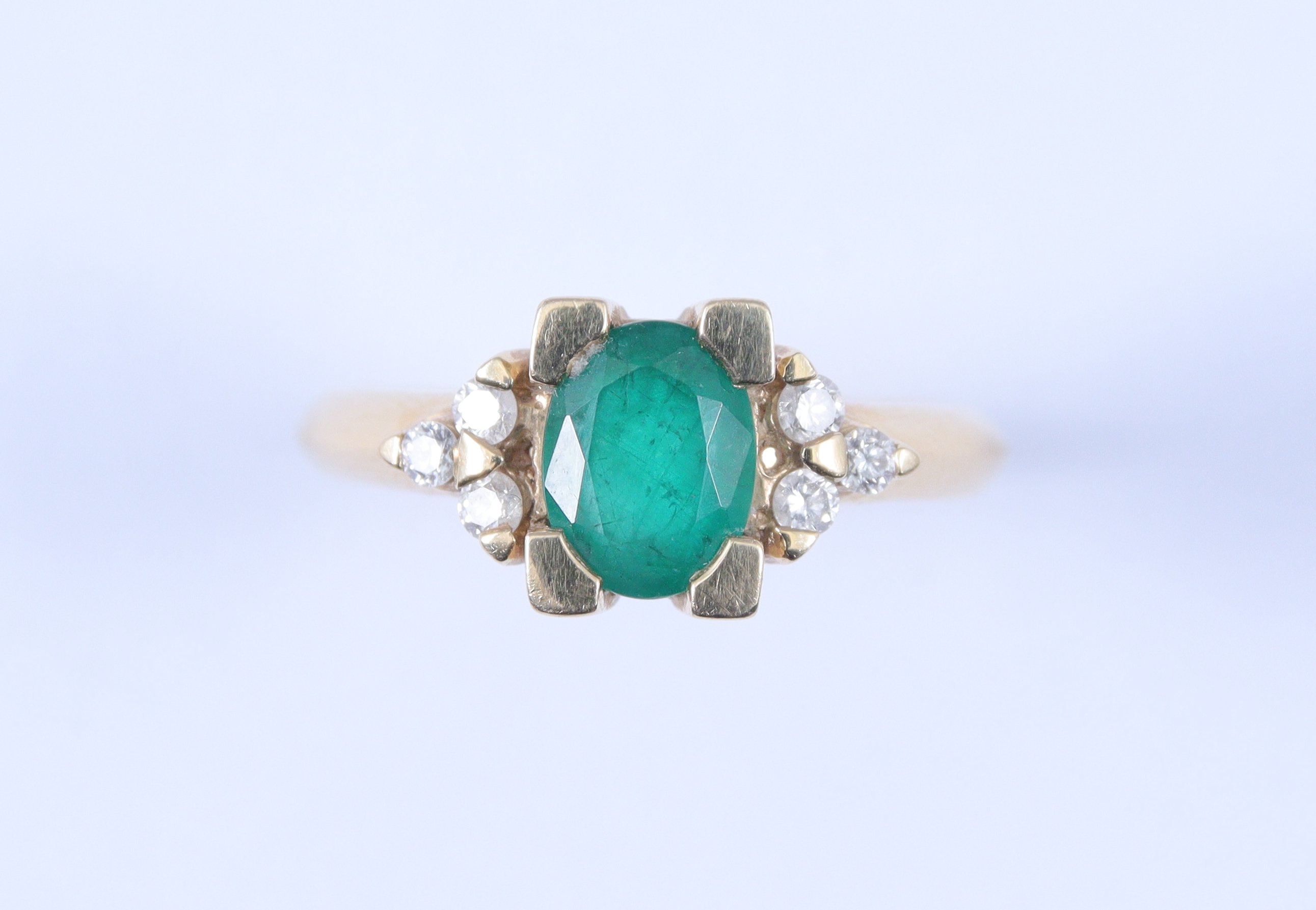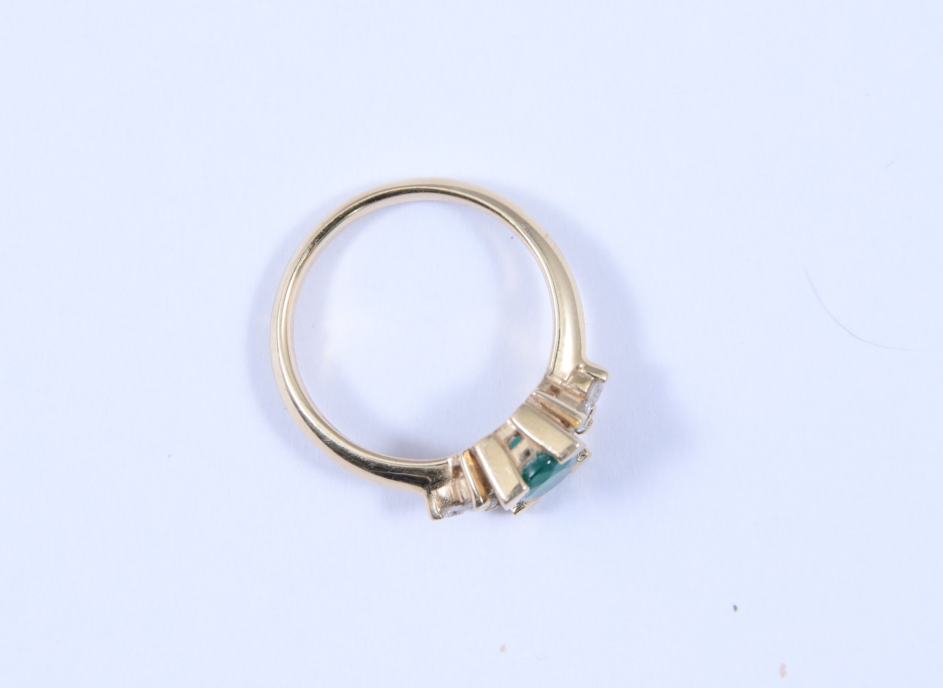 en or jaune 750 millièmes ornée d'une émeraude de taille ovale (?) dans un entourage de six dimants d'environ 0,01 ct chacun.