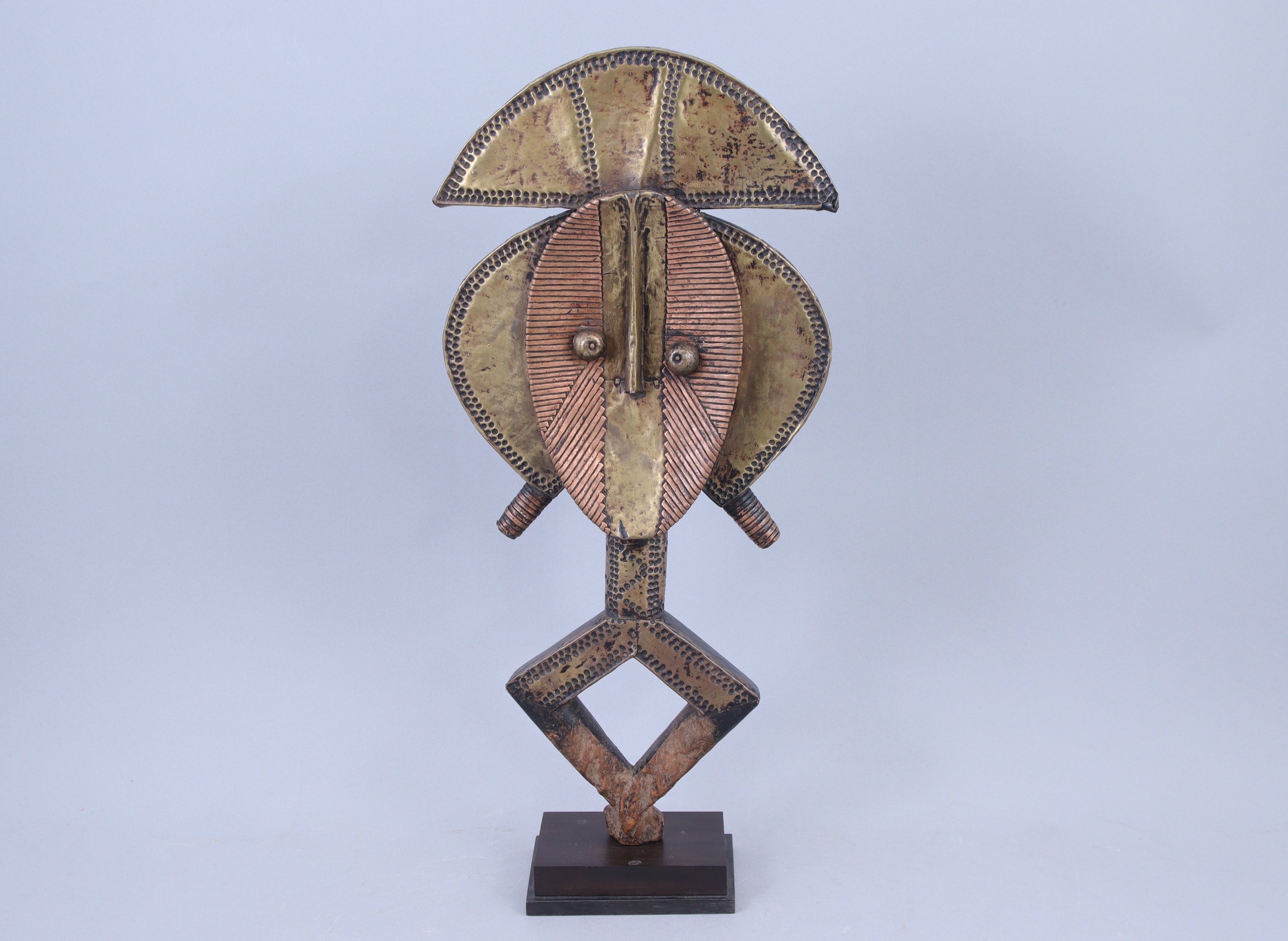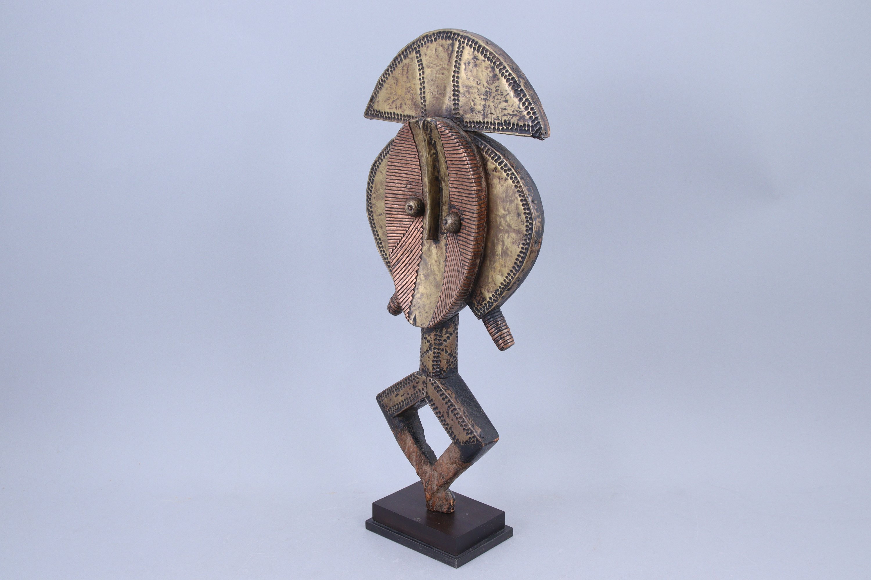 De facture classique, il représente une âme de bois recouverte sur une face de lamelles de cuivre et plaque de laiton agrafées. Bien que de production tardive, cette figure gardienne des reliques ancestrales répond aux exigences du corpus traditionnel existant. Le bois de la base est érodé et la poignée présente une patine de préhension.
