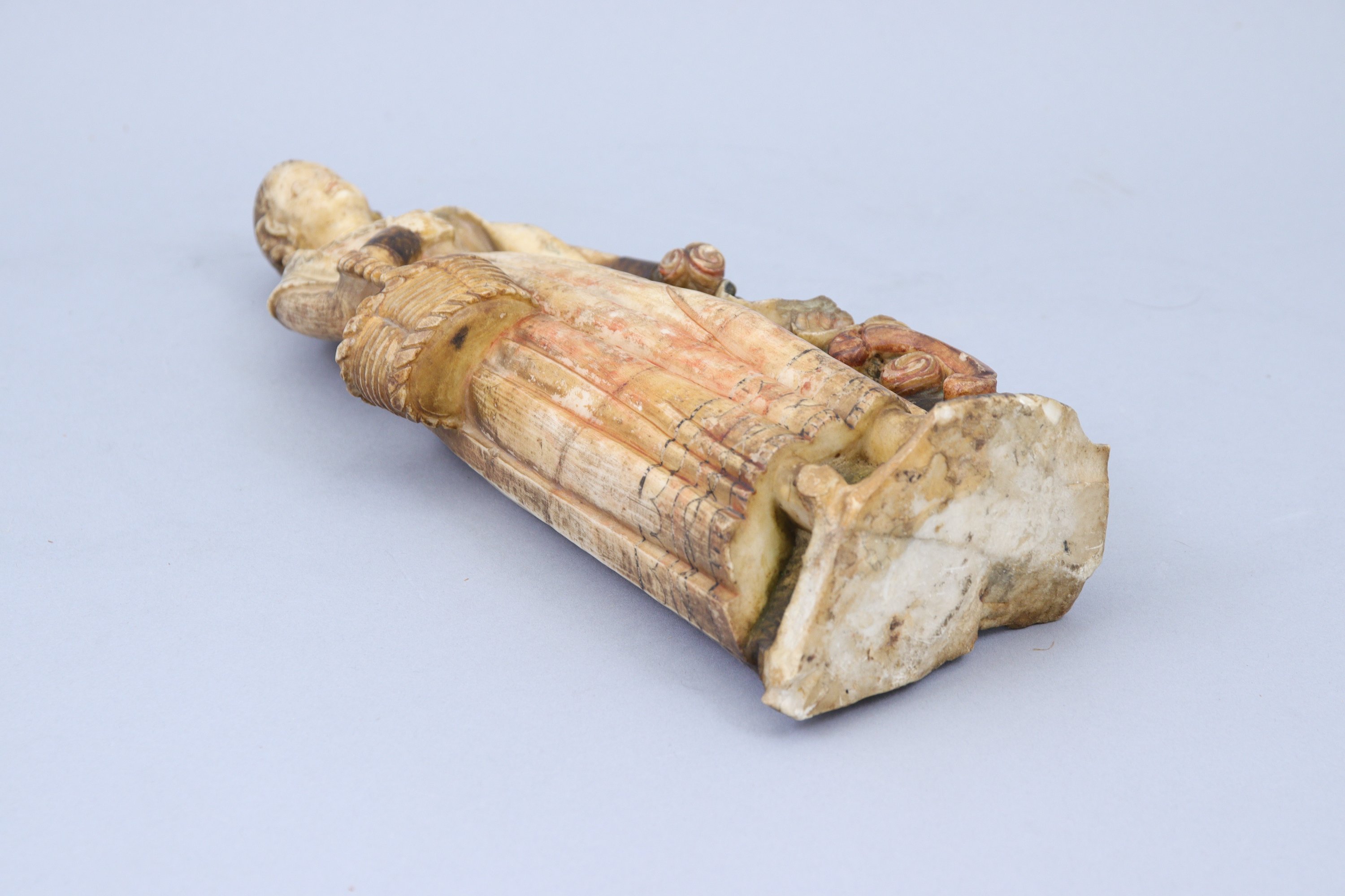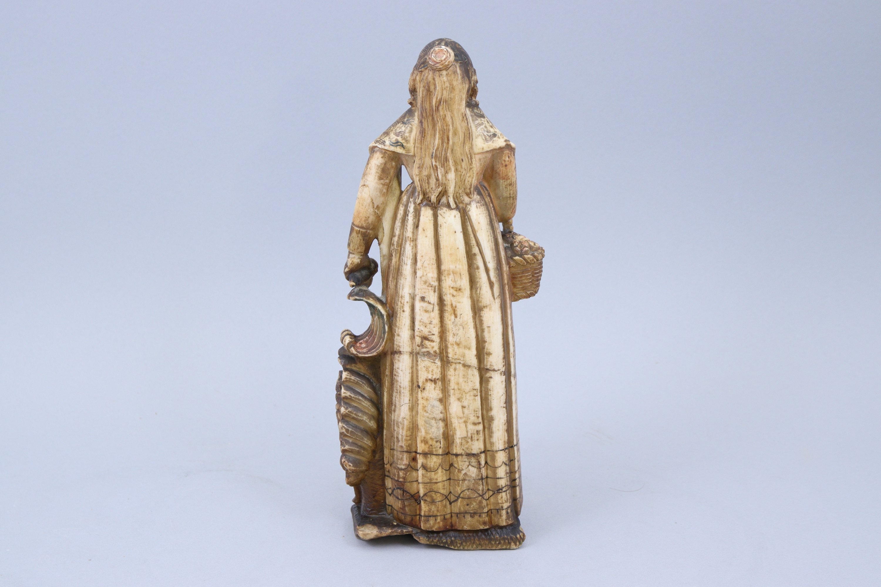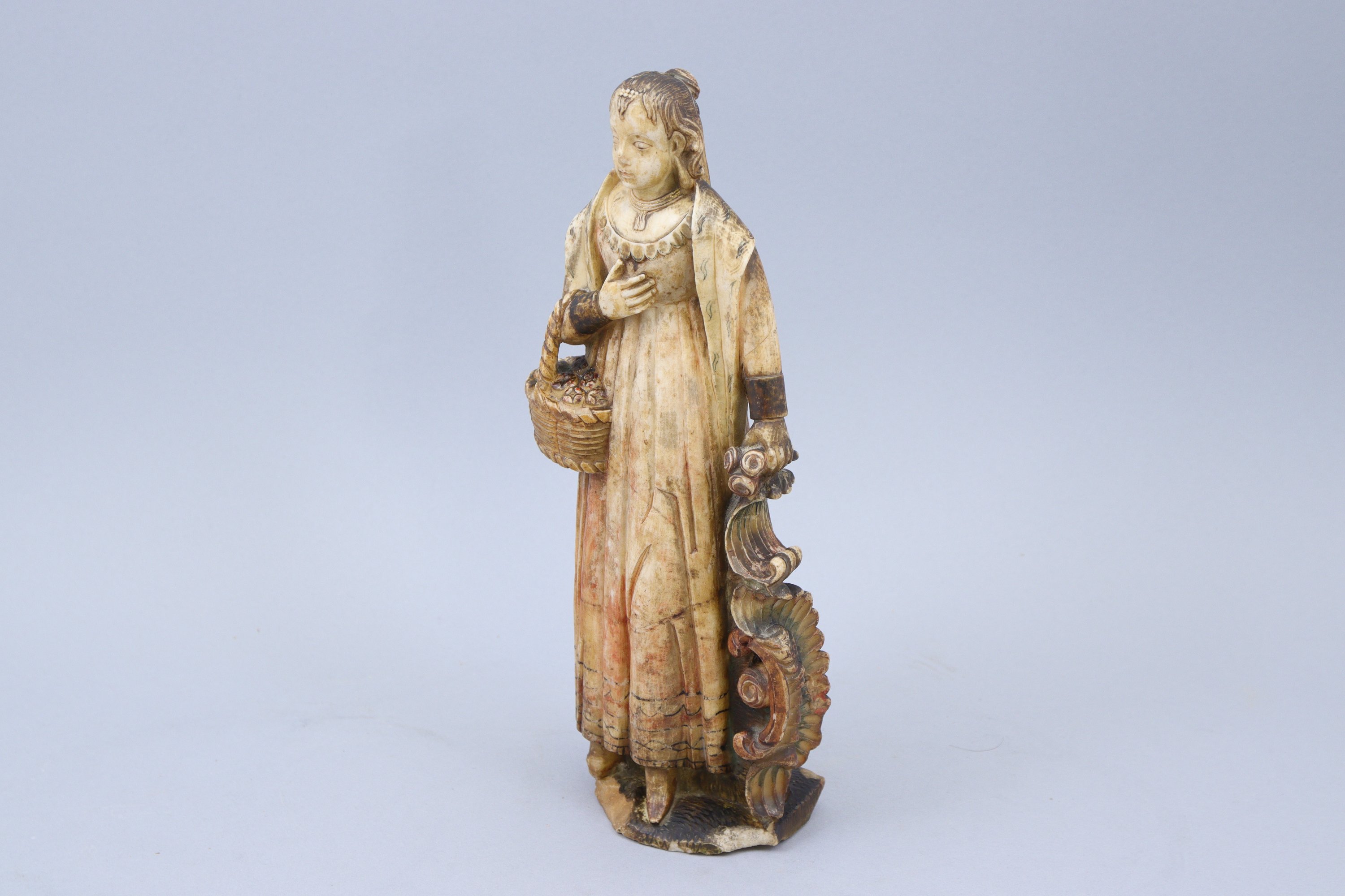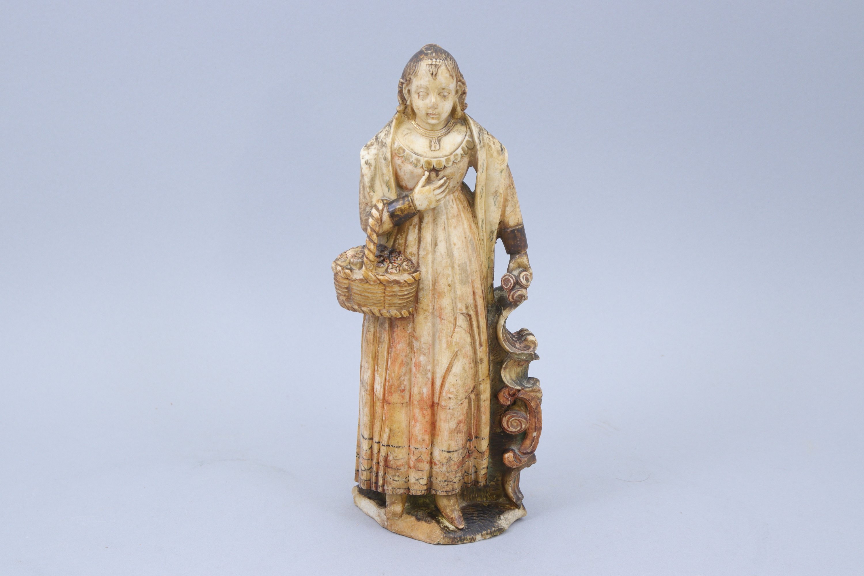 en albâtre teinté?, femme debout portant un panier à son bras droit, un bouquet dans sa main gauche.
