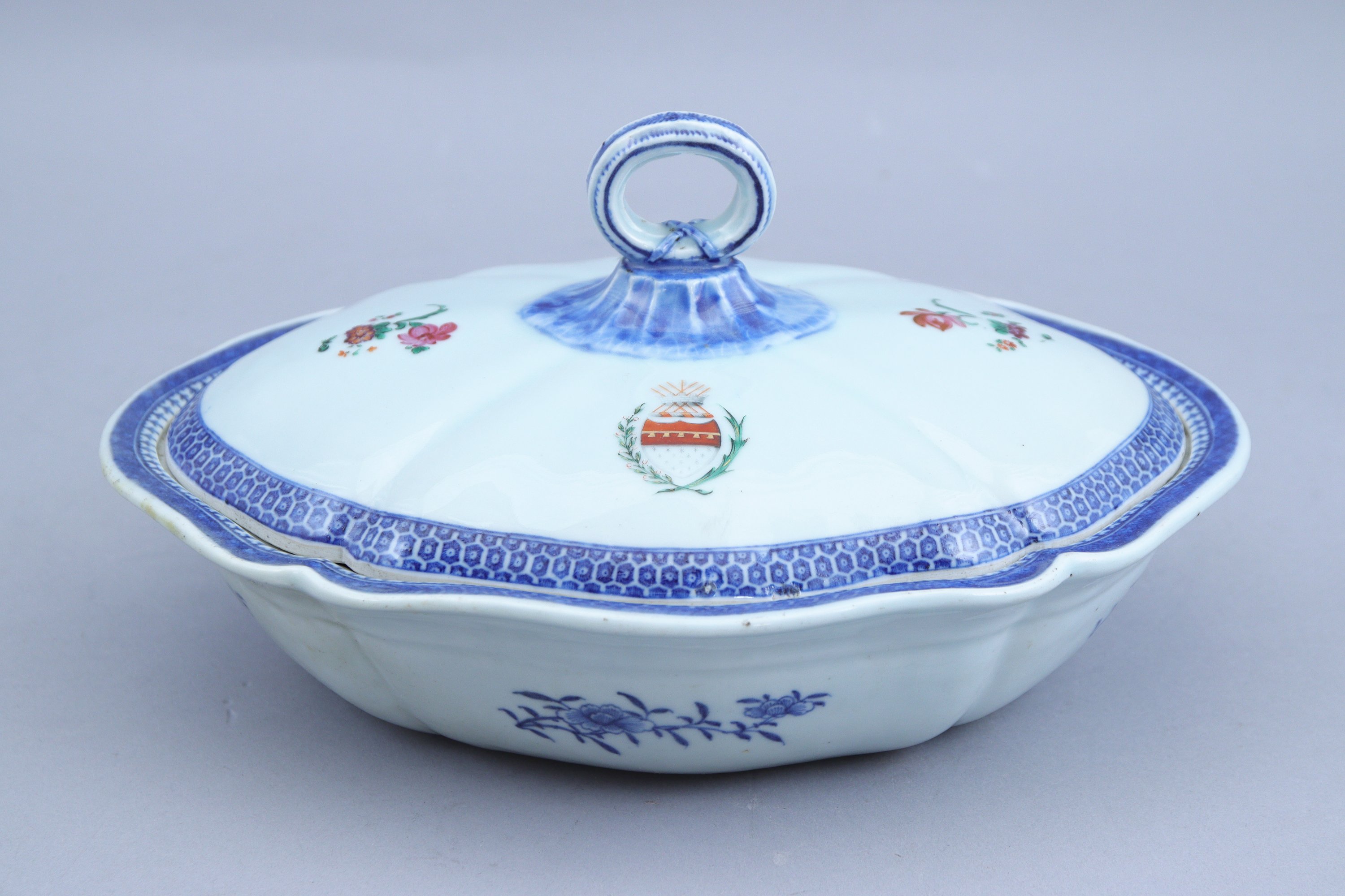 en porcelaine à décor en bleu sous couverte et émaux polychromes. Le fretel à anneau sur une terrasse godronnée. Le couvercle orné d’armoiries et fleurs jetées. La partie inférieure composée de bouquets de fleurs.