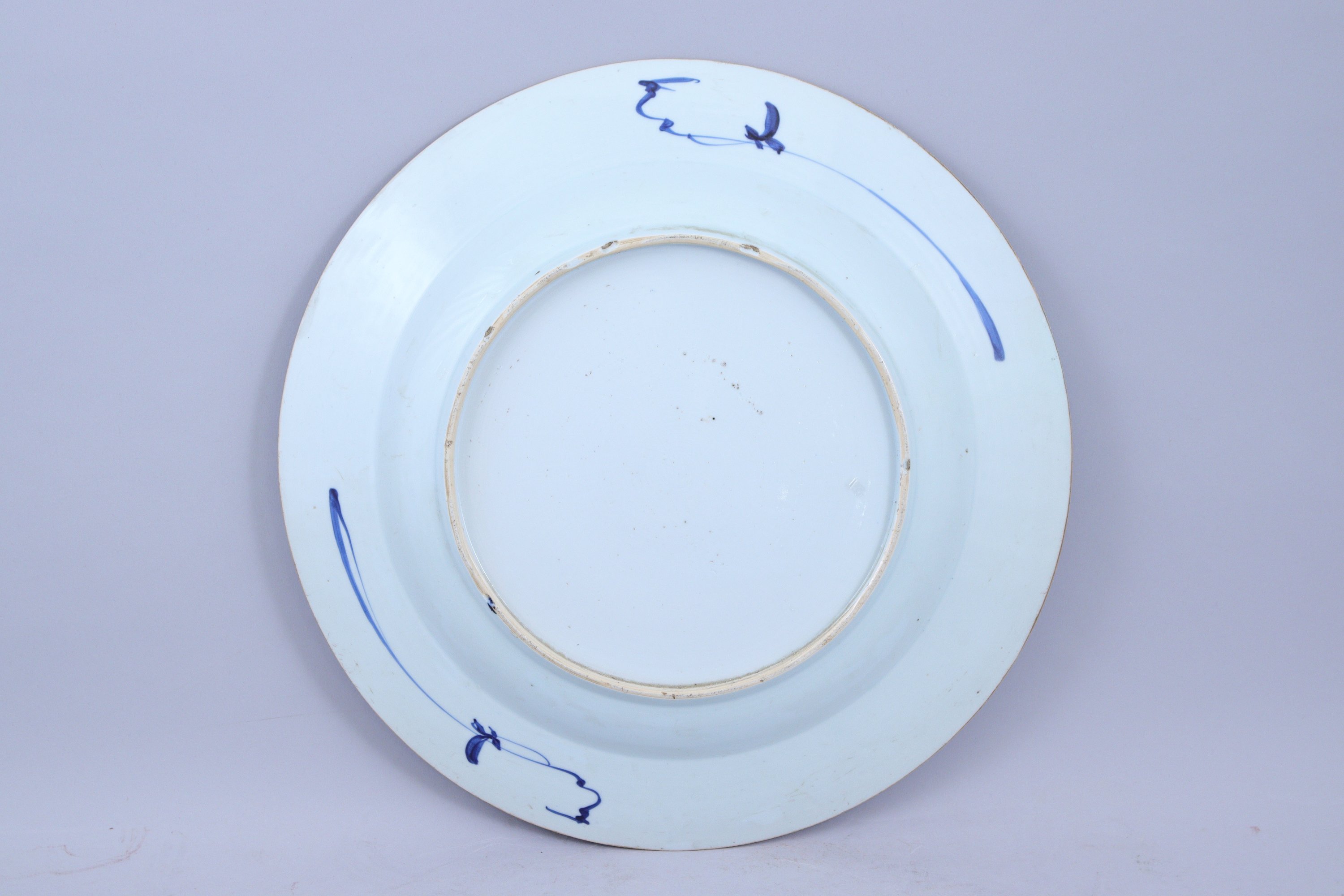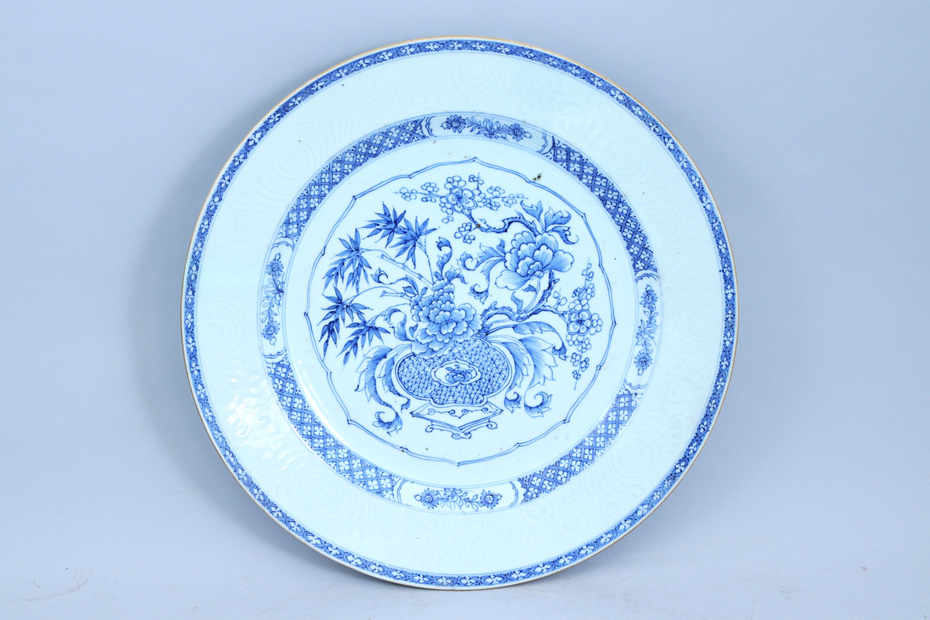 en porcelaine, à décor camaïeu bleu et blanc figurant un vase fleuri de branches de prunier, de bambous et de pivoines, et entouré d'ornements fleuris. Le marli supra bianco.