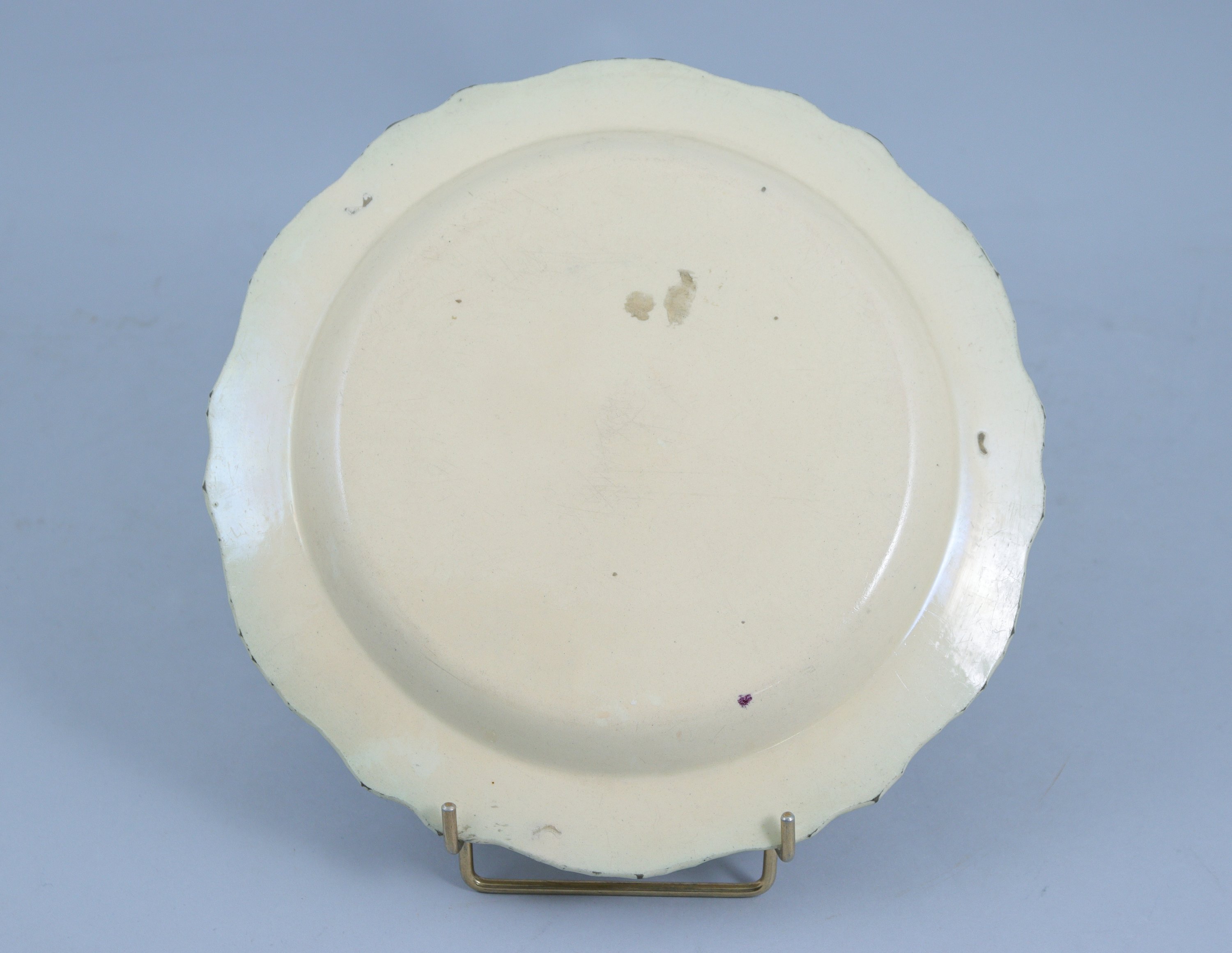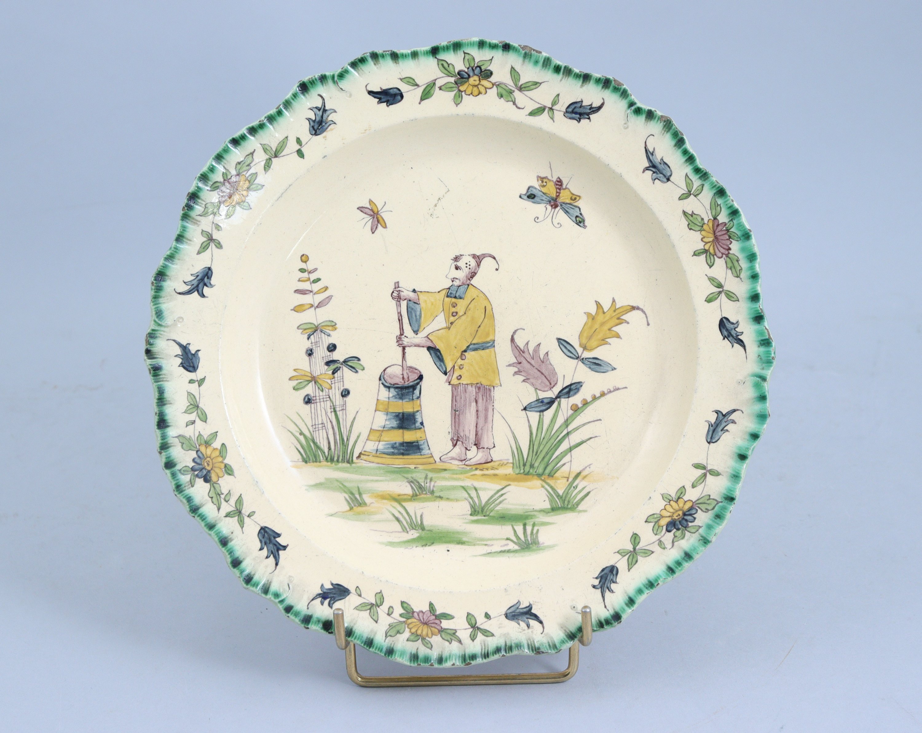 Jointe : assiette en faïence figurant un personnage sinisant et une baratte, dans un décor de végétation et de papillons. Diam. 24 cm.