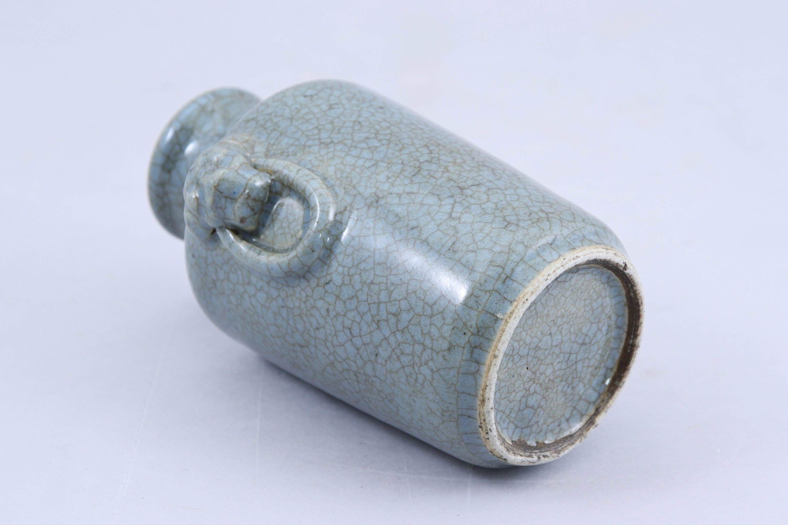 Joint : Chine, XXe siècle. Petit vase en céramique écaillée bleu lavande, dans un coffret en bois et tissu. Haut. 9,5 cm.