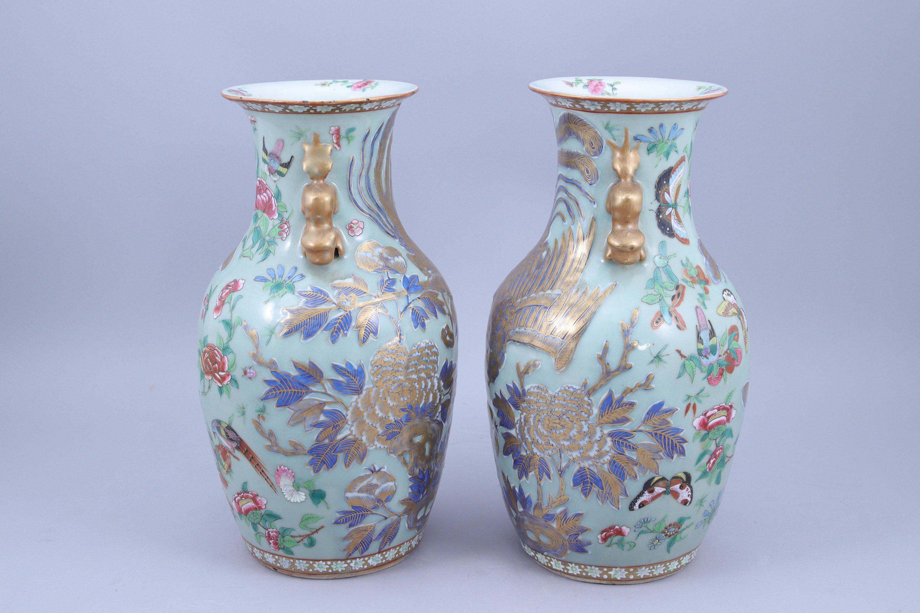 en porcelaine polychrome à décor sur une face de fleurs, oiseaux et papillons, sur l'autre face un phénix.