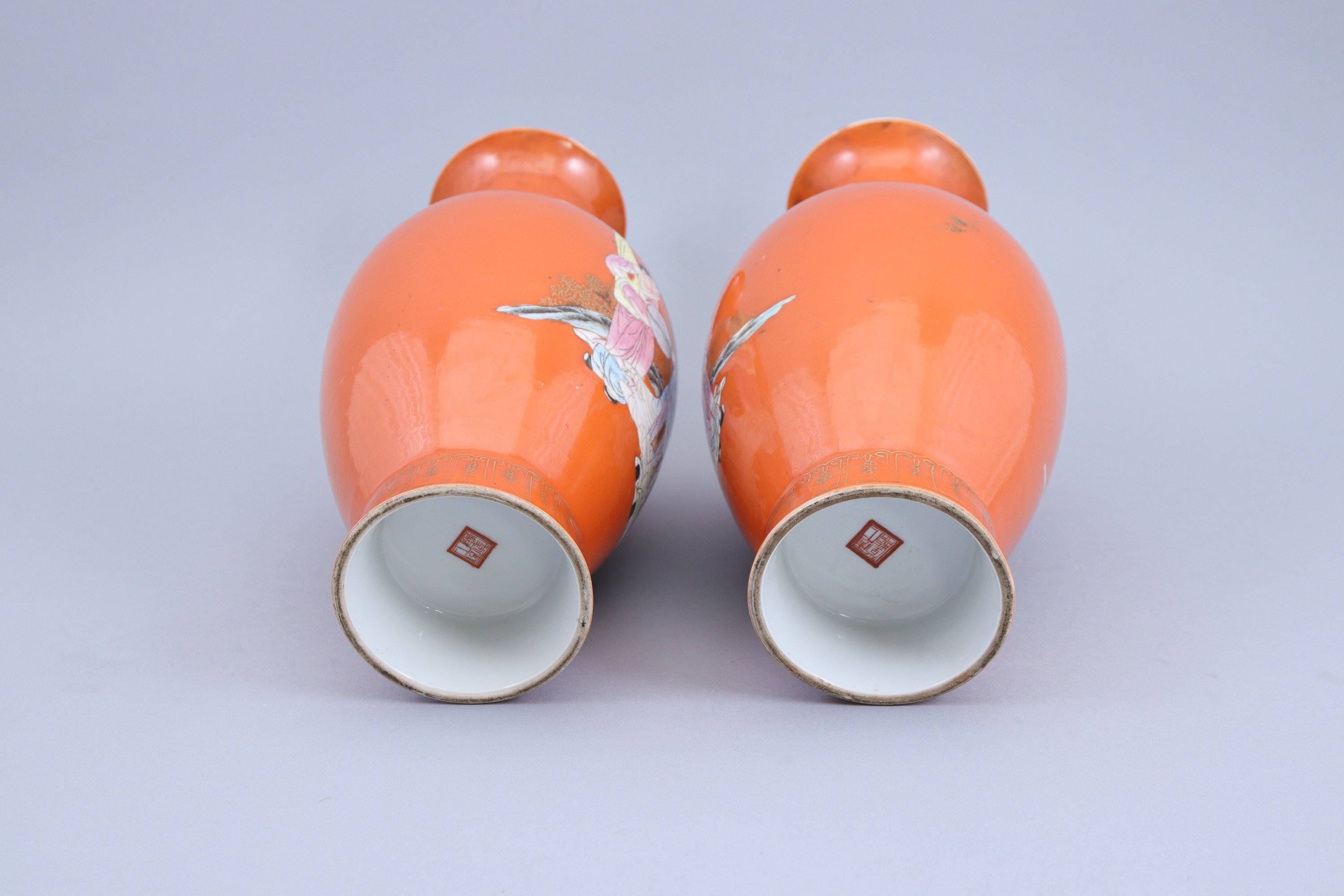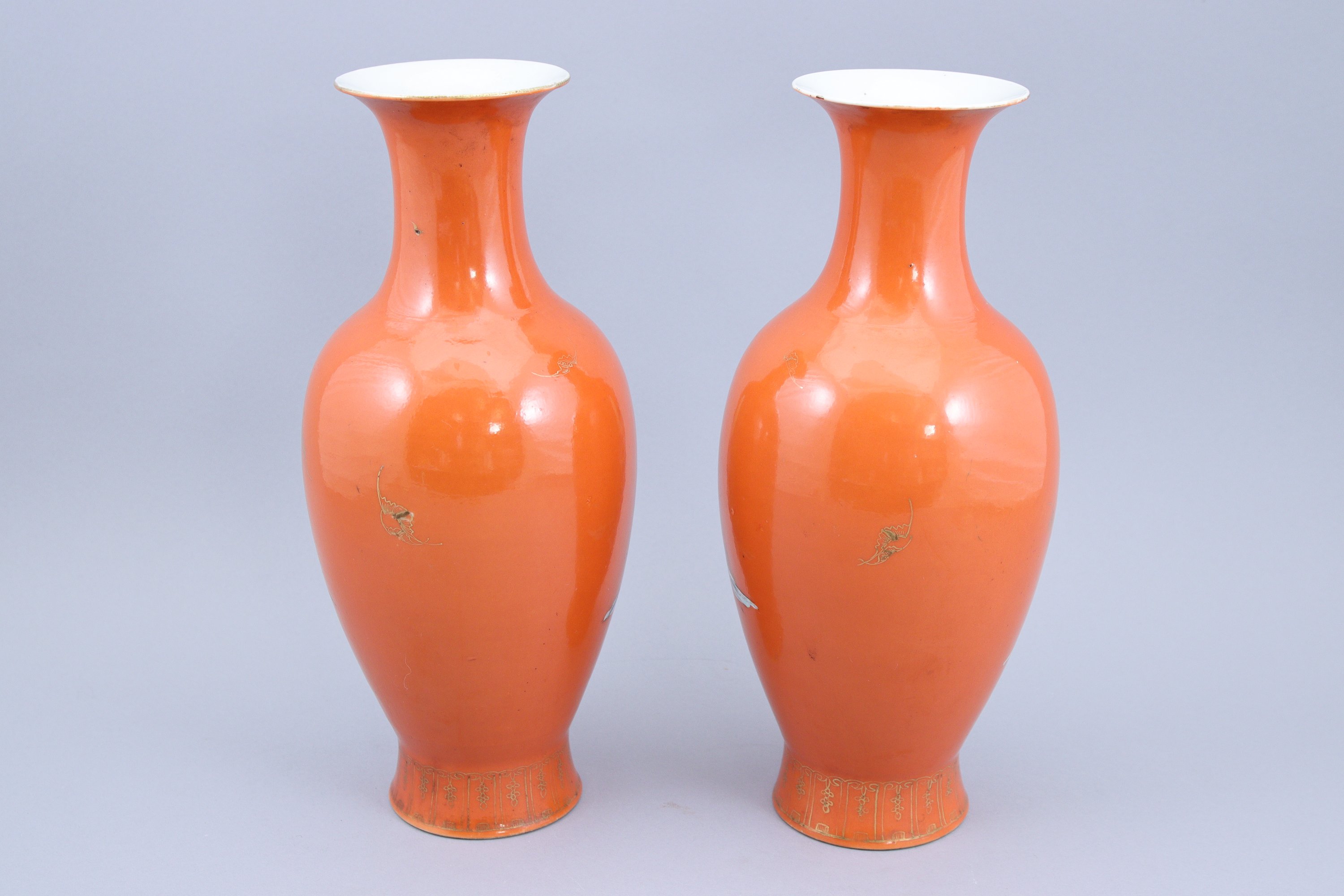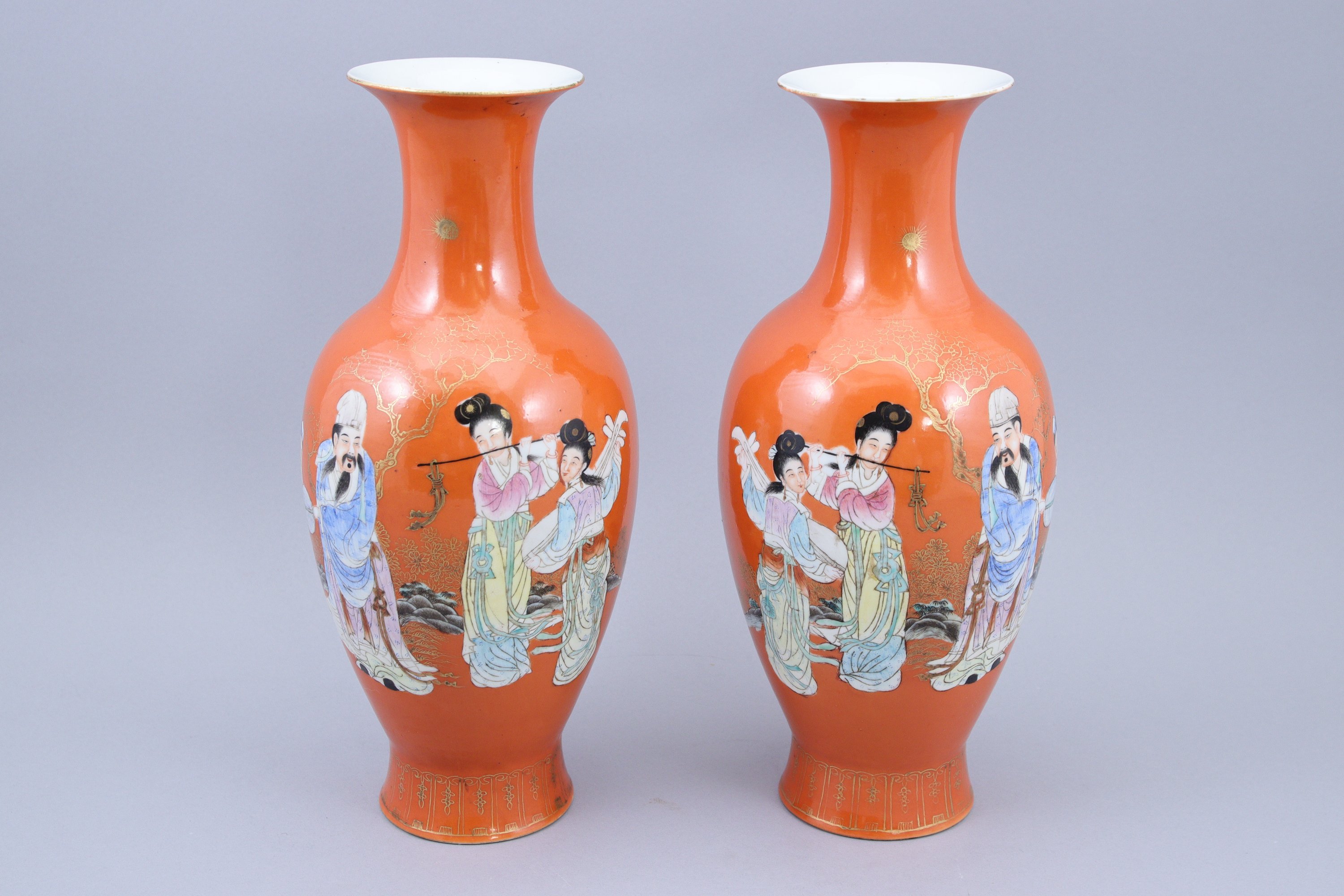en porcelaine émaillée polychrome et or sur fond corail à décor de femmes de cour, l'une tenant un pipa.