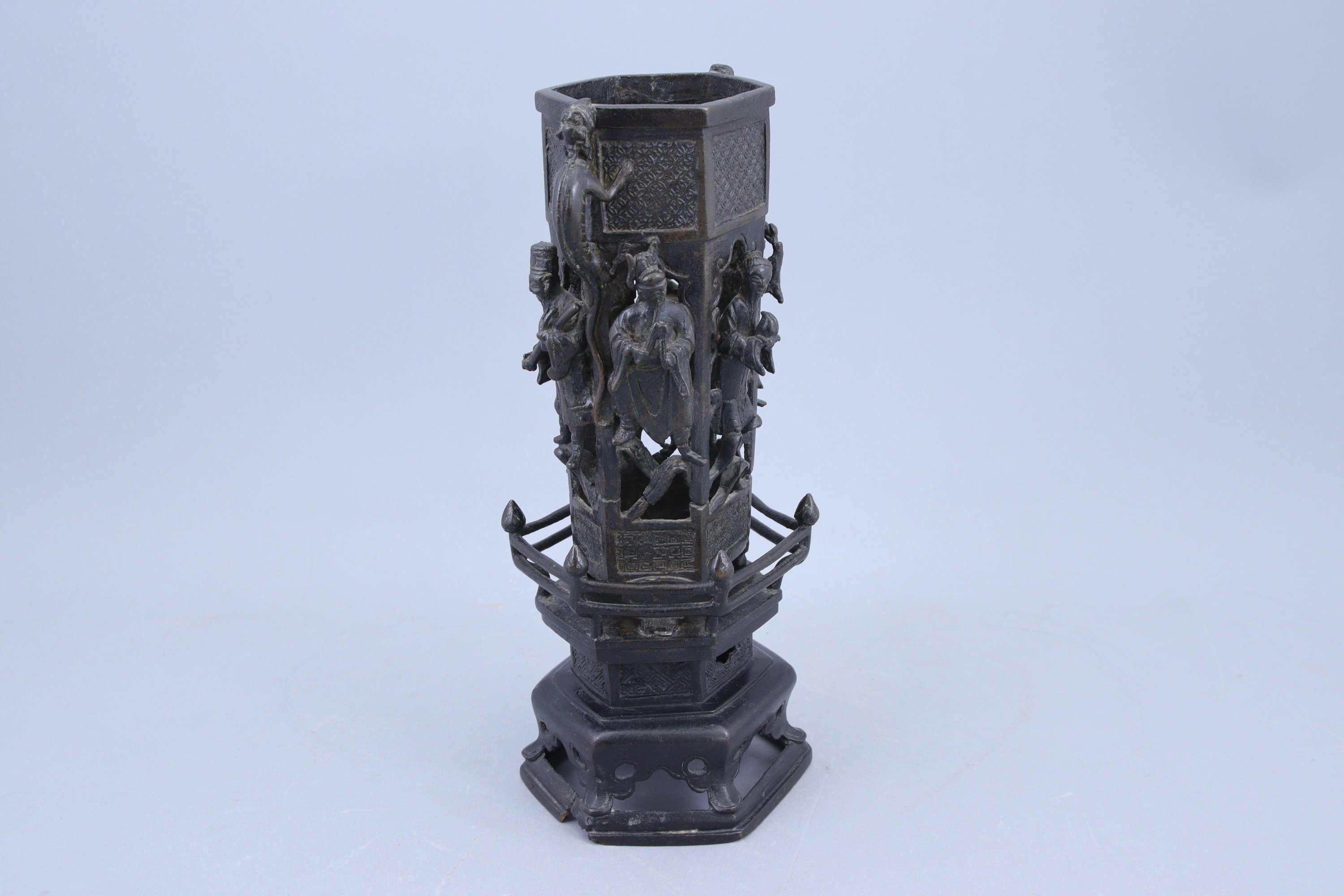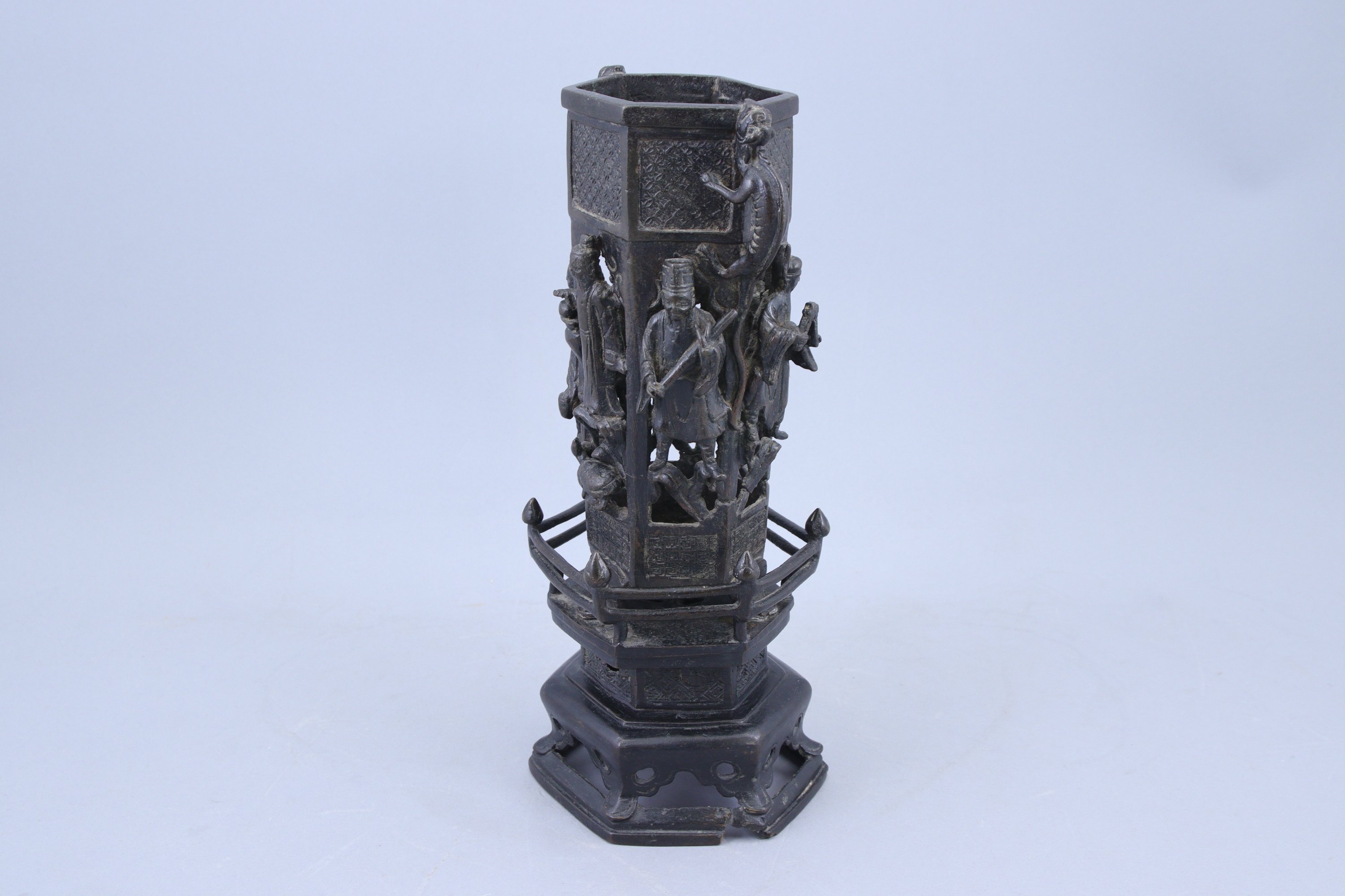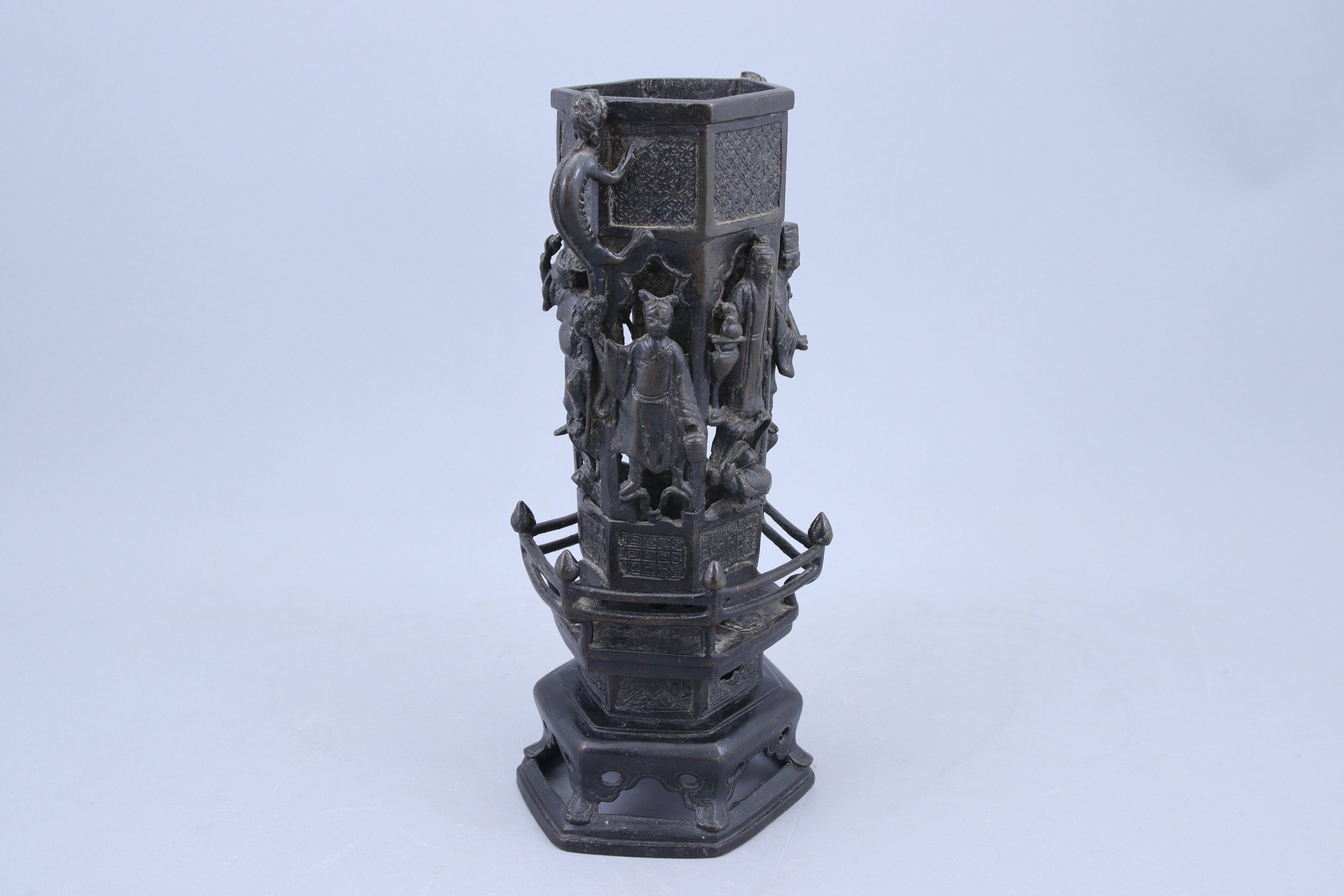 en bronze à patine brune, à décor en relief et ajouré d'immortels debout sur chaque face, chacun tenant un attribut. Les parties supérieures et inférieures ornées de motifs géométriques, deux anses en forme de qilong. Le socle hexagonal reposant sur six pieds.