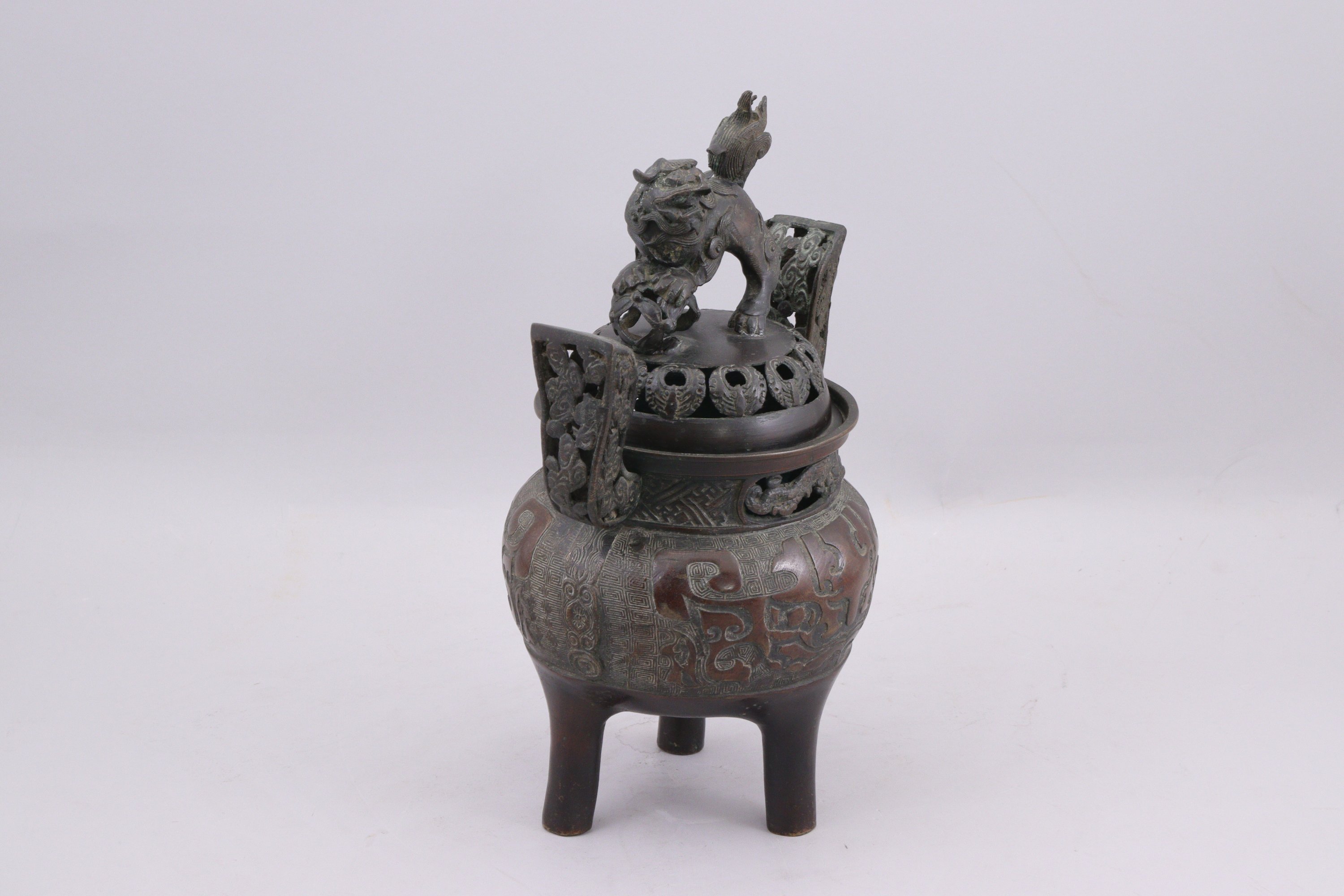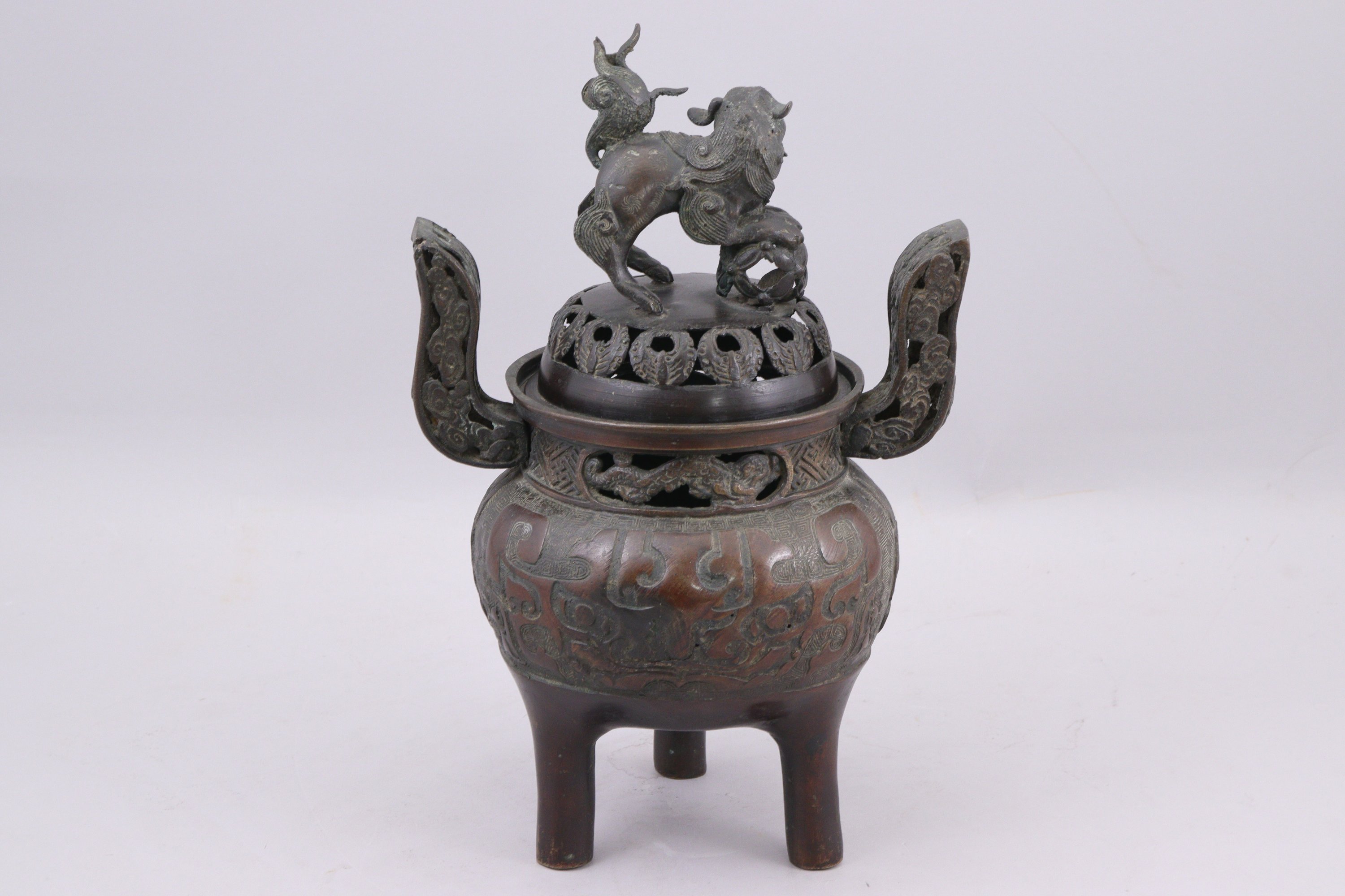 en bronze, motifs de taotié et de leiwen. Le couvercle surmonté d'un chien de fô.