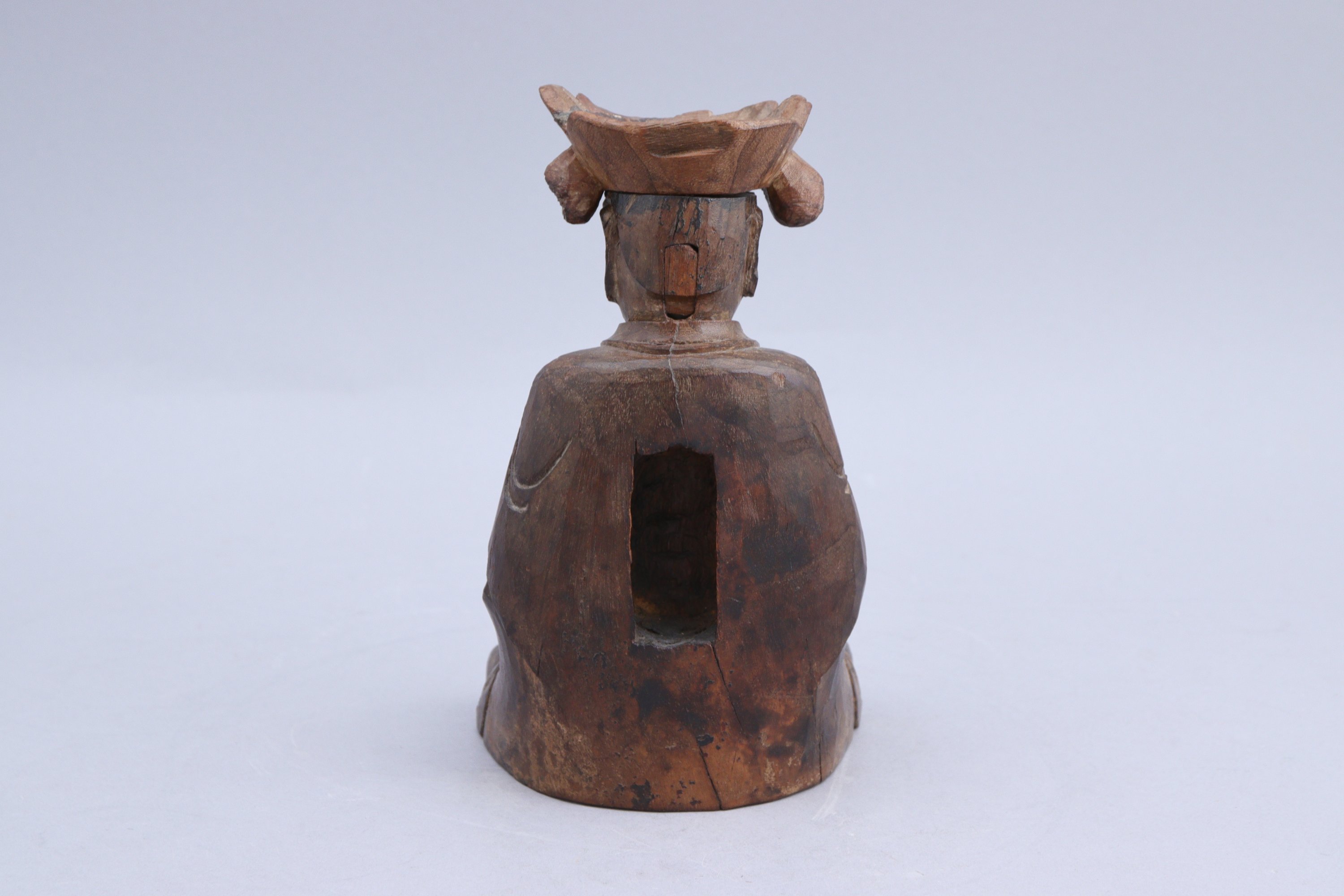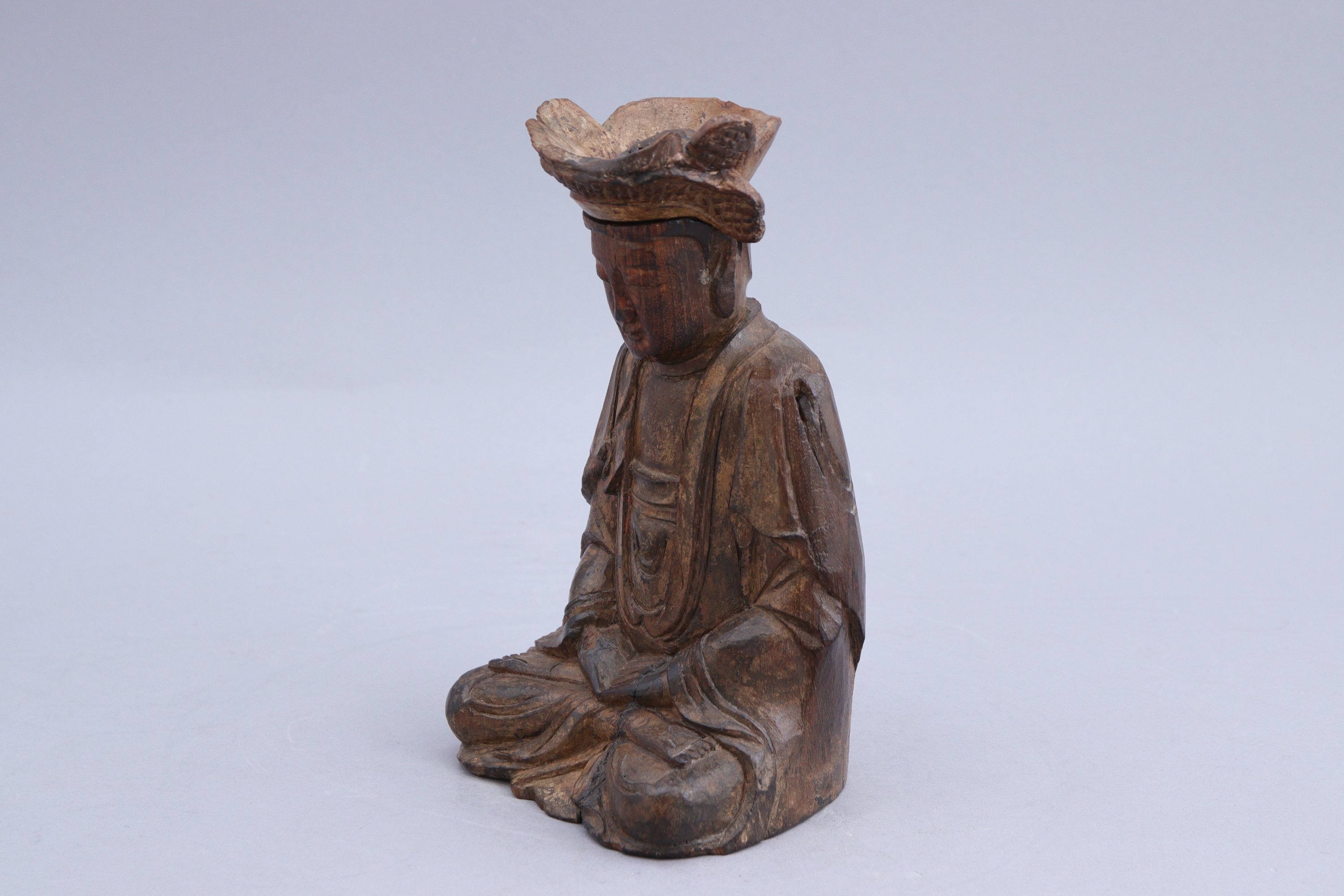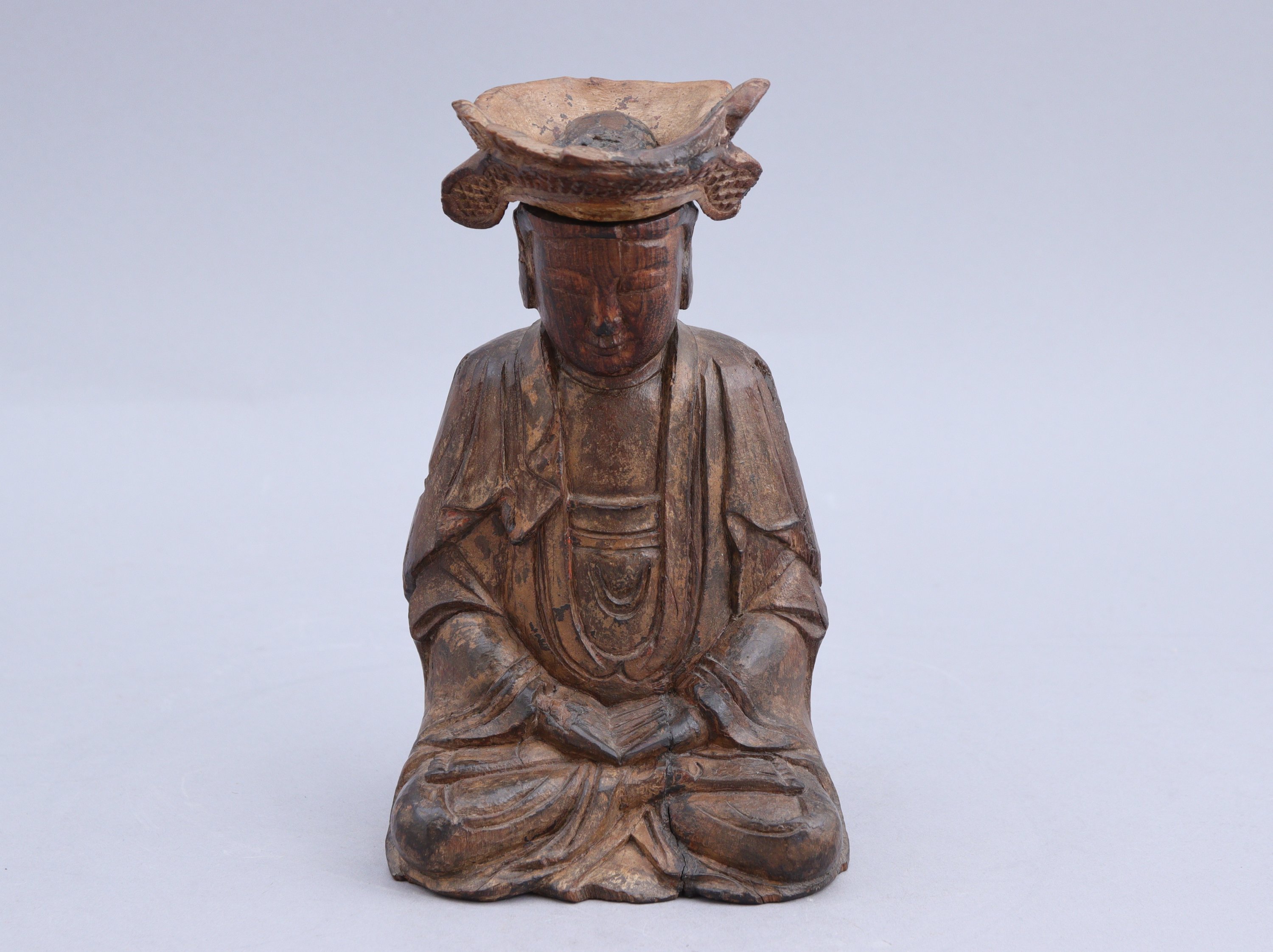en bois à patine brune, assis en padamasana, les mains en dhyana mudra (geste de la méditation).
