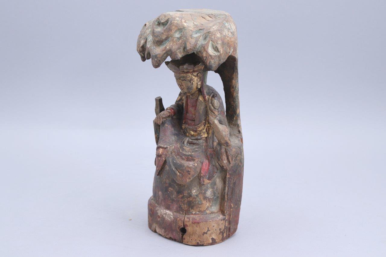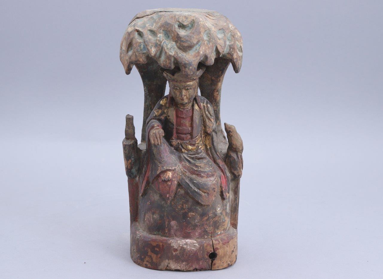 en bois, l'une polychrome assise sous un dais, les deux autres assises sur de hauts socles.