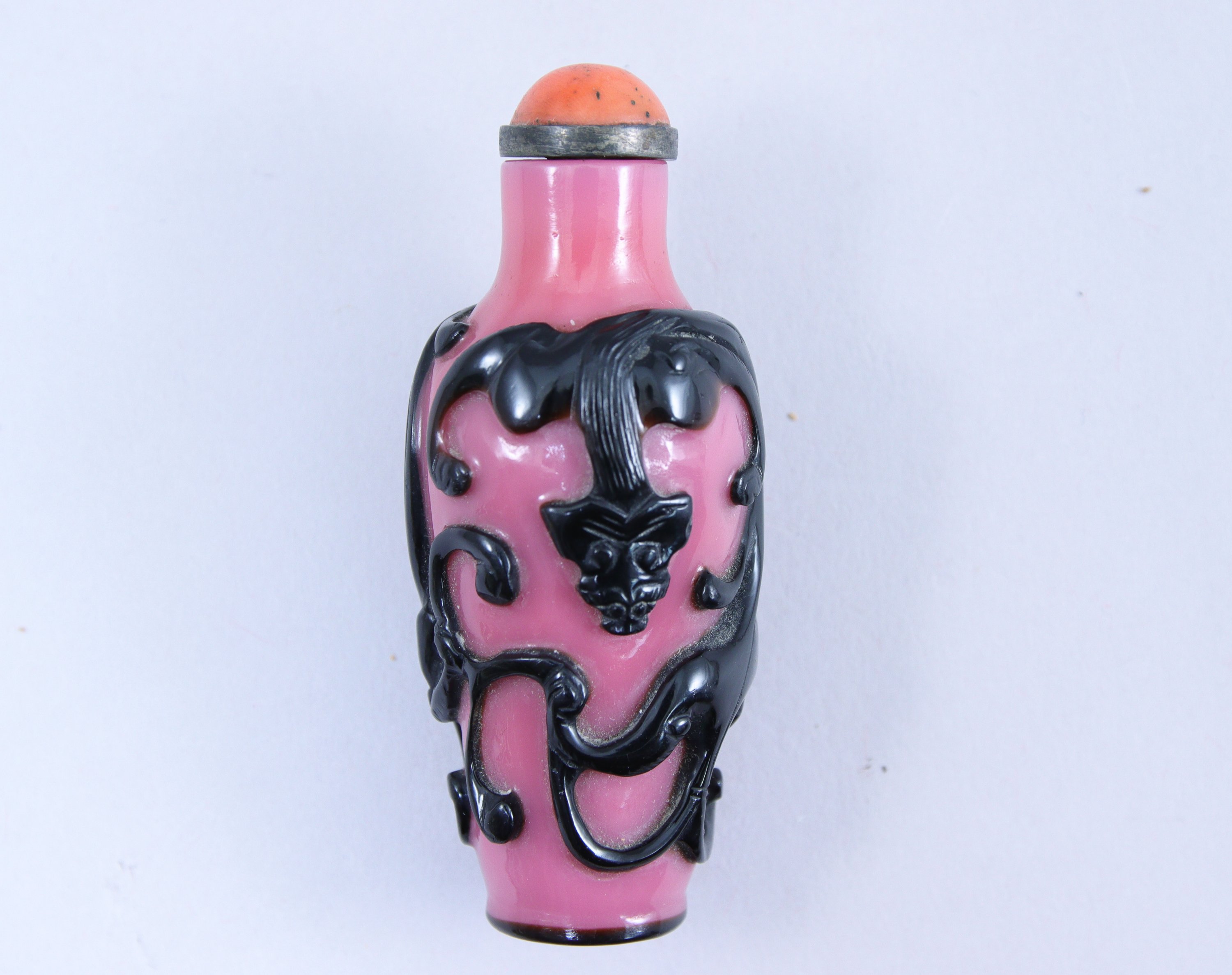 en verre overlay noir sur fond rose opaque, à décor sculpté de deux qilong. Bouchon en corail cerclé de métal.