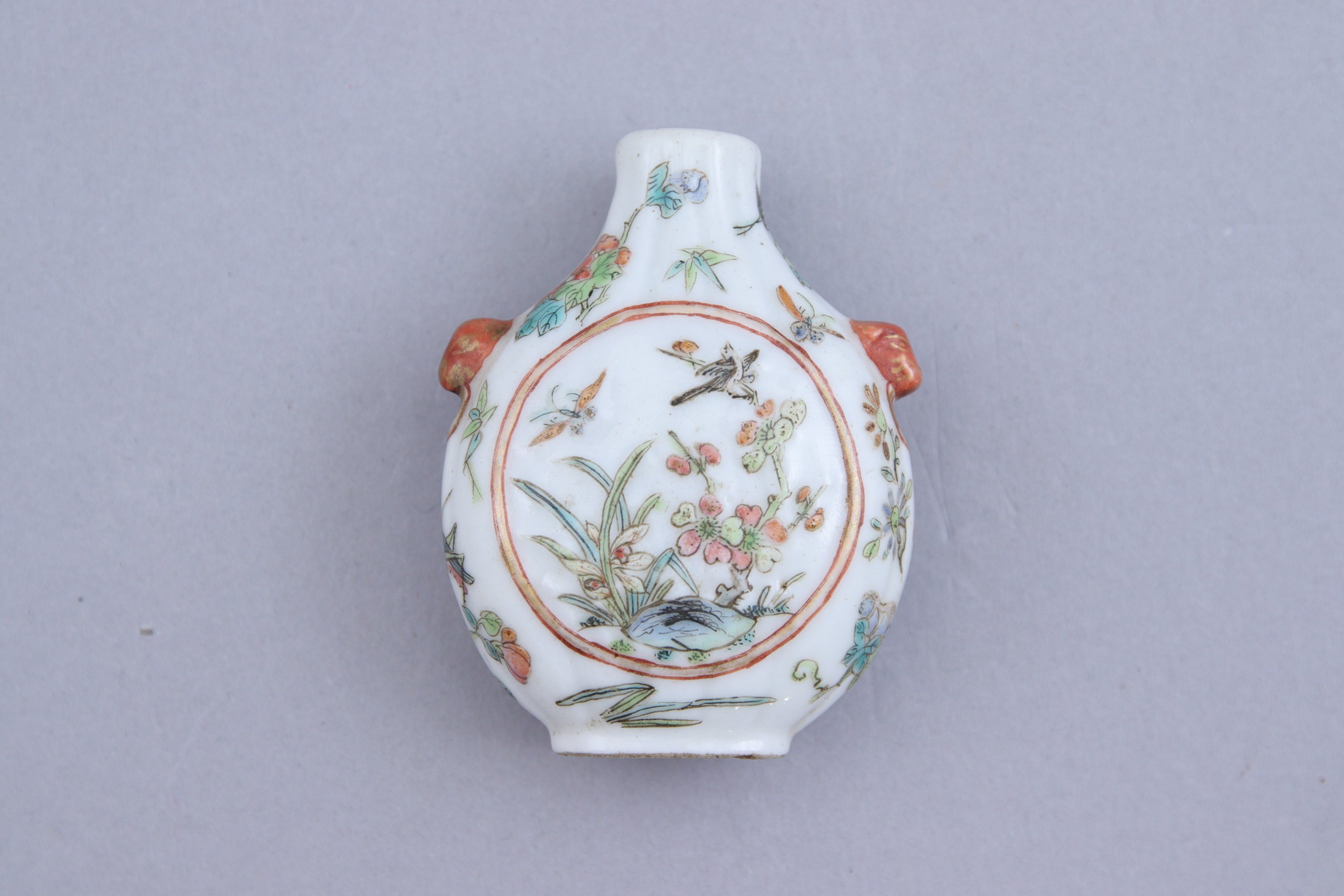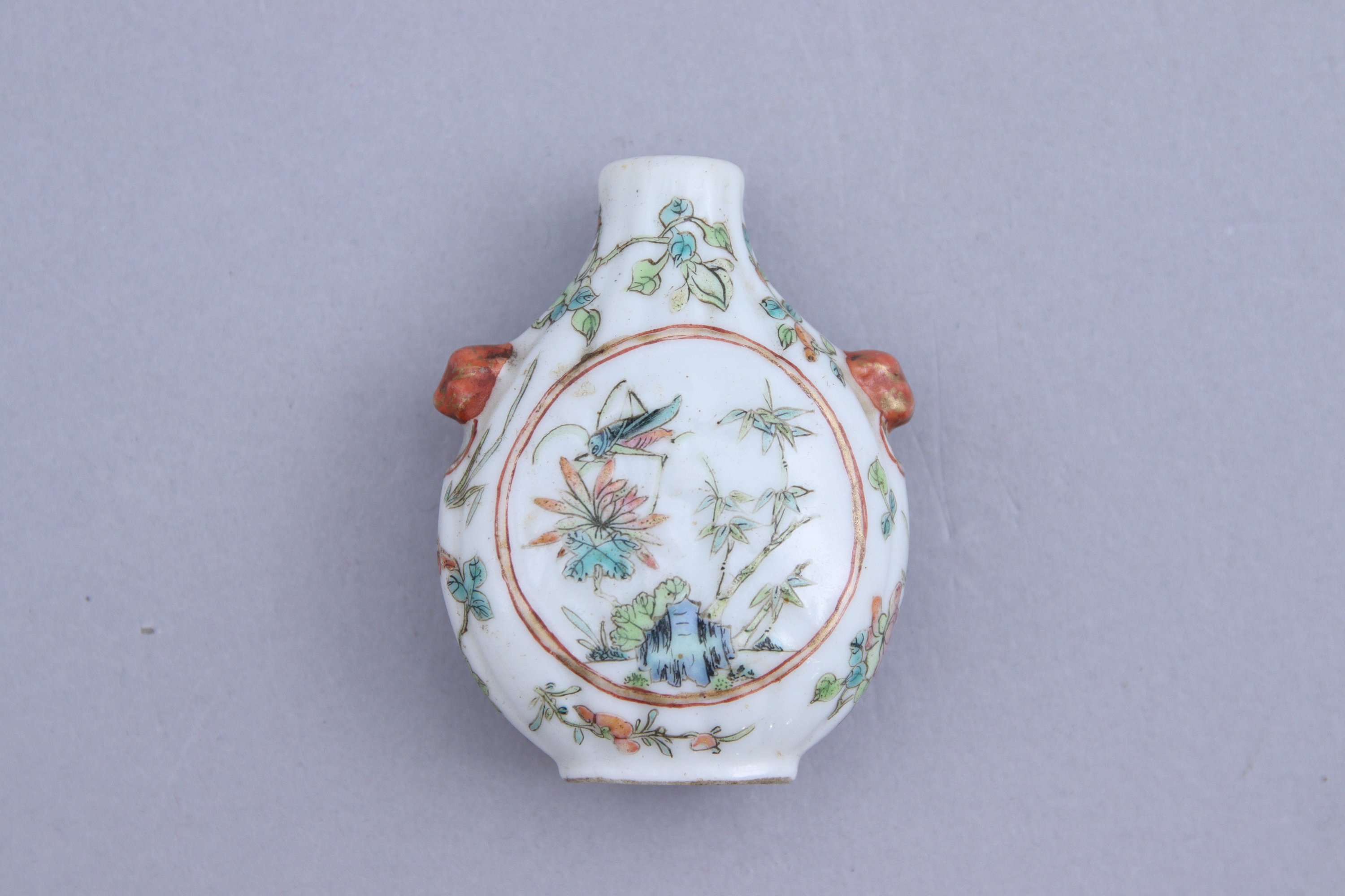 en porcelaine émaillée polychrome de grillon sur un chrysanthème et oiseaux parmi les pivoines. Deux anses en forme de têtes de lions supportant des anneaux.