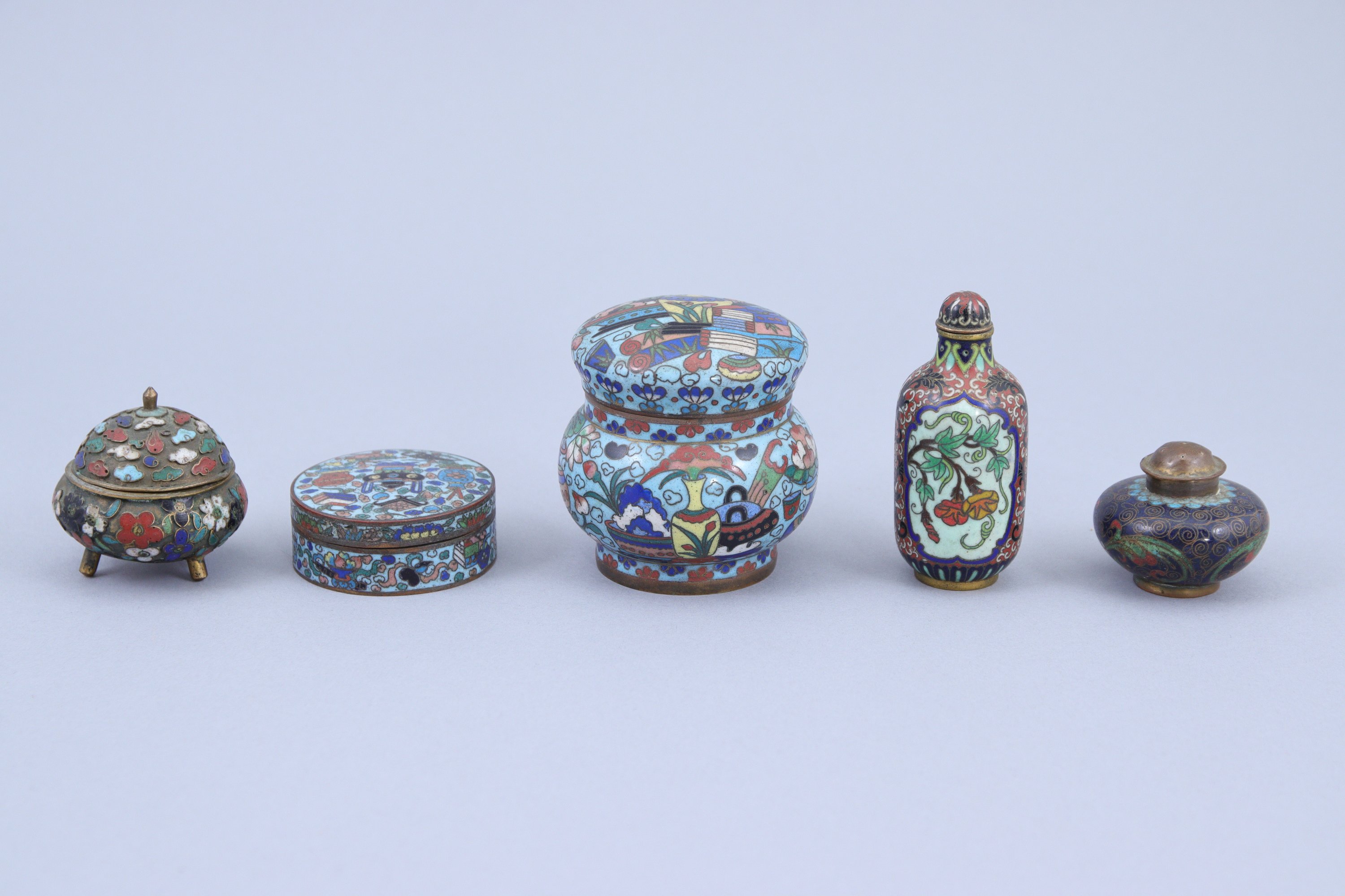 en cuivre et émaux cloisonnés à décor de sujets mobiliers et fleurs.