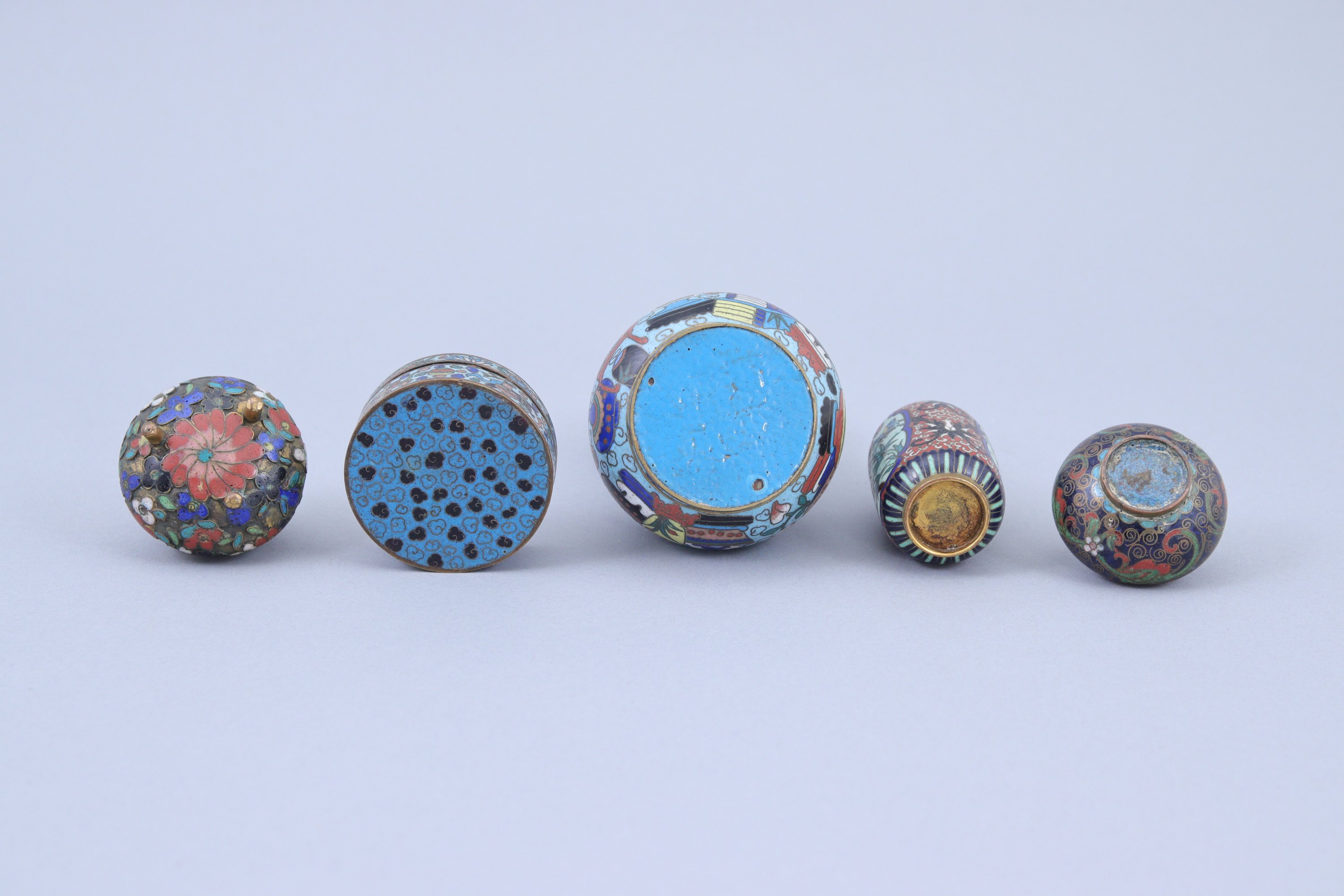 Ensemble comprenant quatre petits pots à tabac et une tabatière cylindrique