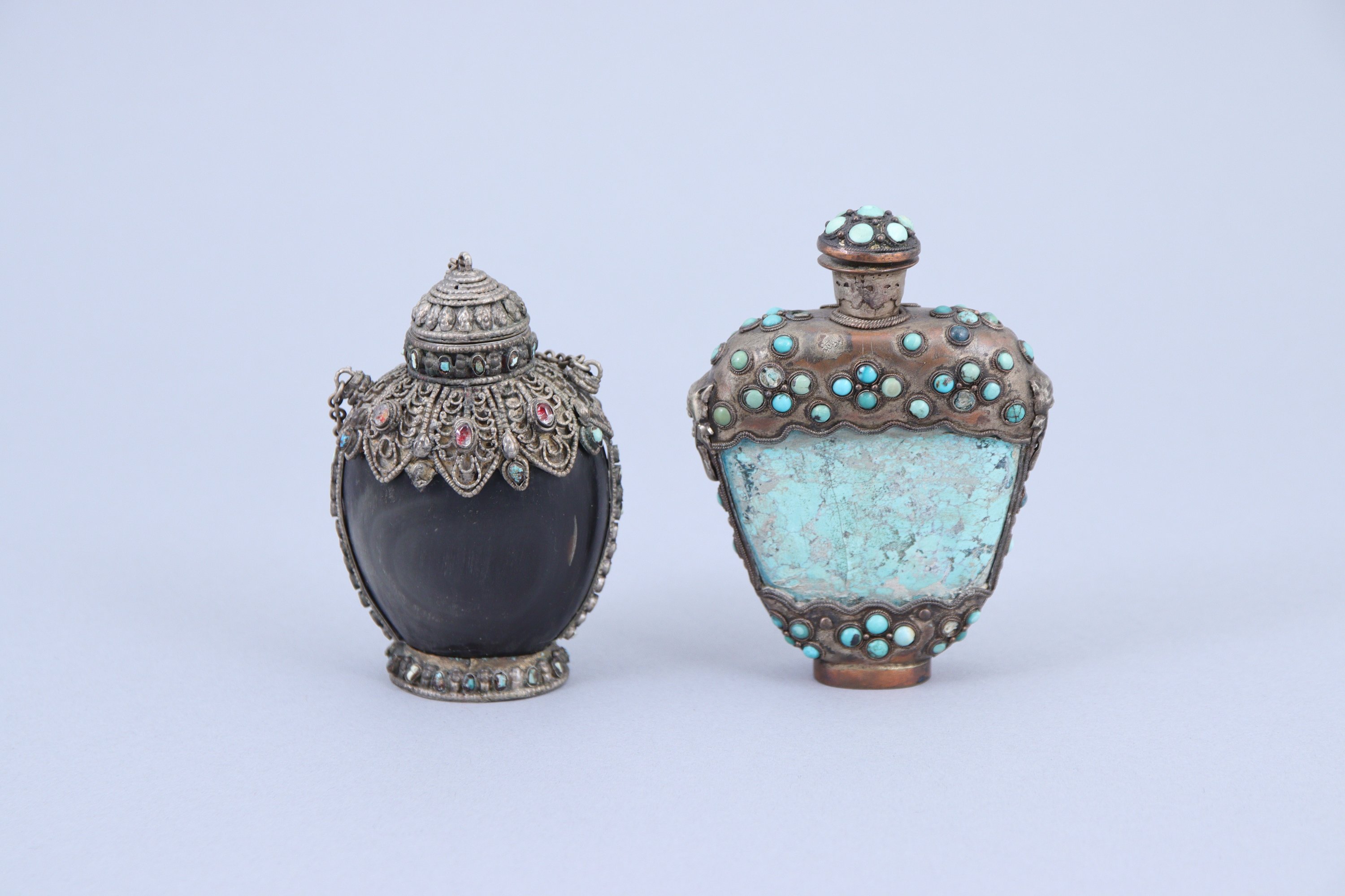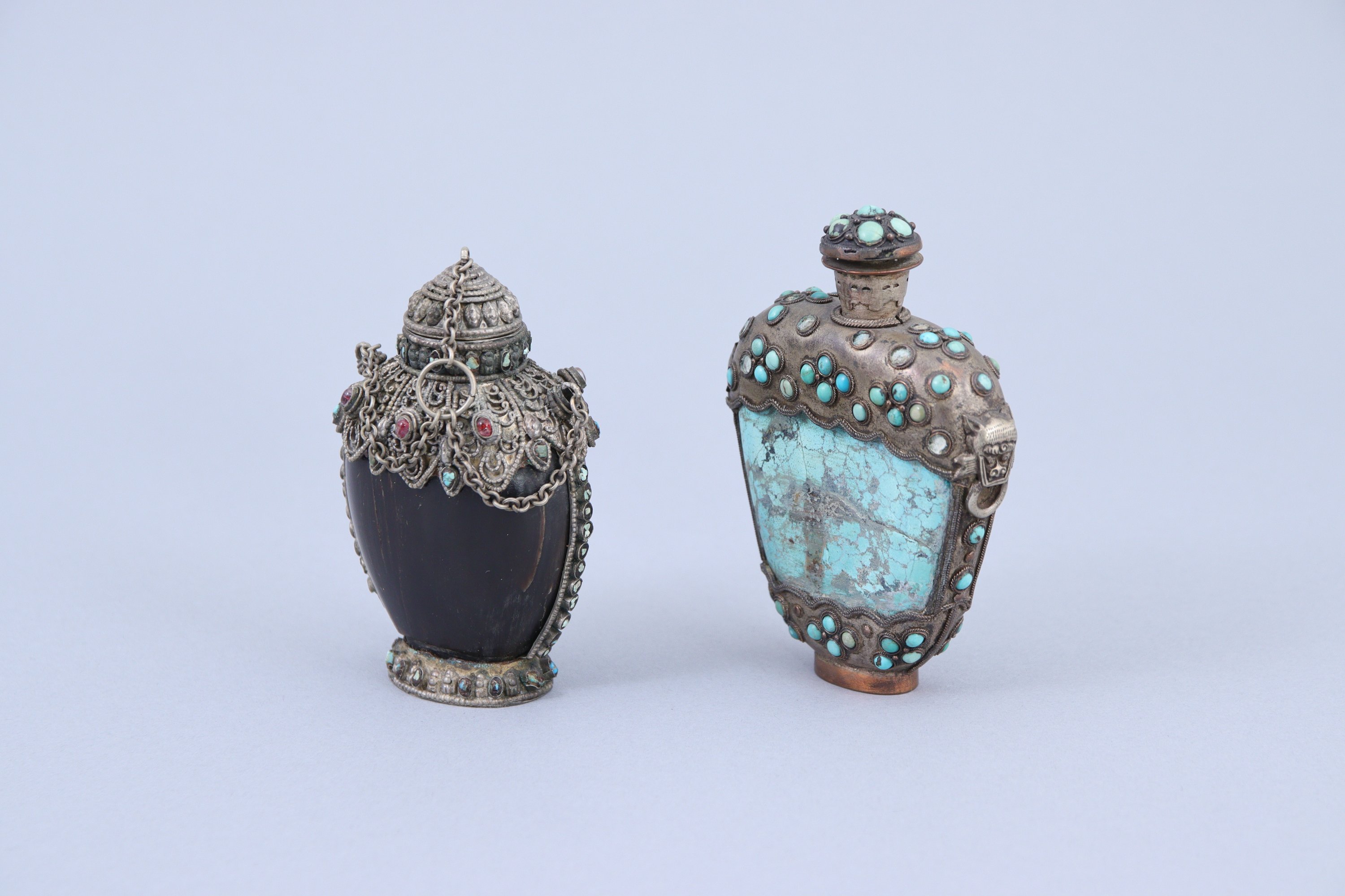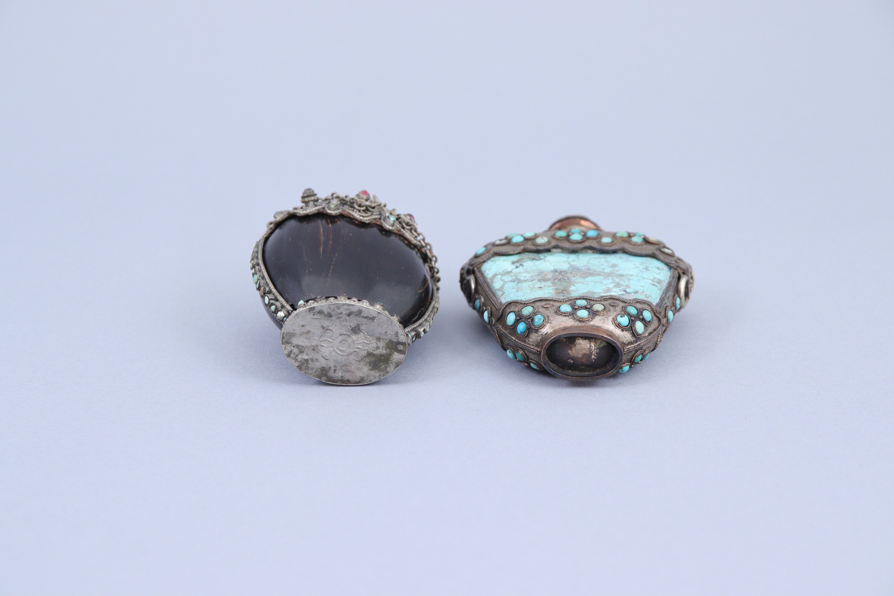montées en métal incrusté de cabochons de turquoise, l'une en corne, l'autre en turquoise.